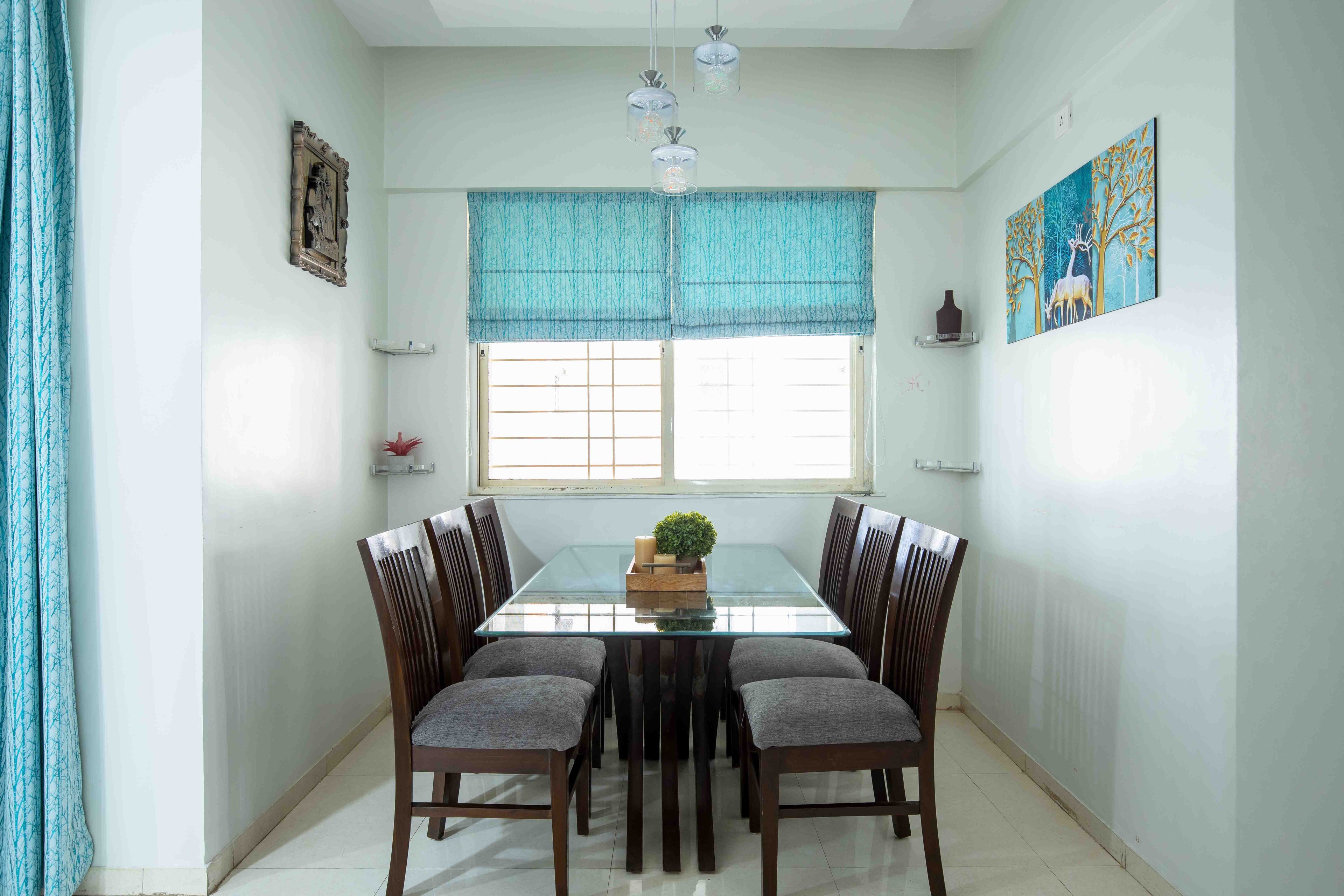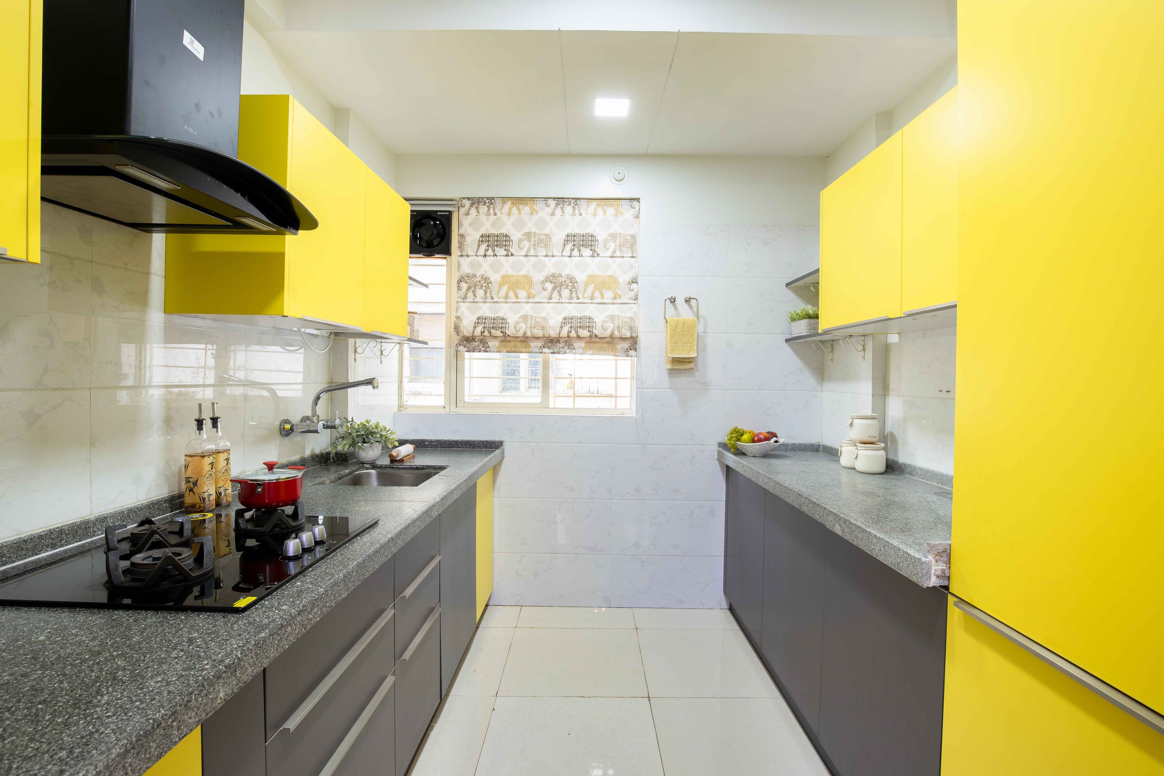 Introducing our stylish 2 BHK flat in Pune, featuring a yellow and grey parallel kitchen design with granite countertops and ample storage cabinets. The living room boasts a teal L-shaped sofa and white TV unit with vintage-themed wallpaper. Enjoy meals in the compact 6-seater dining room made of wood and glass countertop, while the lavender and white bedroom offers a serene retreat with abstract wallpaper and a dark grey sliding wardrobe. The pink kid's bedroom features butterfly wallpaper, a study table, and a pink wardrobe, making this the perfect home for families seeking both comfort and style.