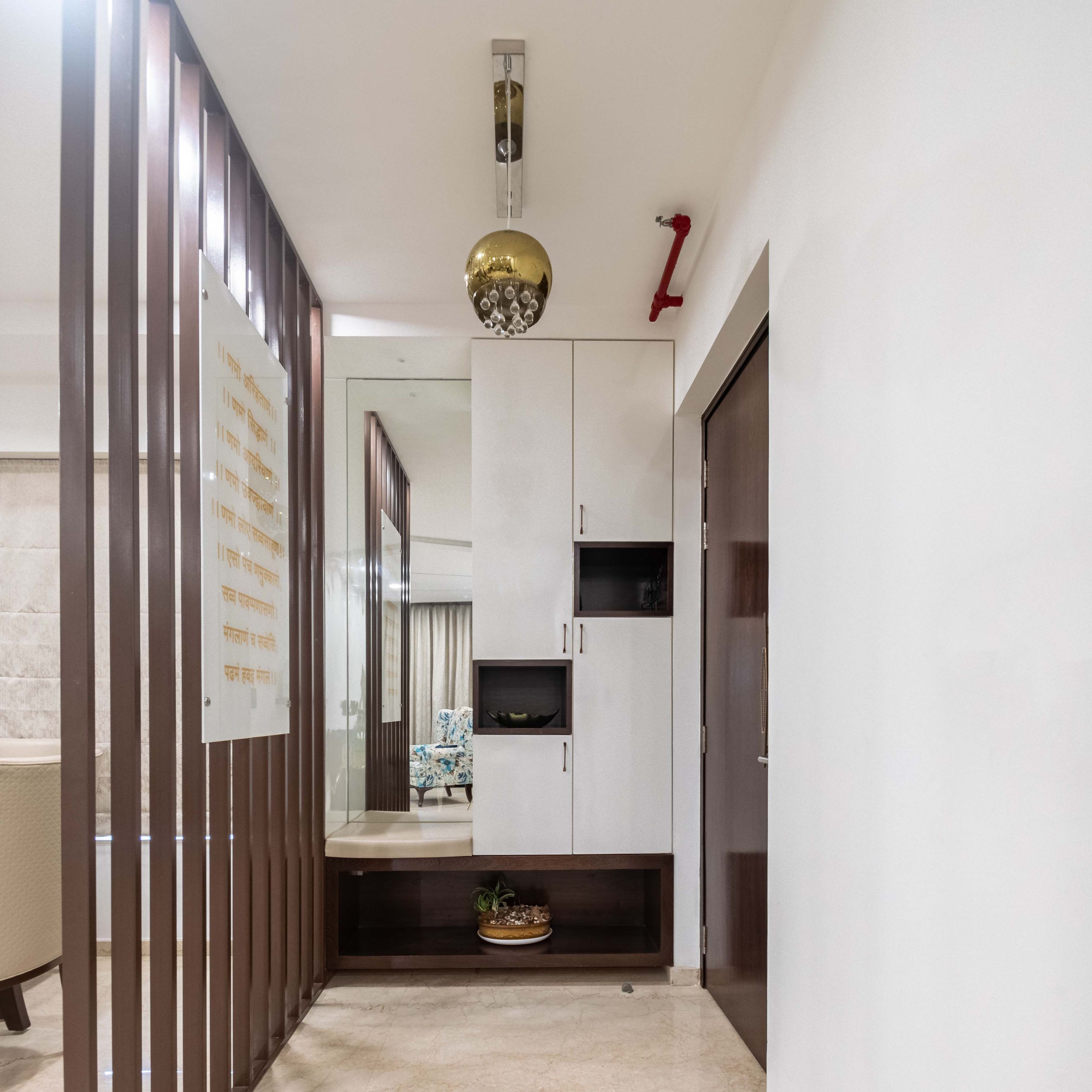 The highlight of this flat is a beige accent wall adorned with tasteful wall decor. Additionally, a stunning white and abstract multi-colored home office design with a white storage unit provides a dedicated space for work and creativity. The compact wood and white foyer design welcomes you into this stylish residence. Experience the perfect blend of aesthetics and functionality in this meticulously designed 2-BHK flat. Embrace a sophisticated lifestyle in the heart of Mumbai, where every space is thoughtfully crafted to elevate your living experience.