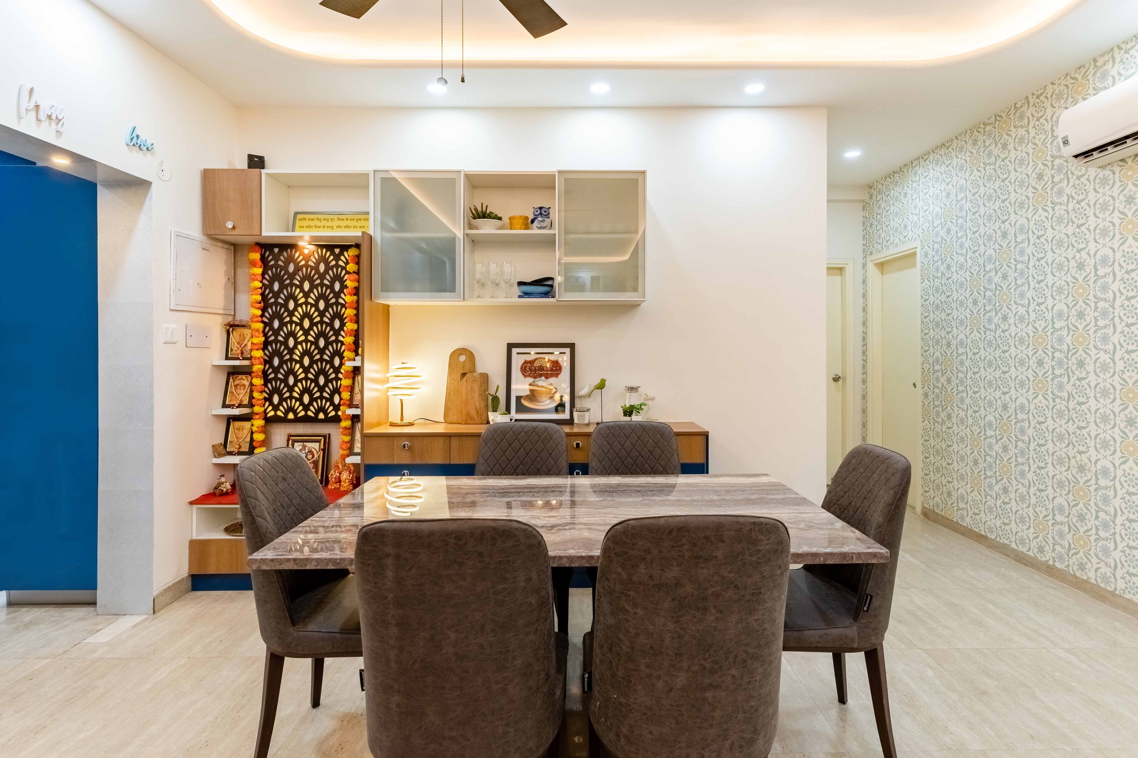 Introducing our stunning flat, where impeccable design meets comfort and style. The straight kitchen boasts a captivating blue and white color scheme, complemented by a mosaic backsplash, creating a vibrant and modern culinary space. Step into the blue living room, adorned with yellow pouffes and a wooden TV unit design. The nature-inspired wallpaper featuring cacti adds a unique focal point to the room. Gather around the 6-seater marble dining table, accompanied by brown chairs, a study table, and a compact open pooja unit, creating a functional and elegant dining area. Retreat to the spacious master bedroom, featuring light wooden flooring, wooden furniture, and nature-inspired wallpaper, providing a tranquil oasis for relaxation. The second bedroom showcases a tropical white and grey wallpaper and a brown wardrobe, adding a touch of sophistication to the space. Embrace the beauty and functionality of this exceptional flat, where every detail has been carefully curated to enhance your living experience.