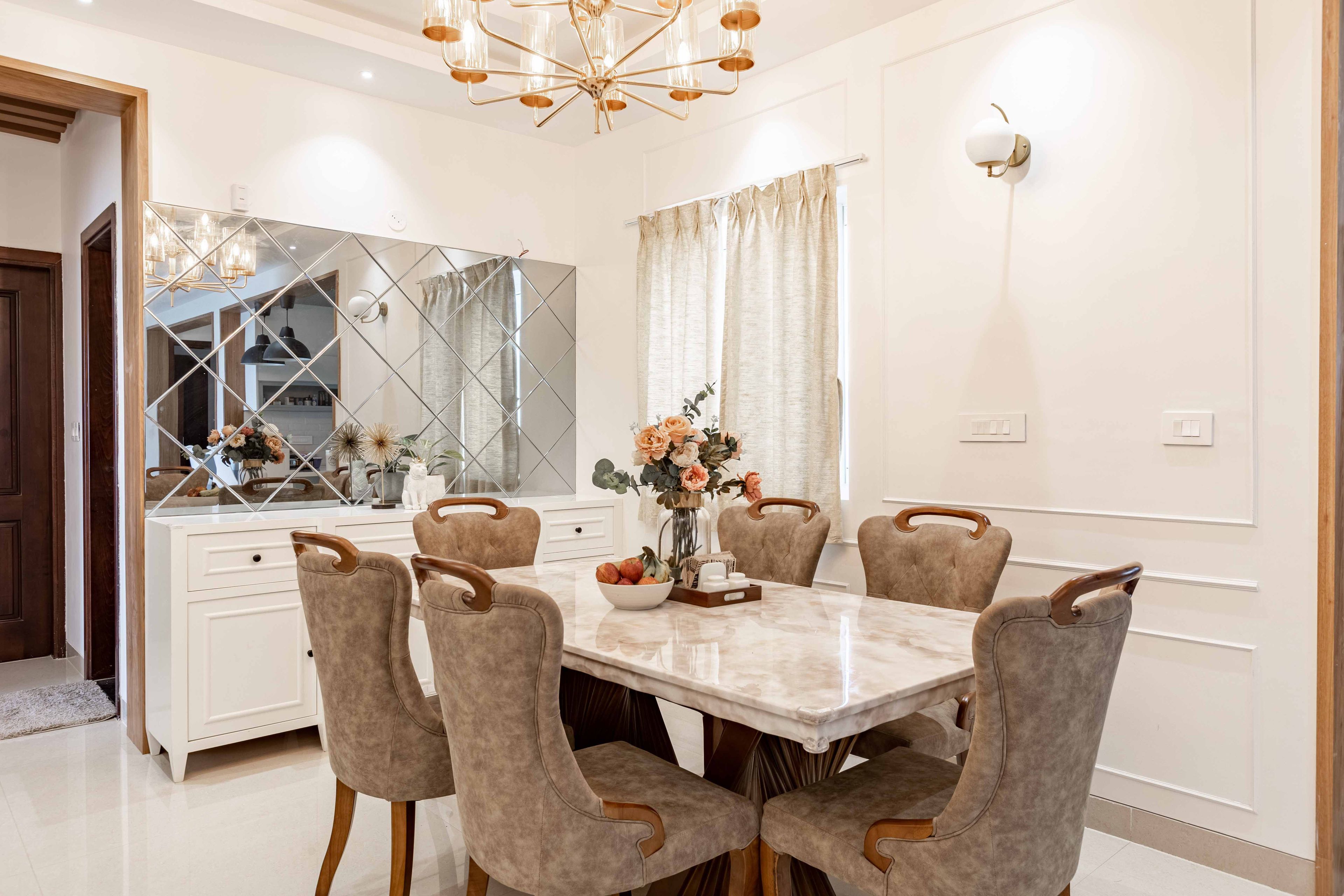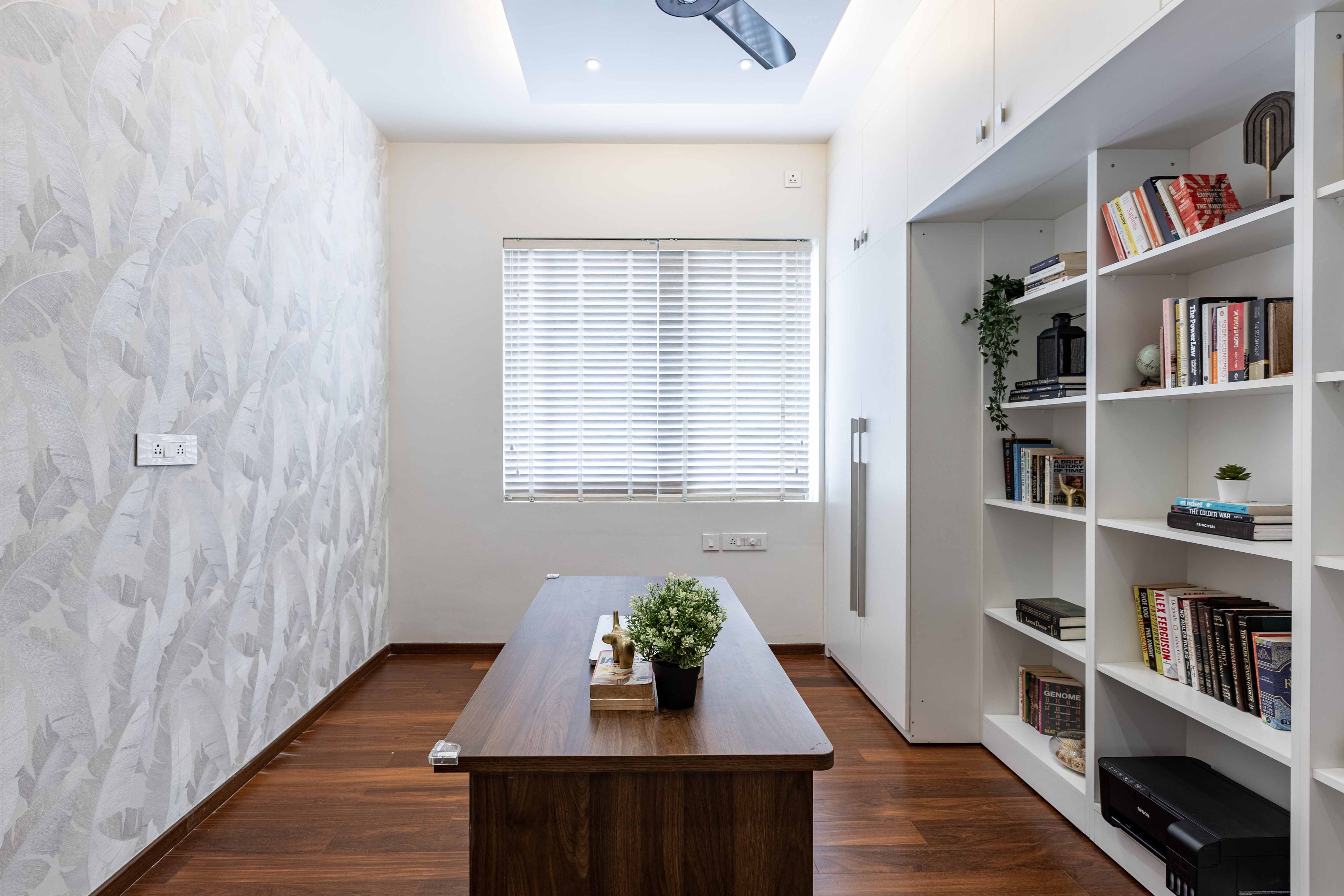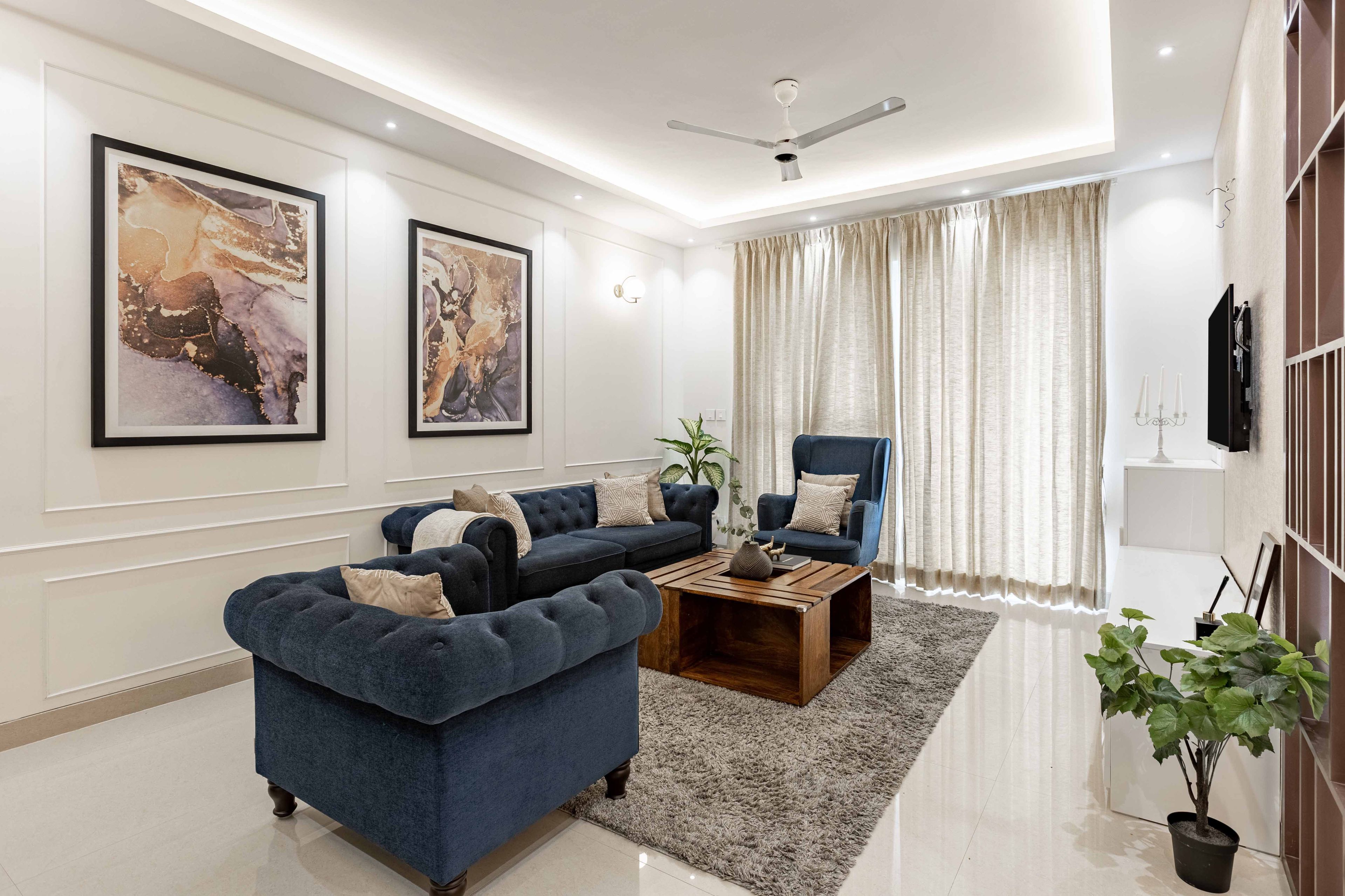 Welcome to this stunning 2-BHK flat in Bangalore, where style and functionality meet harmoniously. The U-shaped grey and white kitchen design boasts white brick rectangular dado tiles, under-cabinet lights, and an attached breakfast counter, creating a modern and efficient cooking space. The spacious living room features blue sofas, white walls with trims and art work, and a wooden divider that adds a touch of elegance. The white TV unit design complements the space beautifully. Indulge in the luxurious marble countertop dining room with a 6-seater table and brown chairs. The glass wall over the storage cabinet adds a touch of sophistication, while the decorative chandelier enhances the overall ambience. Retreat to the grey and white master bedroom with its sliding wardrobe, lofts, and timeless wooden flooring, offering a serene and inviting atmosphere. The second bedroom offers a low wooden bed, grey upholstery, white walls with trims, and a cozy seating area, creating a wonderful space to relax. Additionally, a separate library with a large open unit for book storage, a wardrobe, and a tropical white and grey wardrobe complete this exquisite home. Experience the perfect blend of style and functionality in this meticulously designed 2-BHK flat, where every corner tells a story of elegance and comfort.