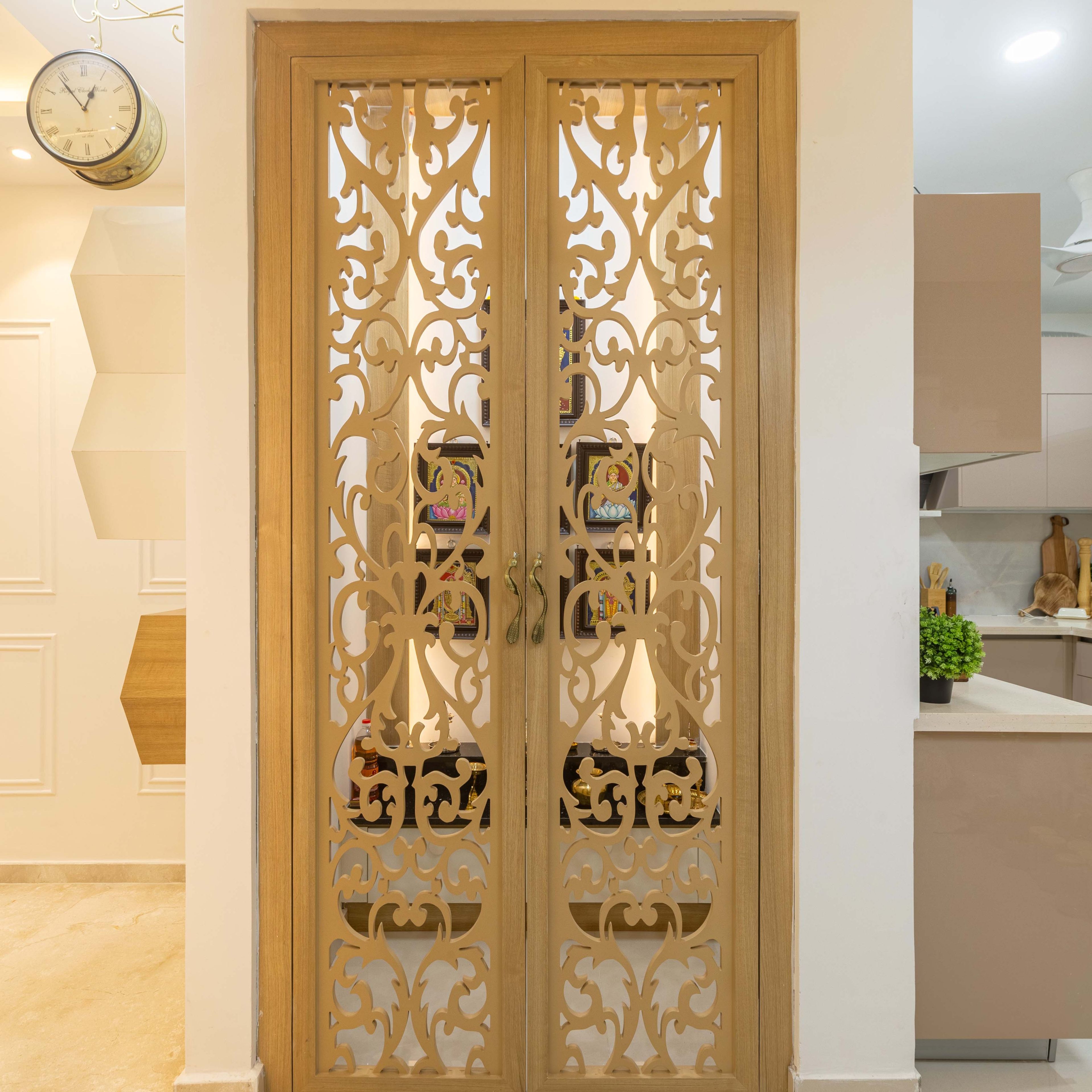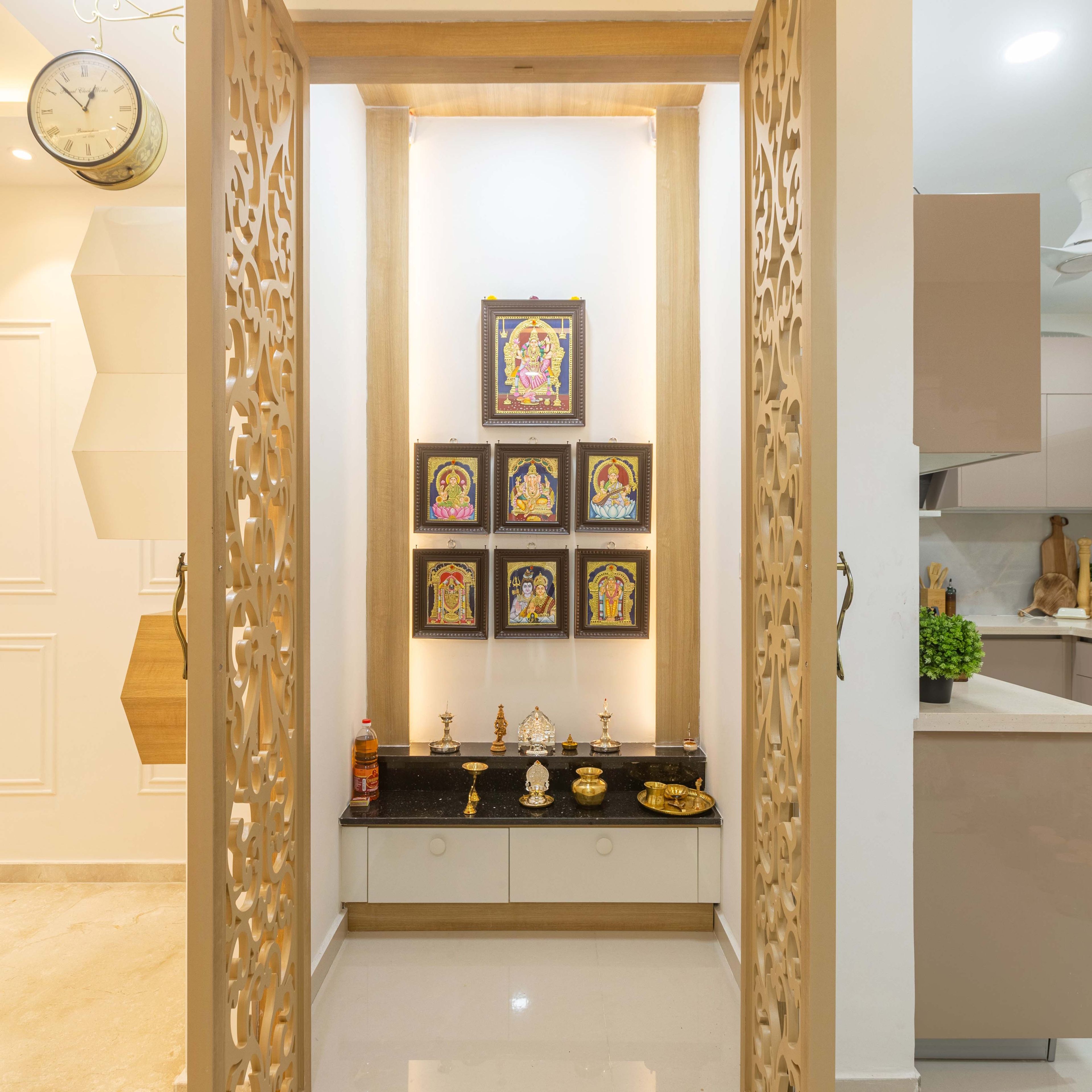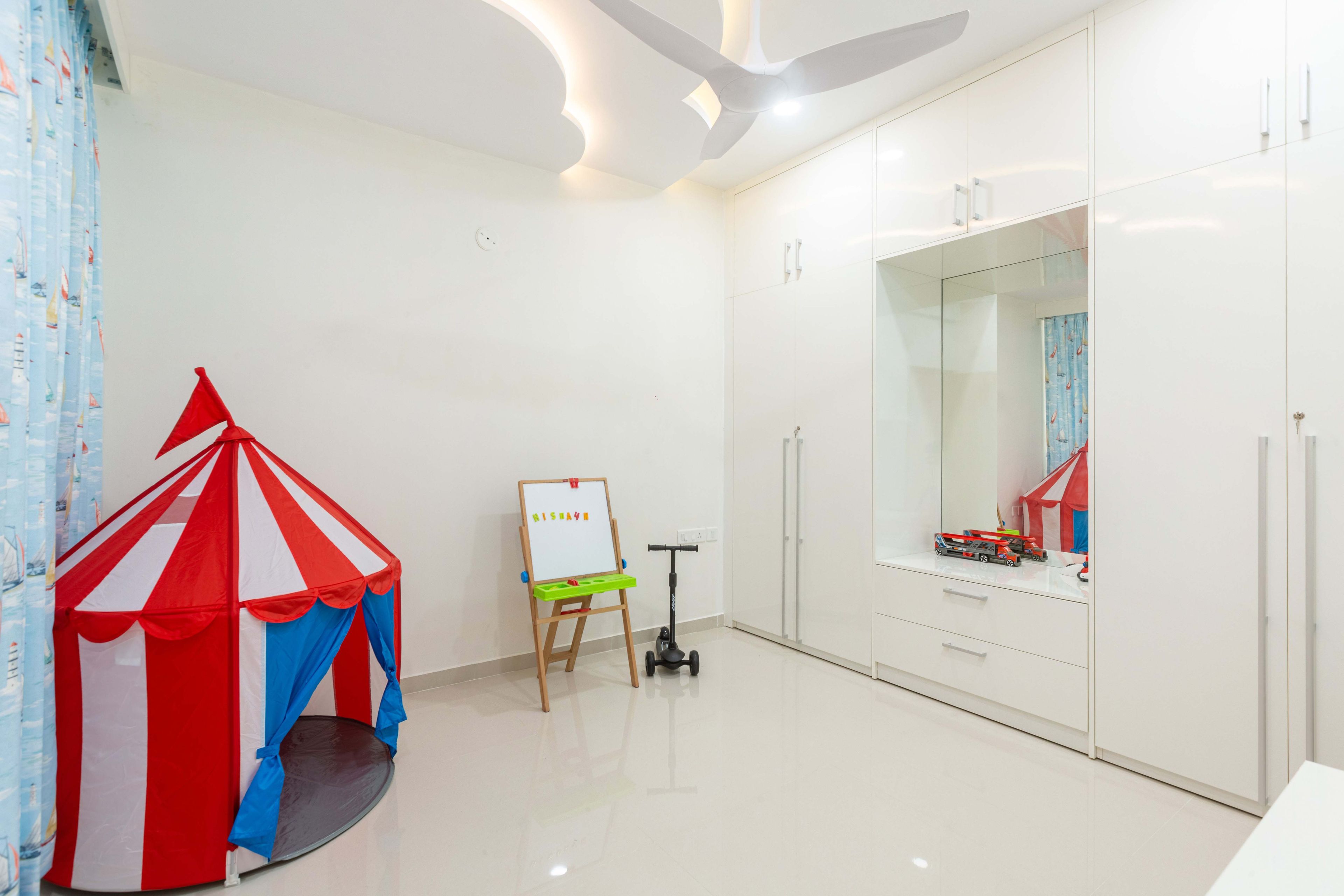 This enchanting 3-BHK Chennai flat is where every room tells a unique story of style and comfort. Step into the light pink L-shaped kitchen, adorned with glossy cabinets and ample storage, including charming wicker baskets. The beige and white light living room captivates with its elegant white and wood TV unit set against a backdrop of marble paneling. A hidden gem awaits in the form of a closed pooja room, featuring exquisite CNC cut patterns and traditional wooden accents, creating a sacred space for reflection and prayer. Escape to the serene light blue master bedroom, where glossy blue wardrobes, a dressing unit, and a glossy blue TV unit add a touch of sophistication. The second bedroom boasts a blend of functionality and elegance, with a spacious dressing table, mirror lights, wooden flooring, beige walls adorned with trims, and a sleek beige and brown glossy wardrobe. Imagination takes flight in the kid's room, complete with white wardrobes and a small red and white tent, creating a whimsical haven for play and dreams. Work with inspiration in the home office space, featuring an integrated grey wardrobe, open and closed storage units, and a large study table accompanied by comfortable wooden chairs.