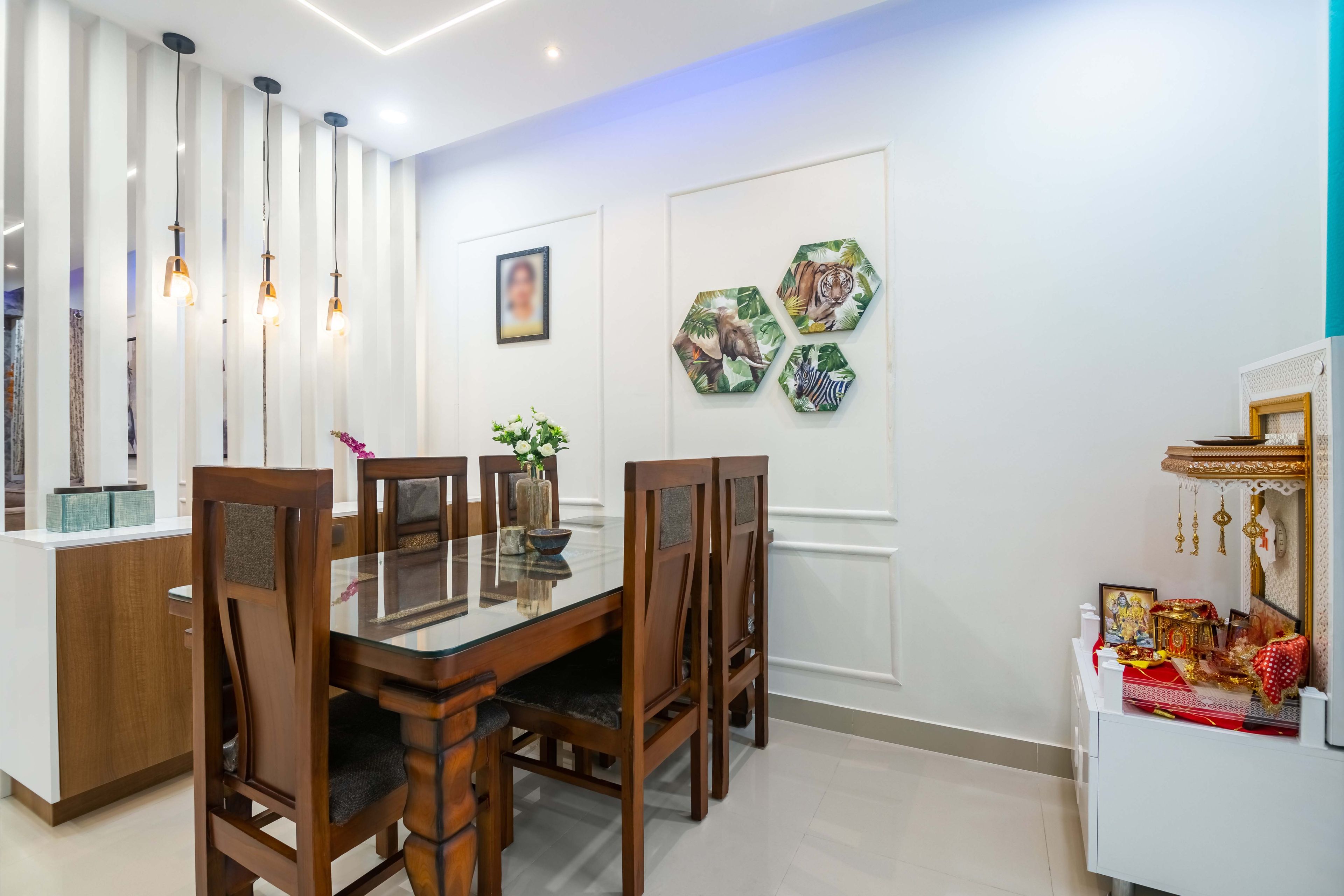 What We Love: The 5-seater wooden dining room design with the integrated pooja unit is the perfect example of optimising a compact space, in an aesthetic manner