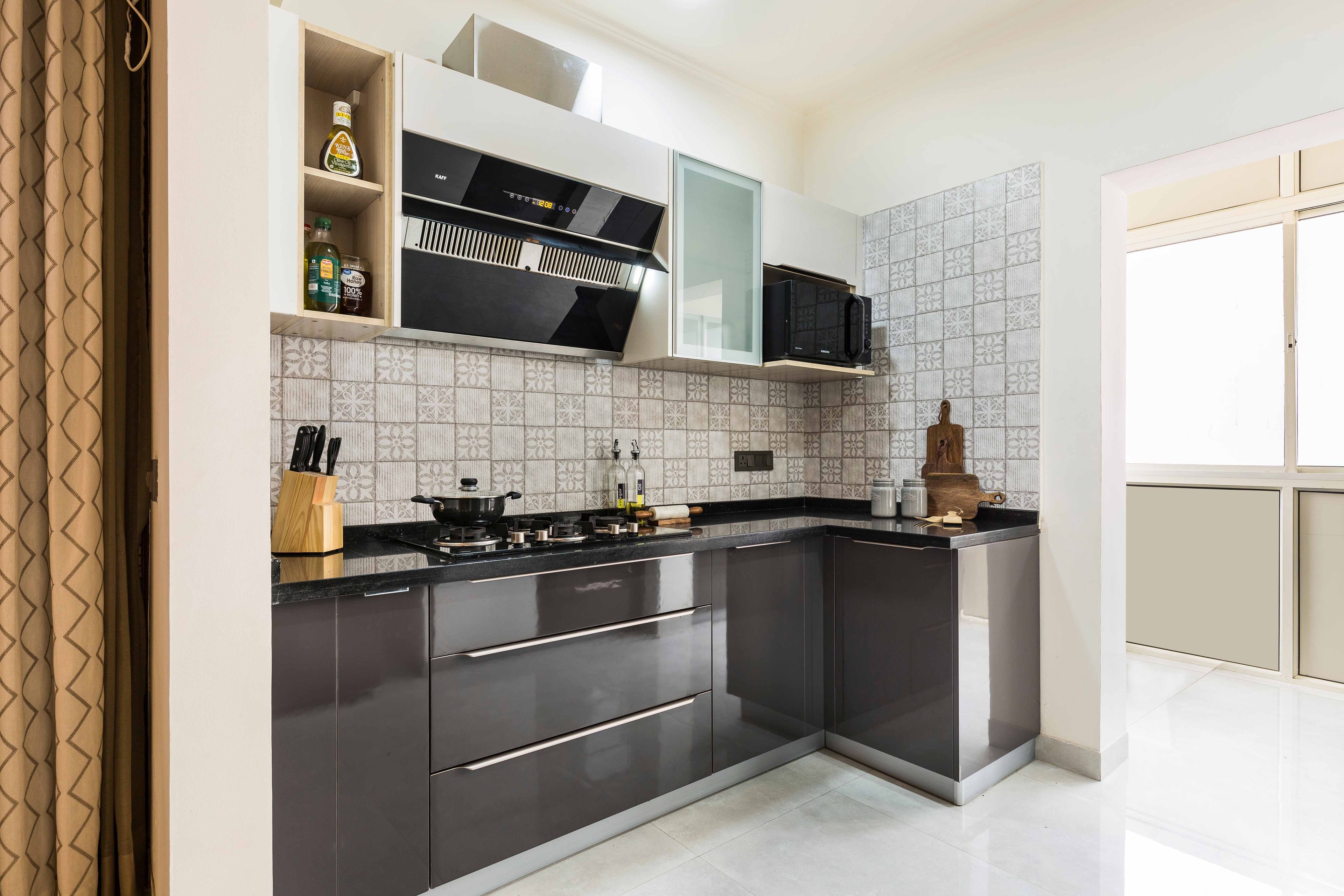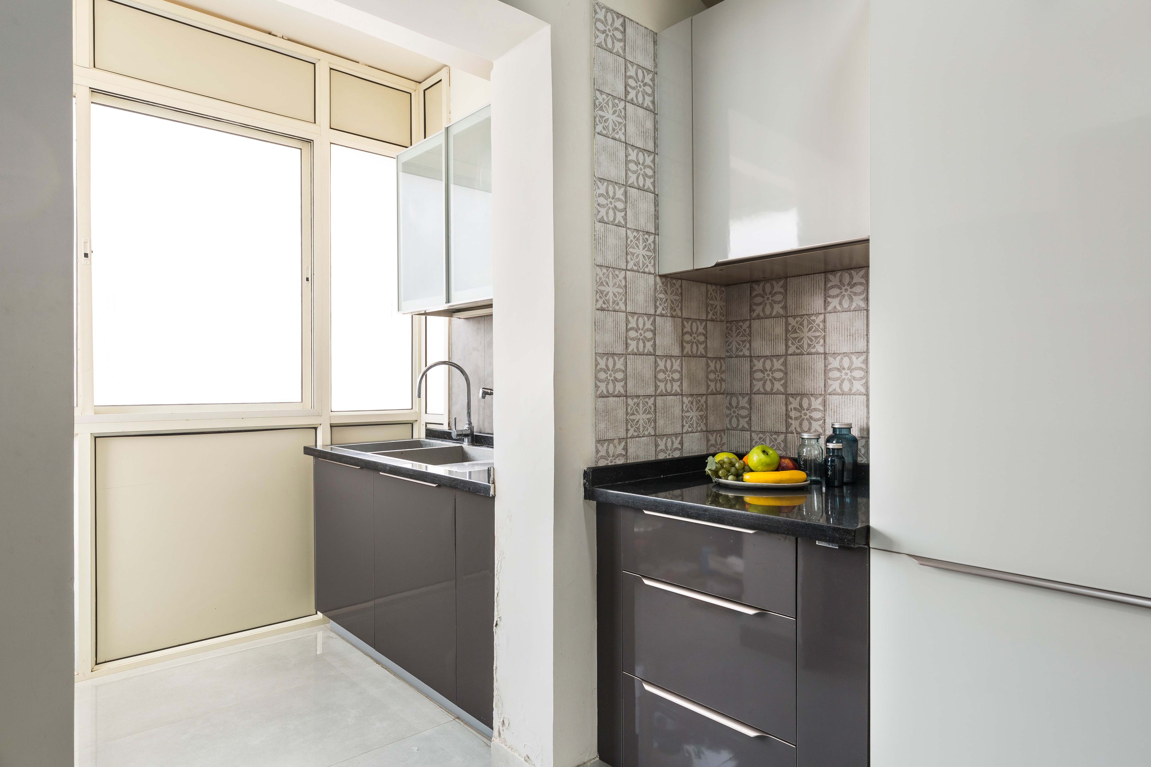 Experience contemporary elegance in this compact parallel kitchen design with brown and white cabinets and mosaic tiles. From the striking wooden panelled wall in the living room to the spacious master bedroom with a tufted headboard and swing wooden wardrobe, this haven blends style and functionality seamlessly.