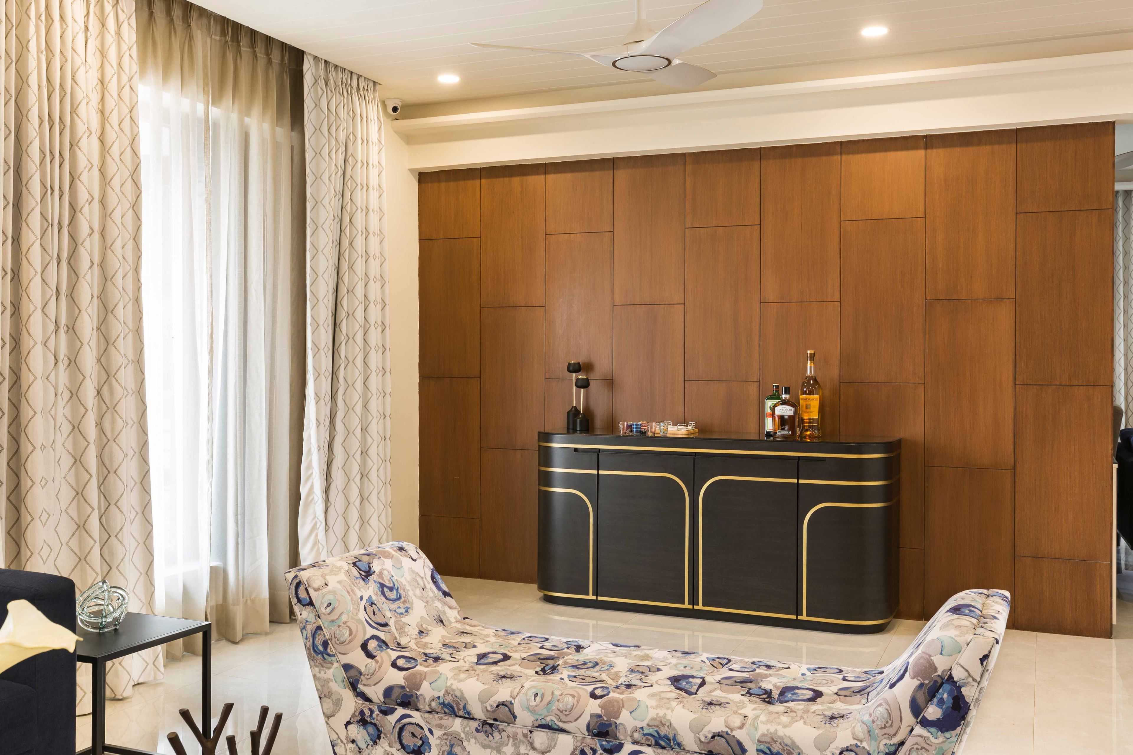 What We Love: The modular bar unit, set against the wooden panelled wall adds an elegant aesthetic to the living room space, while heroing the wooden wall. The addition of the bar unit to the living room space makes the living room the perfect space for entertaining.