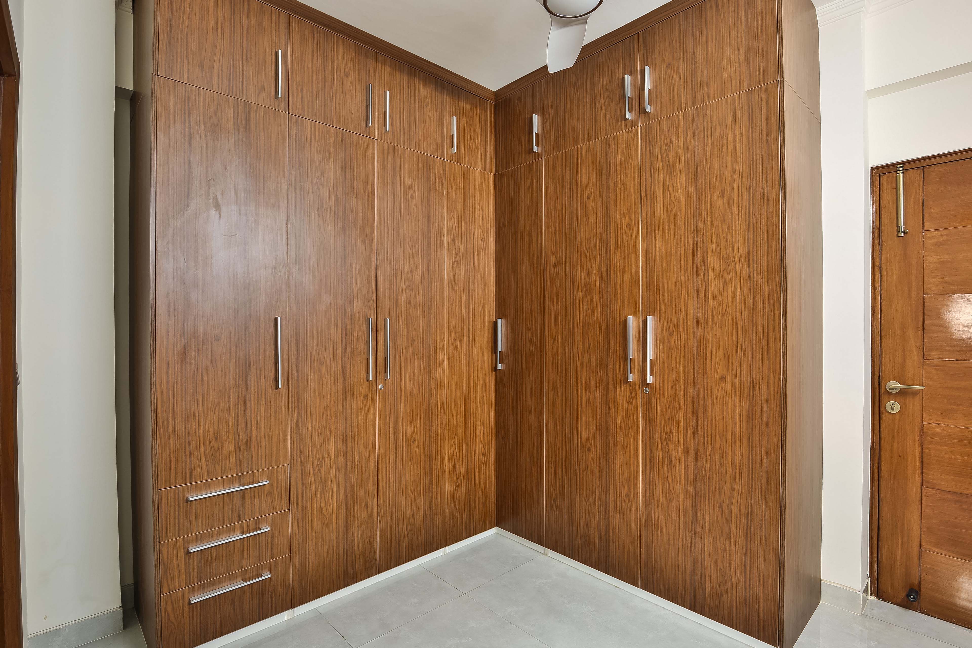 1.Master Bedroom: L-shaped wooden swing wardrobe