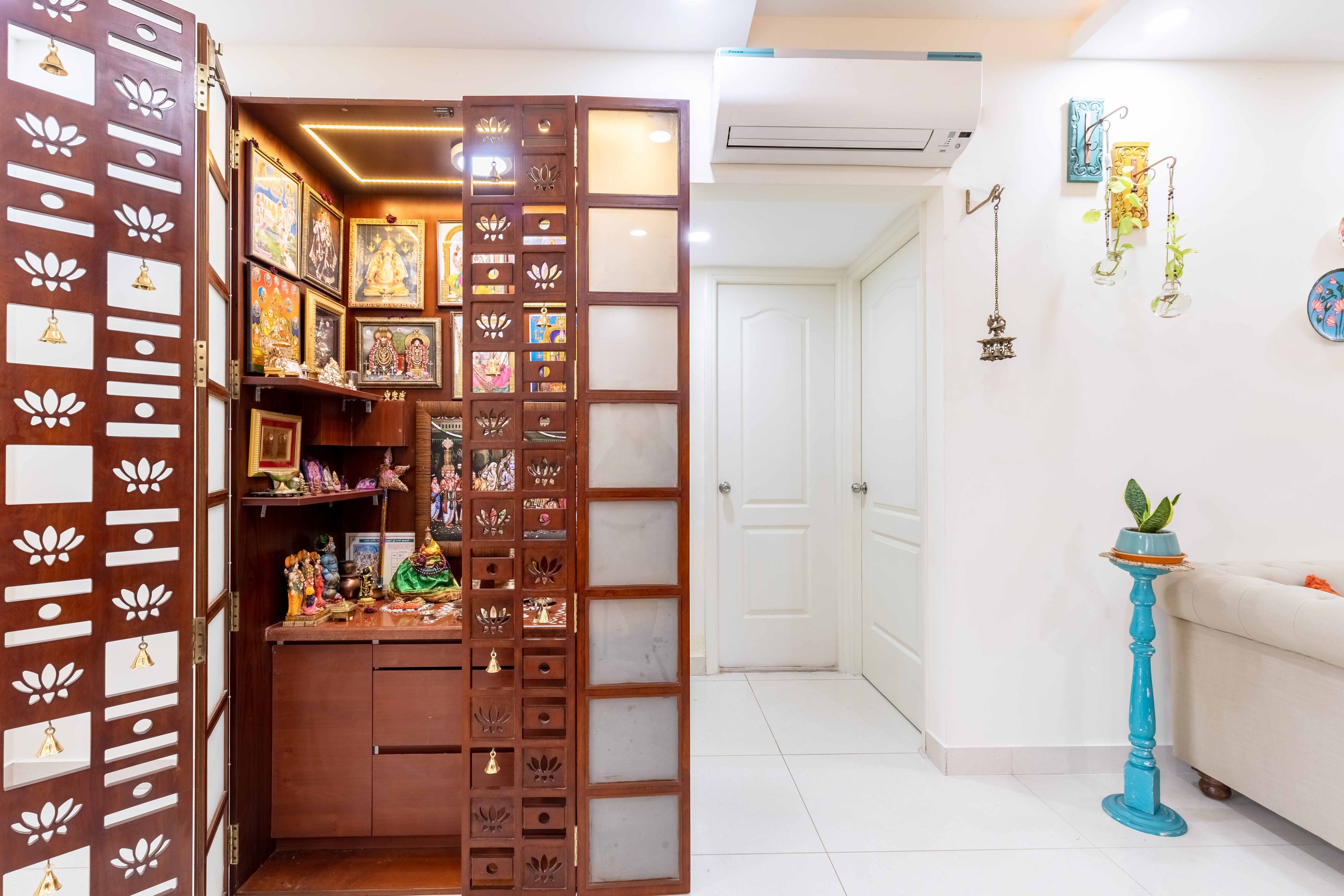 What We Love: While the 2-BHK flat exudes a contemporary vibe, the traditional Indian motifs, be it through the master bedroom's wallpaper, the traditional mandir design or the patterning on the headboads of the bed, add personality and a unique charm to the rooms.