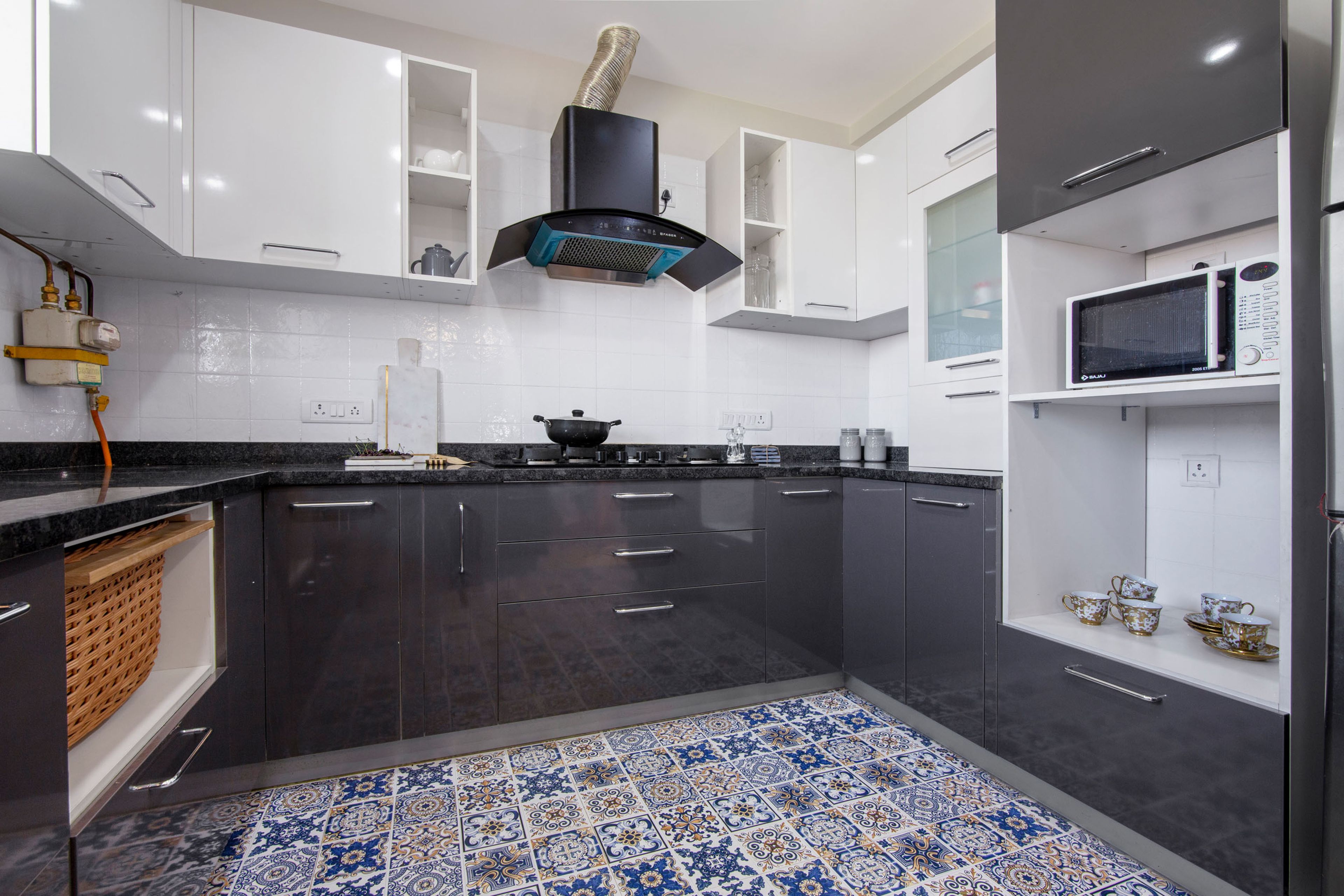 Discover the allure of this 3-BHK flat with a sophisticated U-shaped kitchen featuring elegant mosaic flooring, adding a touch of luxury. Admire the stylish white swing wardrobes in the master and guest rooms, along with the functional 2-door swing wardrobe and study table unit in the kids' bedroom.