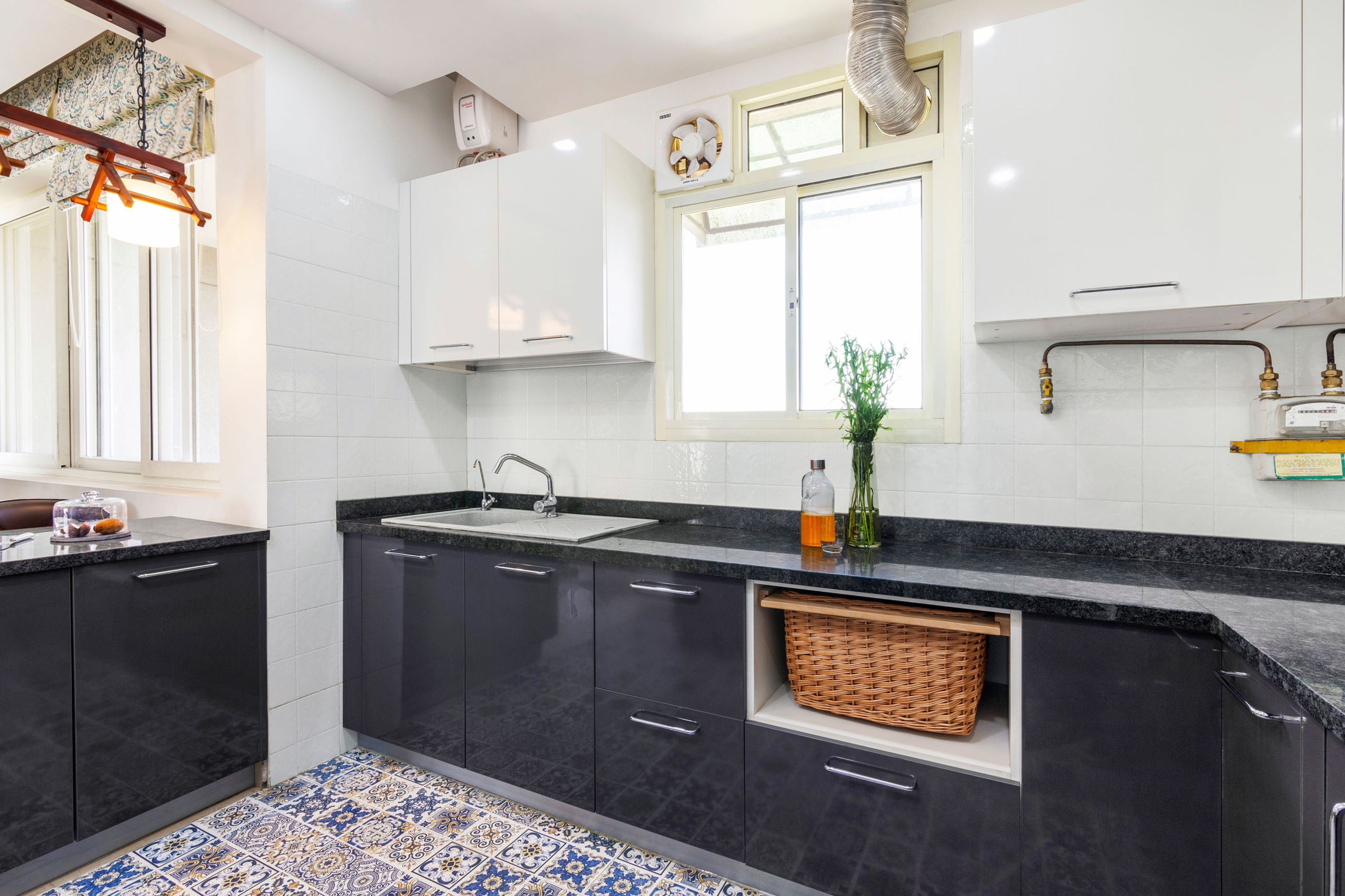 What We Love: The U-shaped kitchen with the mosaic flooring. The mosaic tiling exudes a luxe vibe to the space.