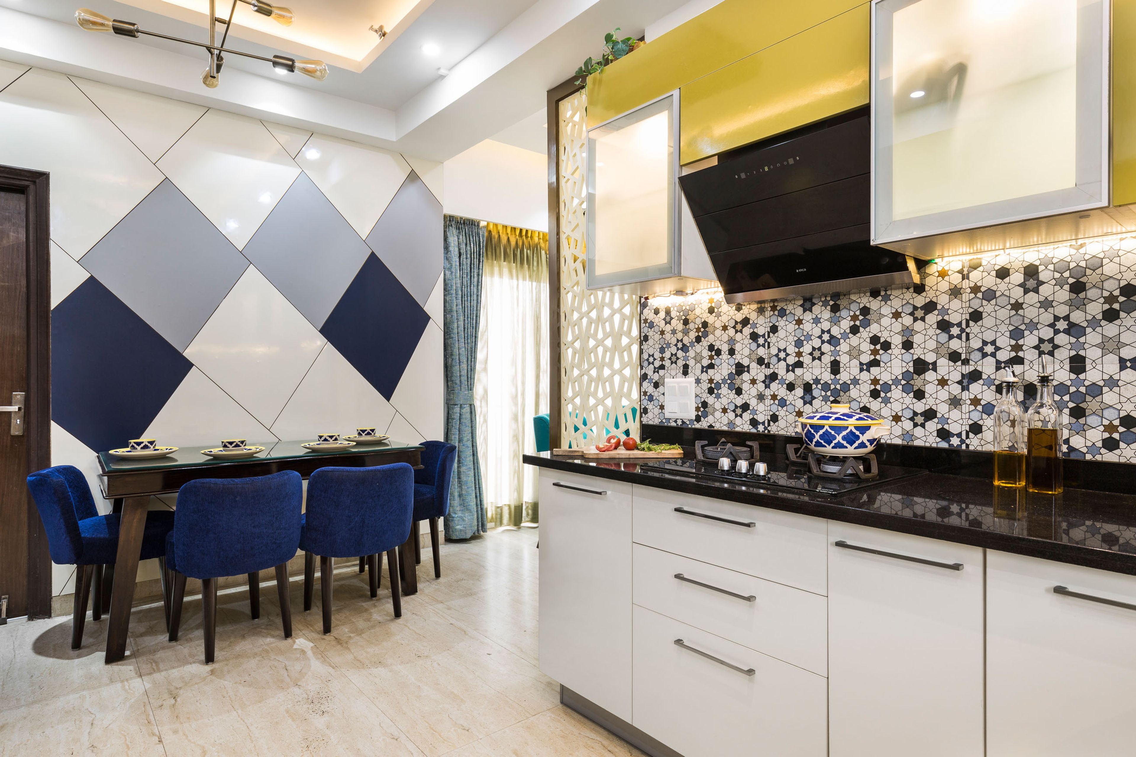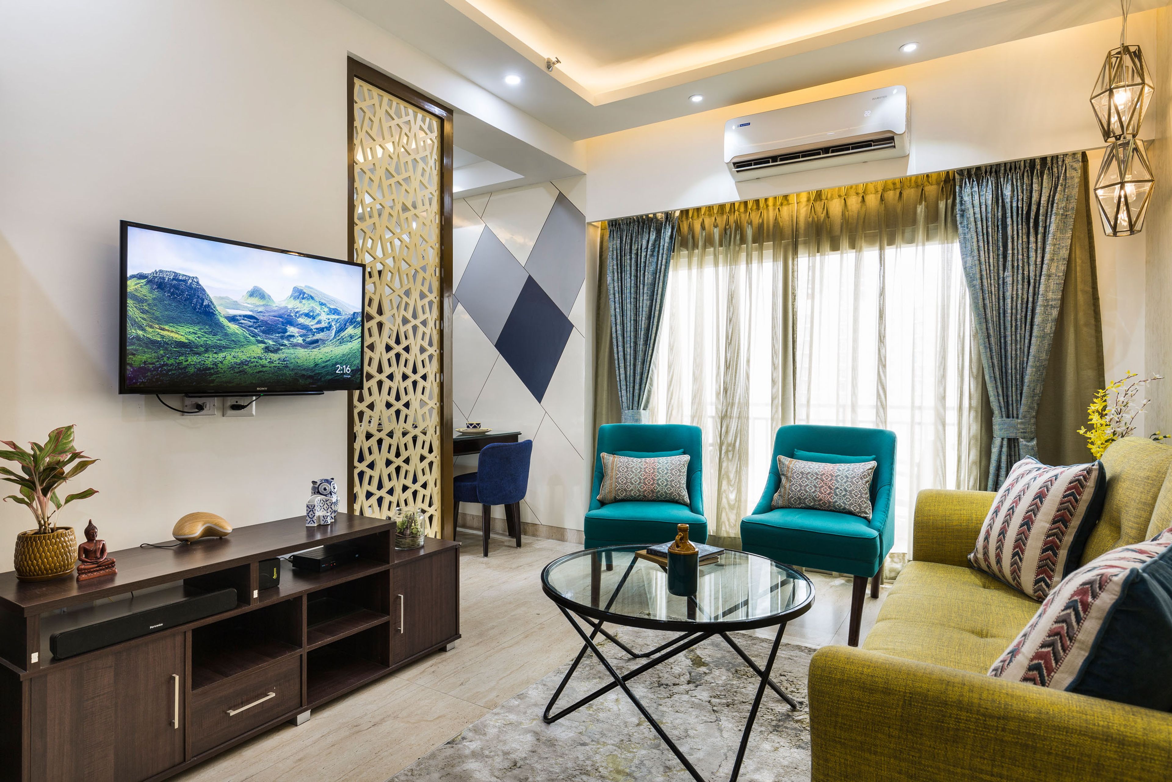 What We Love: The spacious living room design with the parakeet-toned seater and the blue accent chairs. The dark wooden TV unit design is a stand-out and complements the overall aesthetic of the living room. The ornamental jali panel helps seperate the living room and the dining room.