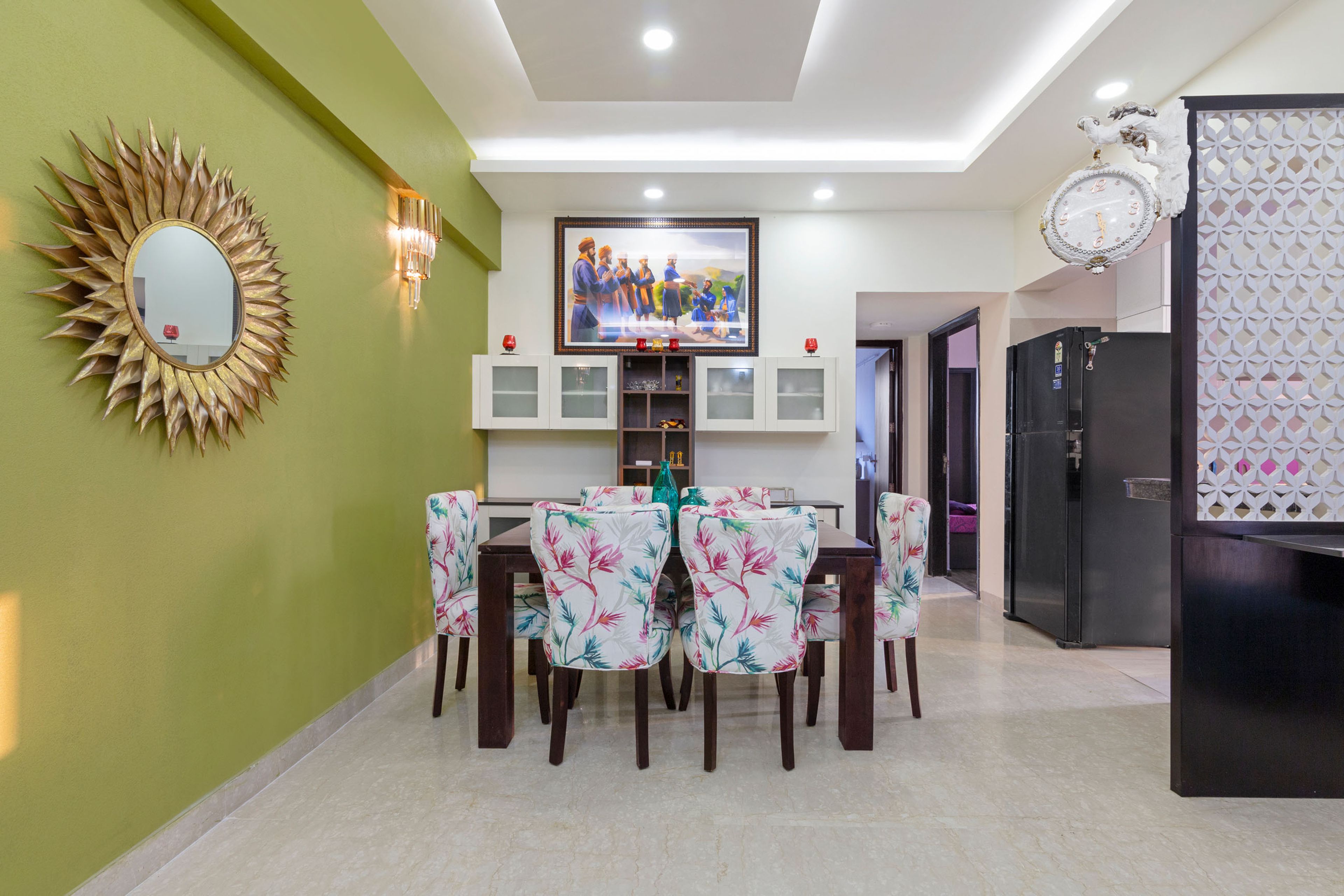 Introducing our 2 BHK house in the heart of Gurgaon, designed with a perfect blend of style and comfort. The house features a spacious living room with an L-shaped blue seater, complemented by a textured beige wall and a sleek TV unit. The six-seater dining table is surrounded by printed chairs and is set against a warm mustard toned wall, with a decorative round mirror adding a touch of elegance. The master bedroom is a serene oasis, boasting a stunning purple headboard, floral wallpaper, and a TV unit for those lazy weekend mornings. The kids' bedroom is designed to stimulate imagination, featuring white storage, colourful wallpaper, and warm wooden flooring, with a large wooden study table and printed chair for young minds to grow and learn. The foyer welcomes you with sophisticated wooden panelling, a white console, and a decorative mirror to create a lasting impression on all your guests. The white crockery unit in the dining room provides ample storage, making hosting dinner parties a breeze. Experience luxury and comfort at its best with our 2 BHK house in Gurgaon, designed to exceed your expectations.