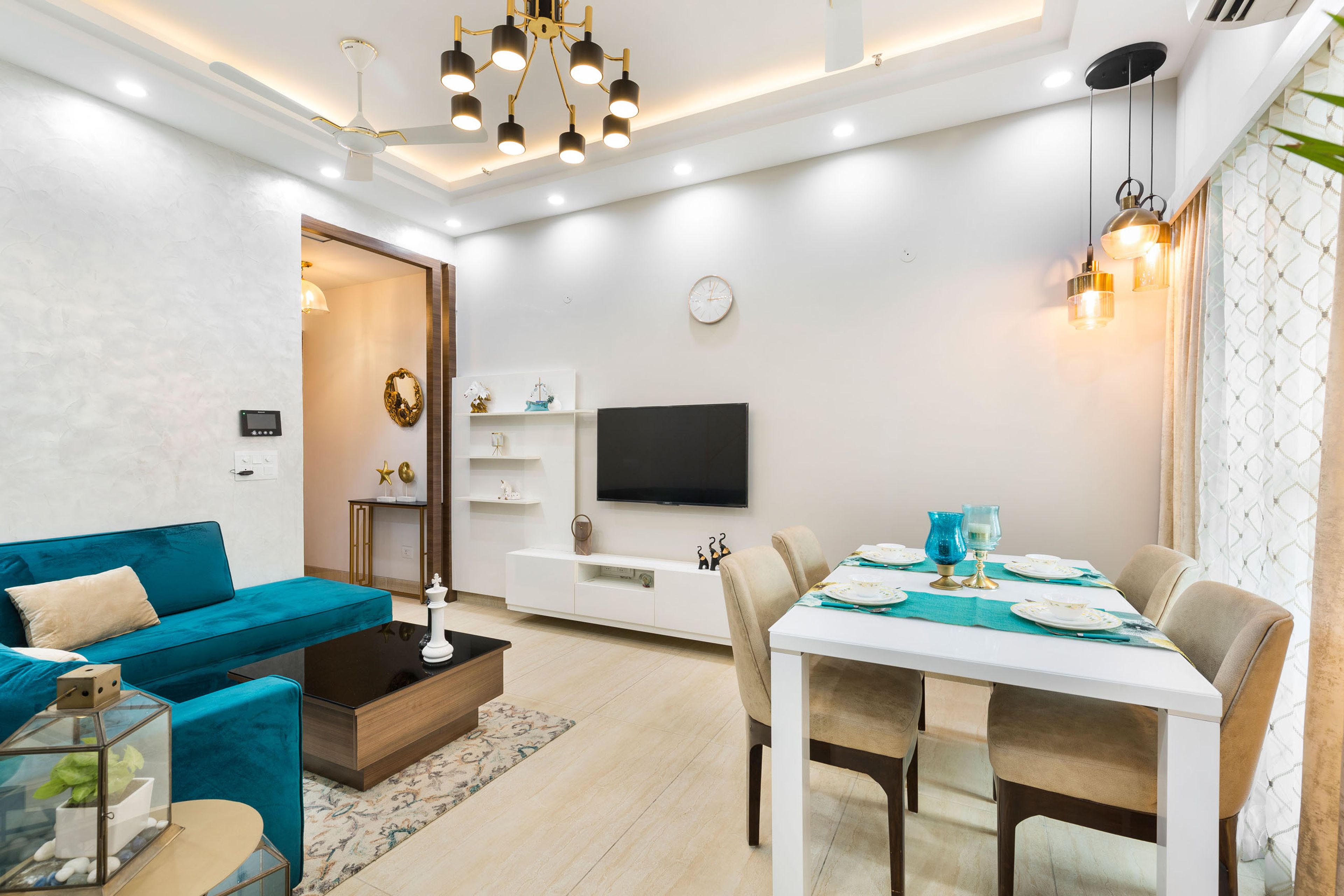 Experience elegance and functionality in this stylish 3-BHK flat boasting practical storage solutions in each room—a white 3-door swing wardrobe with loft storage in the master bedroom, a wall-mounted single wooden mirrored storage unit, and a 3-door white and wood swing wardrobe in the guest room, and a 3-door off-white swing wardrobe with drawer storage in the kids' room. Standout features include the vibrant teal blue sectional sofa, adding a pop of color and allure to the living space. This home harmonizes practicality with a delightful play of colors, creating a vibrant and inviting ambiance throughout.