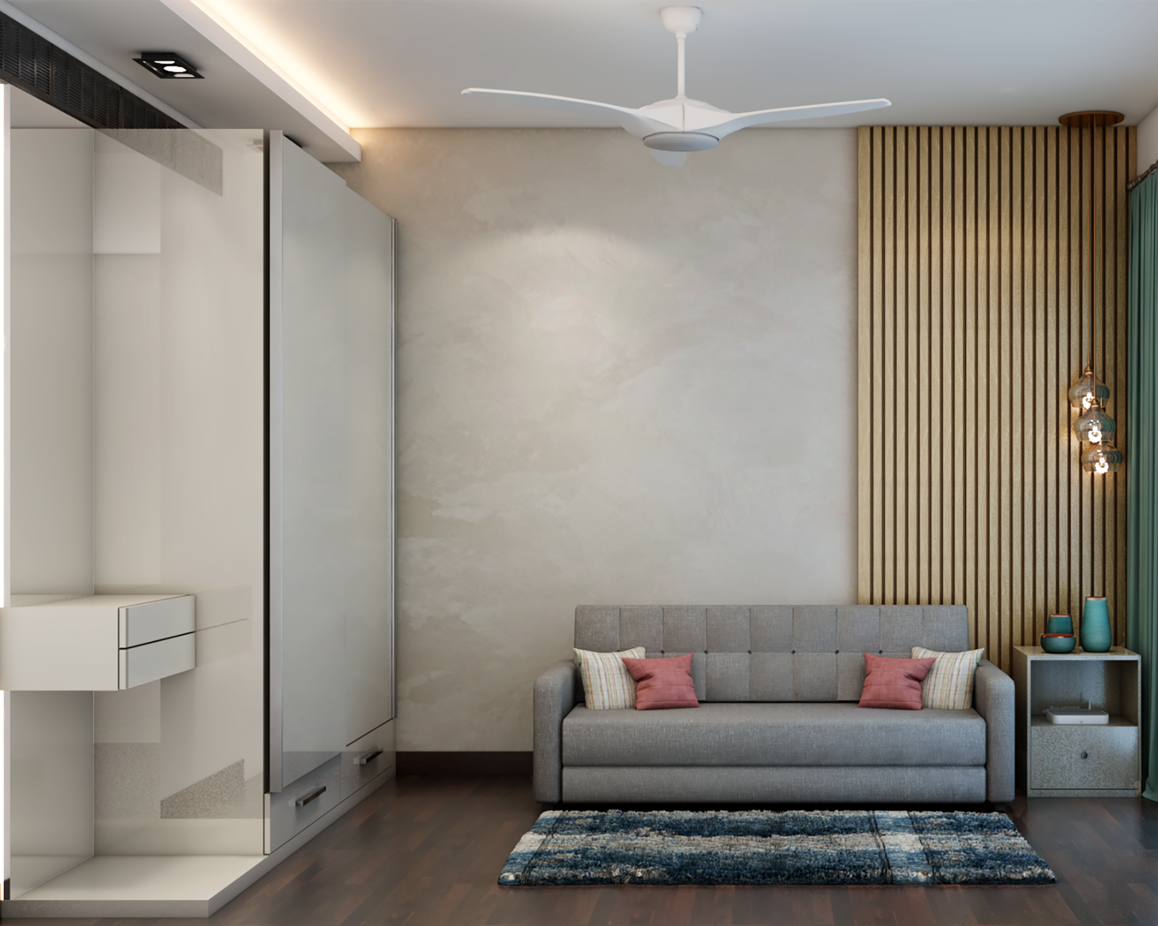This light oak wood home office is space, saving, functional, and ideal for Indian homes. It also comes with a large white finished wardrobe having a sliding door. The storage seater next to the wooden desk along with wooden panels as the backdrop is the highlight of this design. It is decorated with pink and grey cushions for contrast.