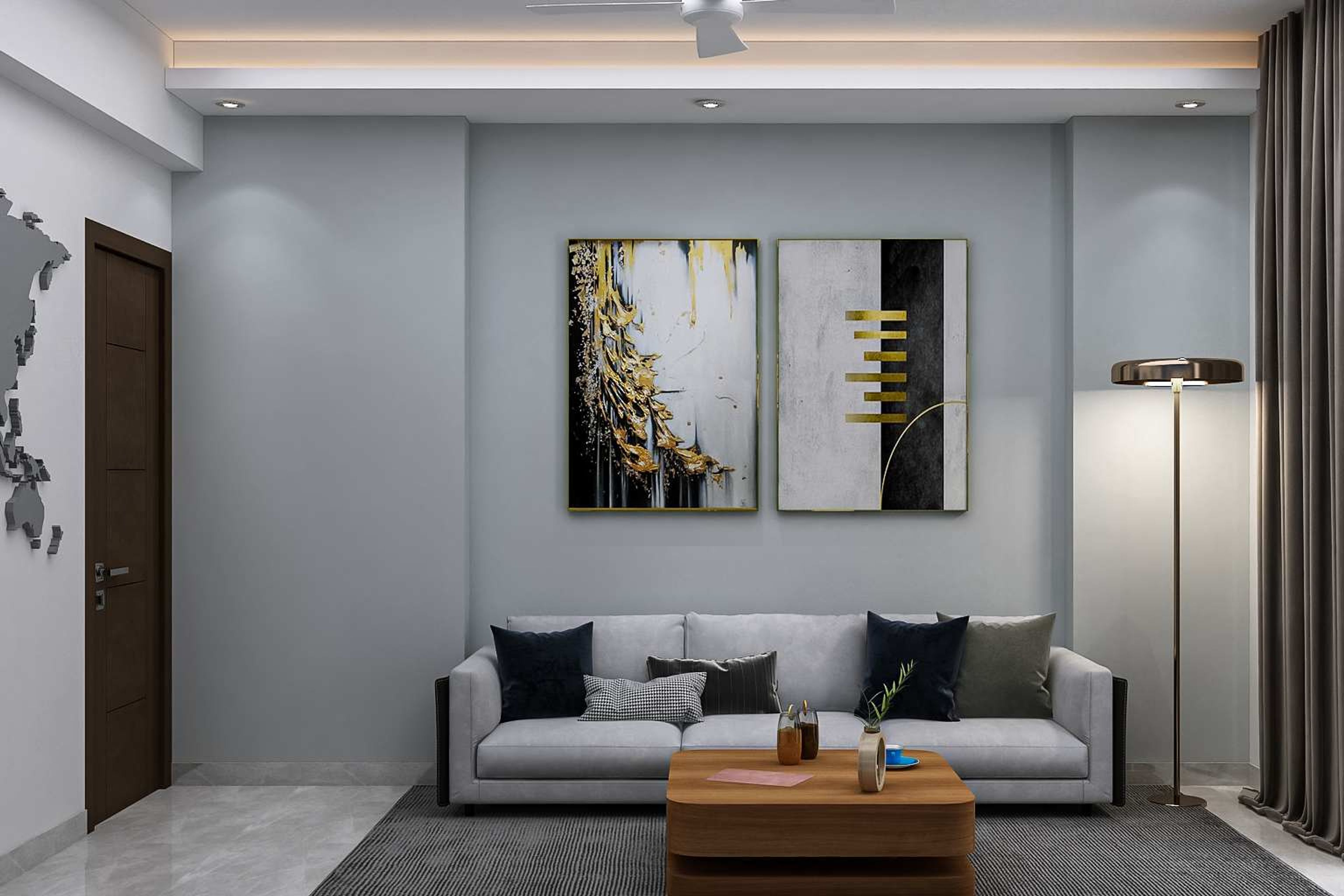 This sleek and vibrant home office looks professional with an L-shaped spacious work desk and a lounge sofa. Ample storage is provided on the wall shelf with glass-tinted shutters. The grey-coloured sofa provides a relaxing space with a large wall lamp and artistic pictures in the background.