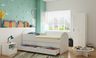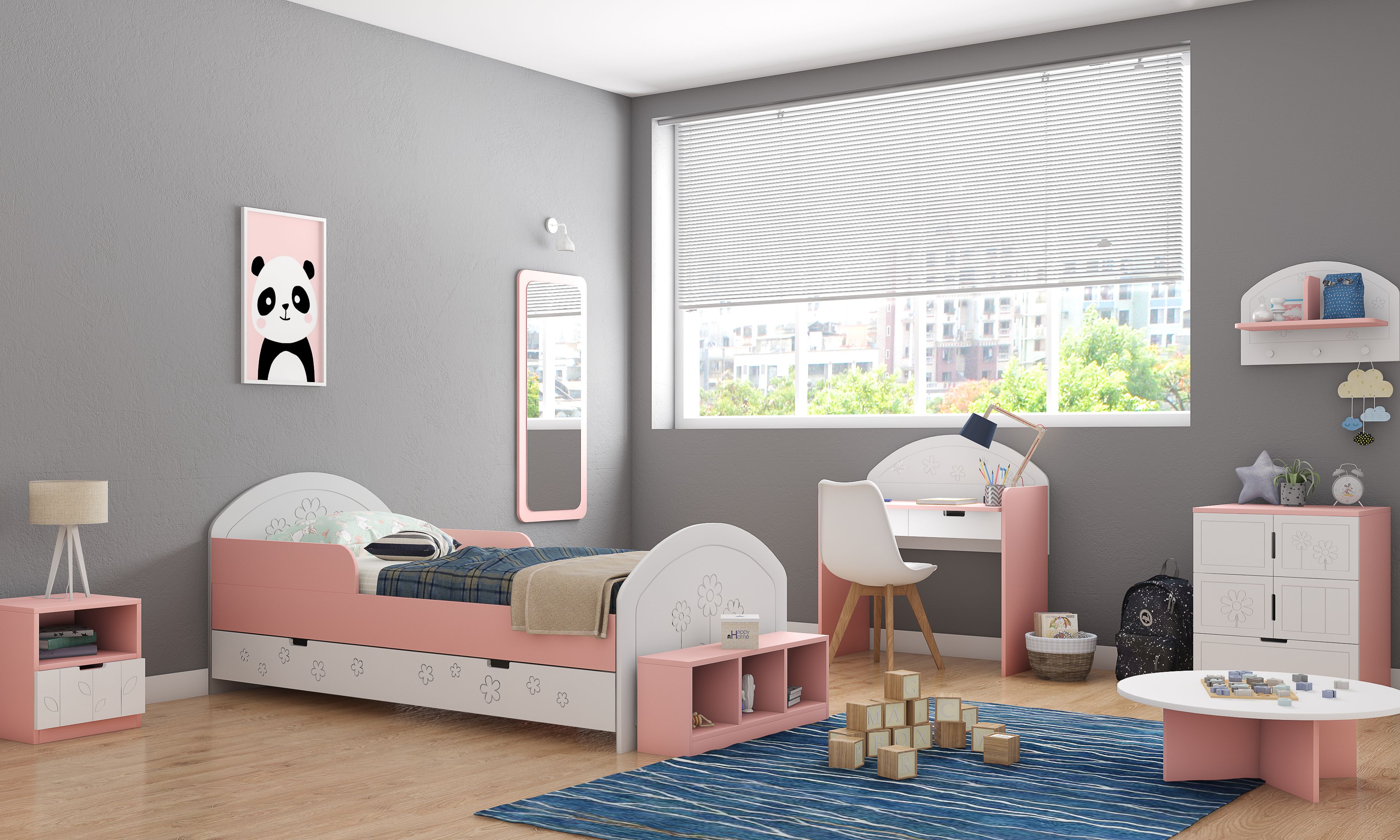 In this kids bedroom, blush pink meets clean white for a palette that's innocent without being infantile. The patterned trundle bed is backed by an austere grey wall and flanked by matching bedside tables and a sideboard. A functional desk by the window completes the study-play setup.