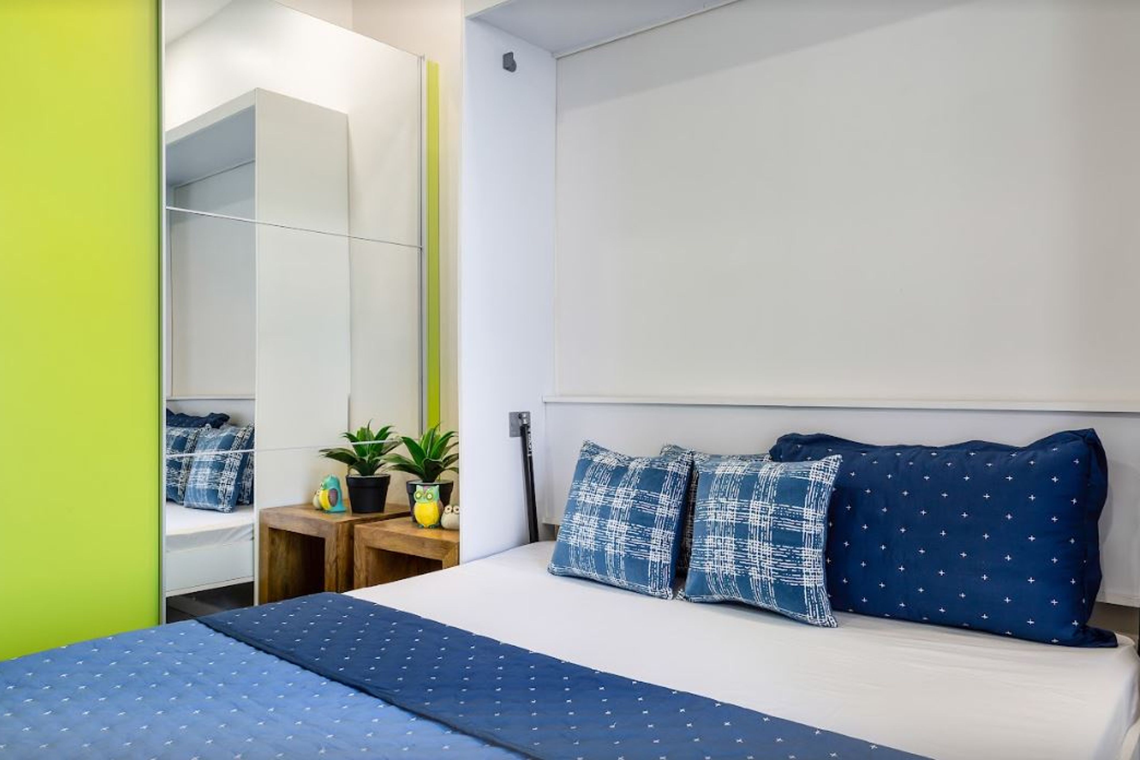 Room Highlights: A fusion of functionality and vibrancy, brought in by the lime green wardrobe, the blue upholstery for the bed and the white walls