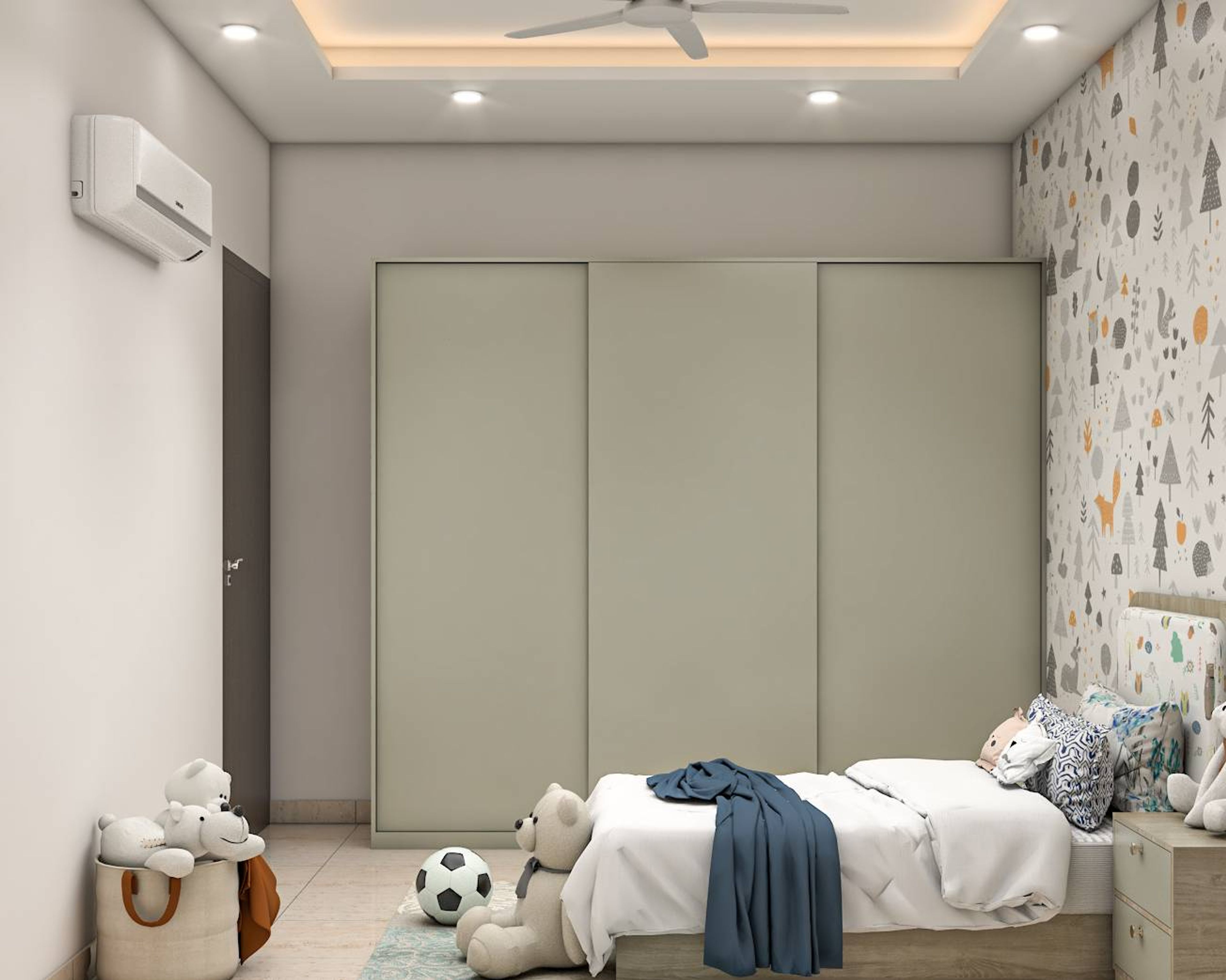 This spacious kid's bedroom design is styled in a contemporary way. The greenish brown wooden base bed comes with an in-built headboard and a pale grey bedside table with a wooden top. The white base wallpaper on the headboard wall has a beautiful design to attract kids. The grey finish wardrobe on the side has a sliding door to save space in the kid's bedroom design.