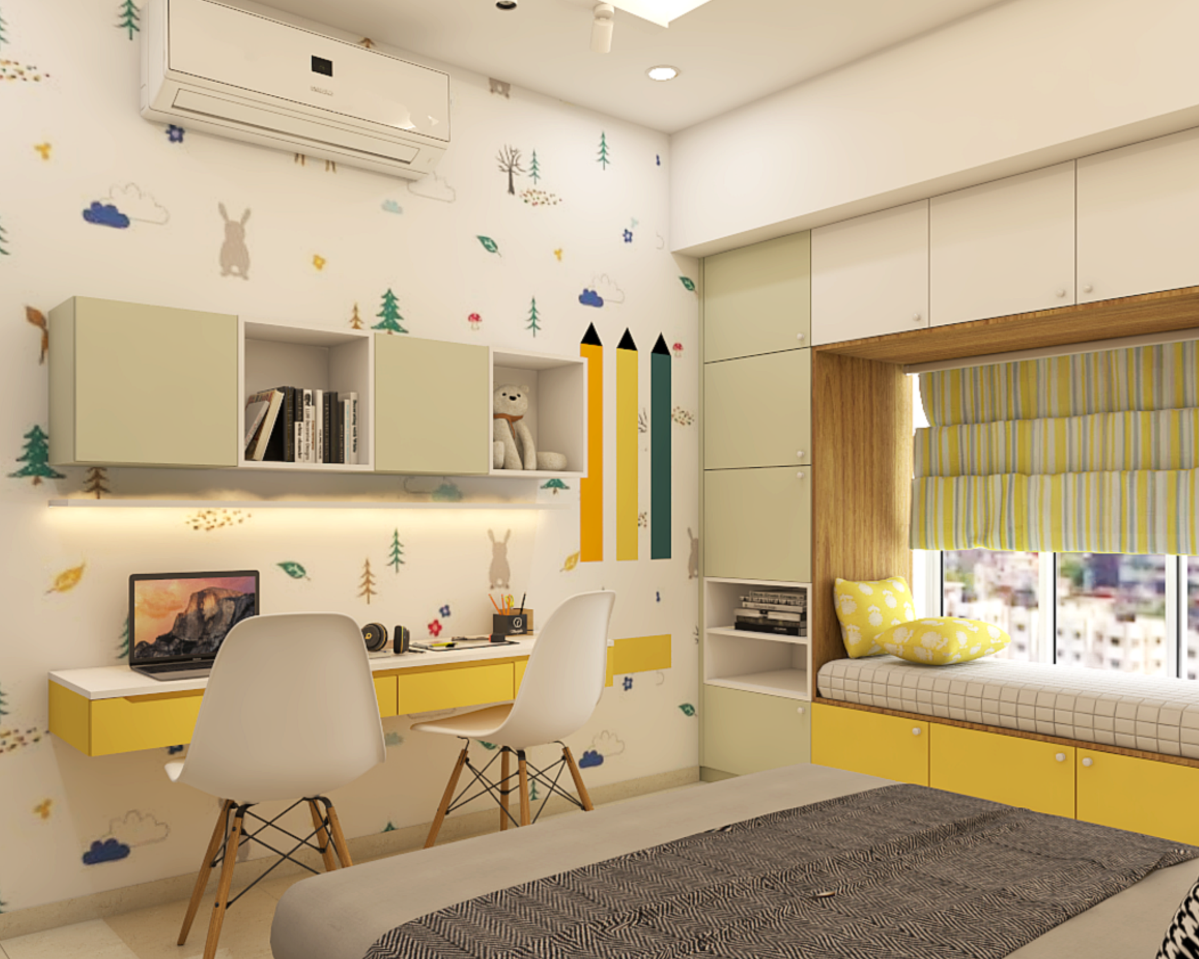This charming kid's bedroom design looks fun and lively with a yellow theme. The mountain-theme wallpaper behind the headboard complements the amber-tufted headboard. The white and yellow finished study looks beautiful with a creative wallpaper. A storage seater by the window adds additional warmth and comfort with a beige cushion and yellow storage units.