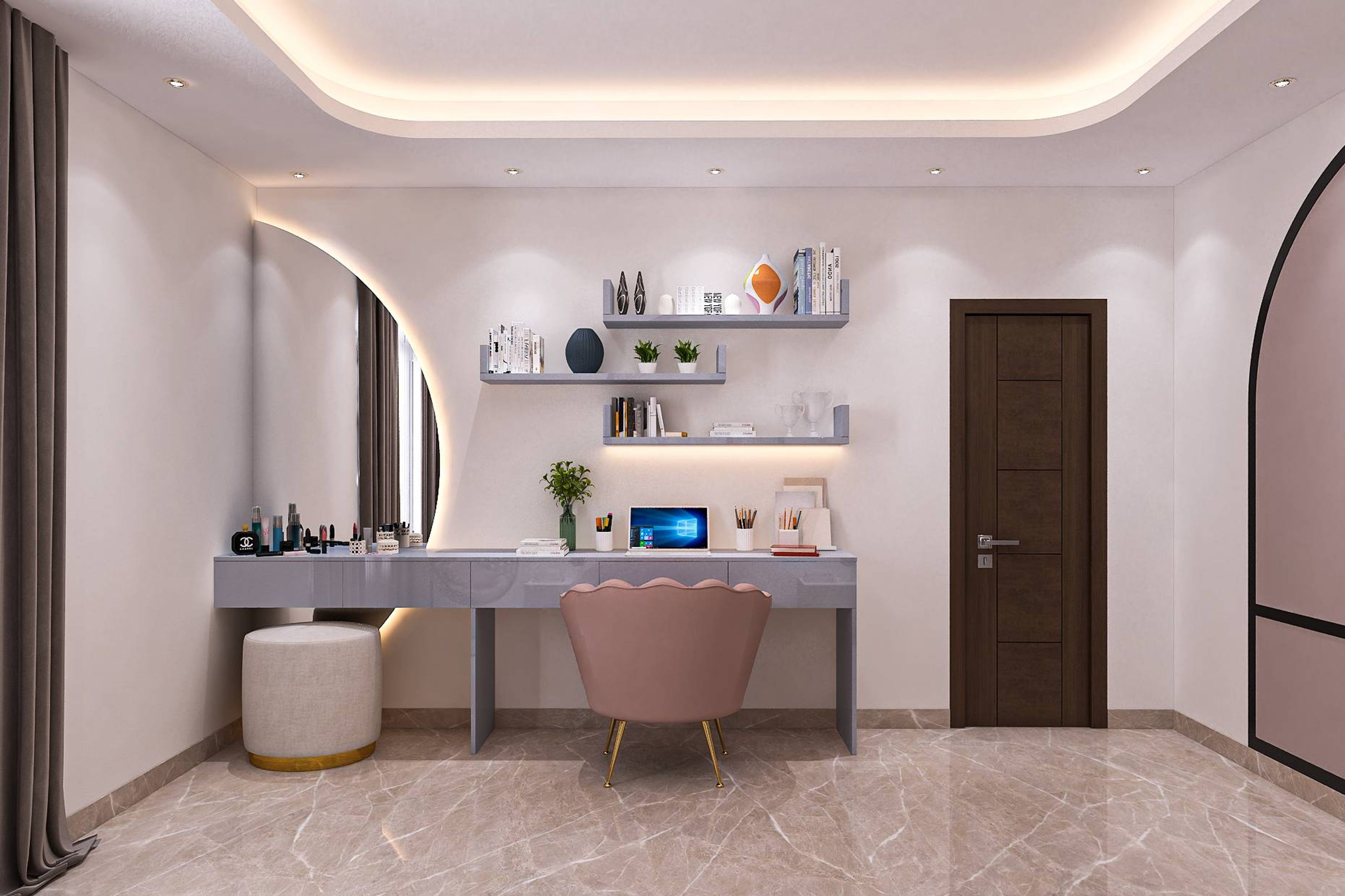 This kid's bedroom design has a balanced look between white and pink shades with a tropical design on the headboard. The all-white walls give a simple and elegant look which is contrasted by the purple accent chair. The integrated dressing space and study with an elliptical mirror give a neat finish.