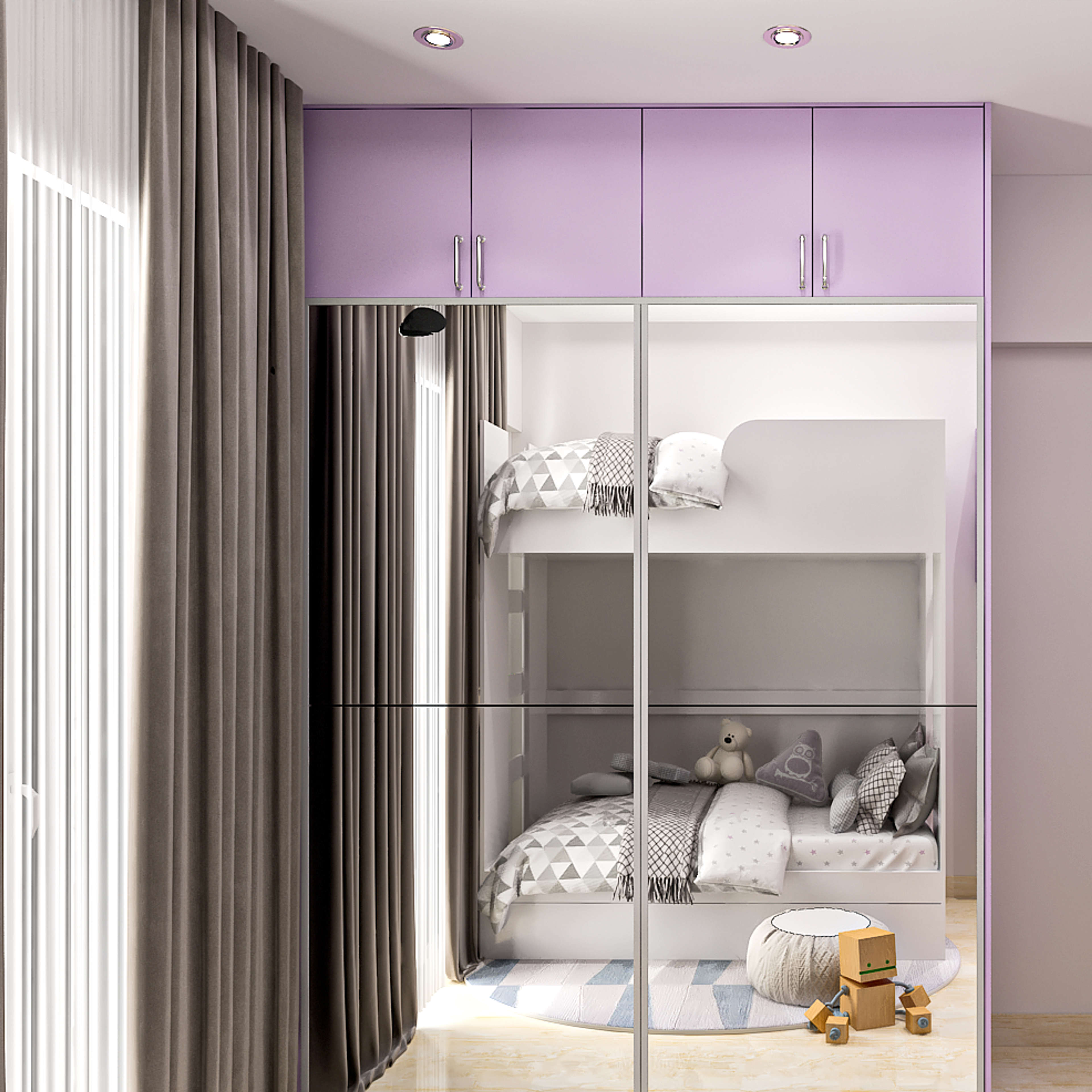 Gift your children the space to cherish their childhood and build their dreams in this contemporary-style kid's room design for girls. It features an adorable creamy white bunk bed that saves space, a pastel purple study desk with built-in drawers, and a white tabletop for contrast. The overhead storage cabinets match the colour schemes and suffice well to keep books and stationery organised. The wardrobe with a mirror panelling reflects light and gives the room some depth. Lofts in a matte finish look slick and add charm to the décor.
