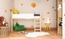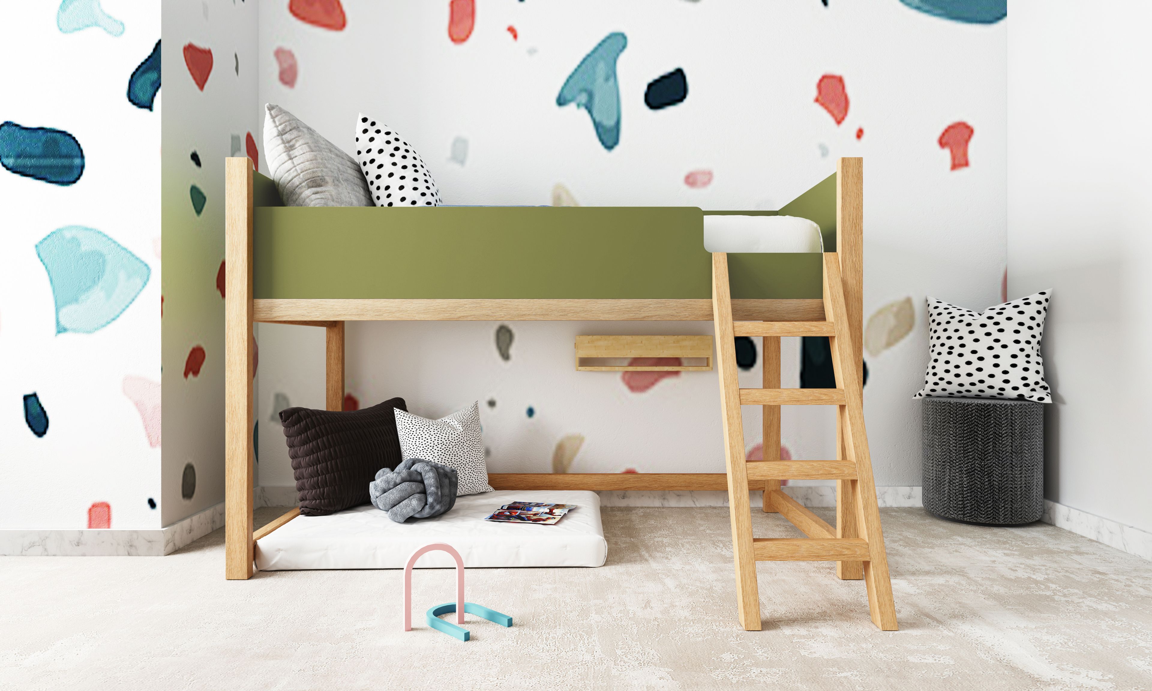 Marrying imaginative wall art with a smart space-saver bunk bed, this kids bedroom is quite inspiring. The focal point is the bunk bed with minimal wooden frames and high safety panels. The textured flooring adds subtle dimension enhanced by the quirky wallpaper.
