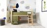 Ice cream-themed wallpaper paired with rustic wooden flooring makes for a refreshing sight in this kids bedroom. The bunk bed with built-in drawers suits the motif perfectly and also ticks boxes for functionality. A low-level bench doubles up as cubbyhole space and a grayscale area rug ties in with the adjacent wall.