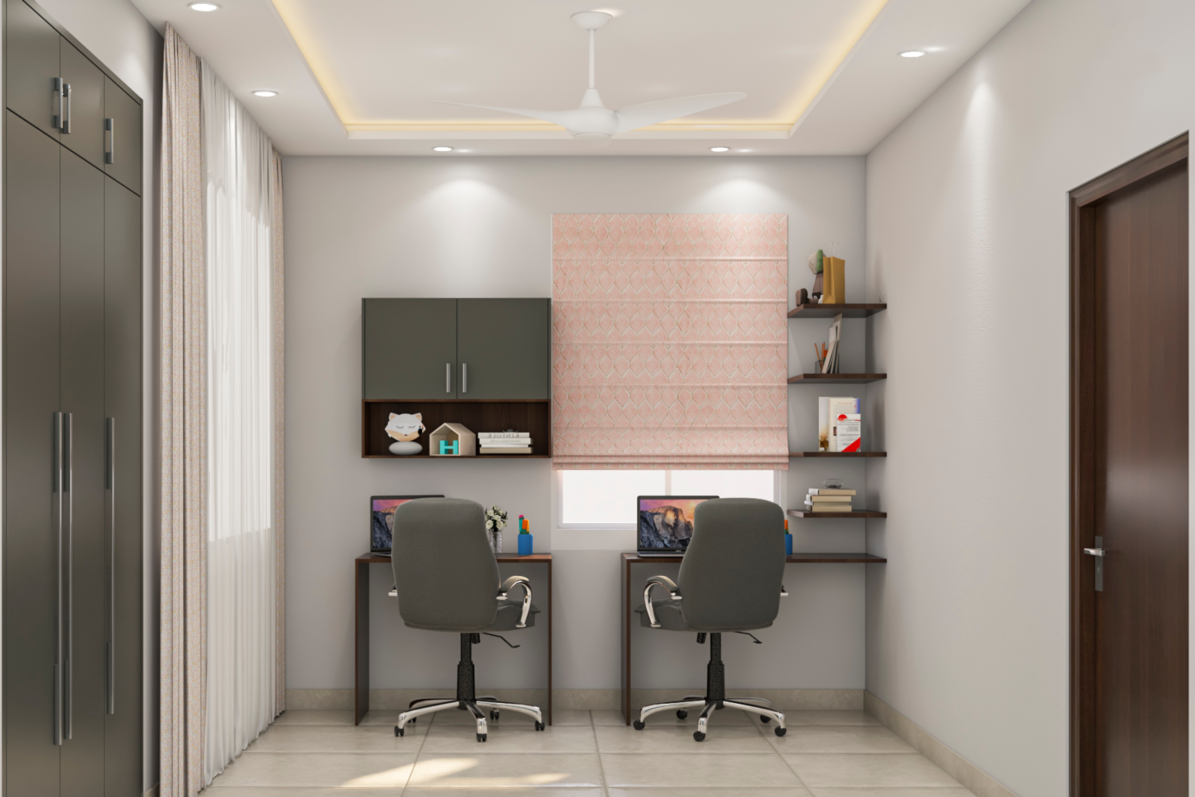 With a natural grey theme, this kid's bedroom design is a good choice. The multifunctional room includes a study unit and bunk bed, perfect for two children. This kid's bedroom has a false ceiling with integrated lighting.