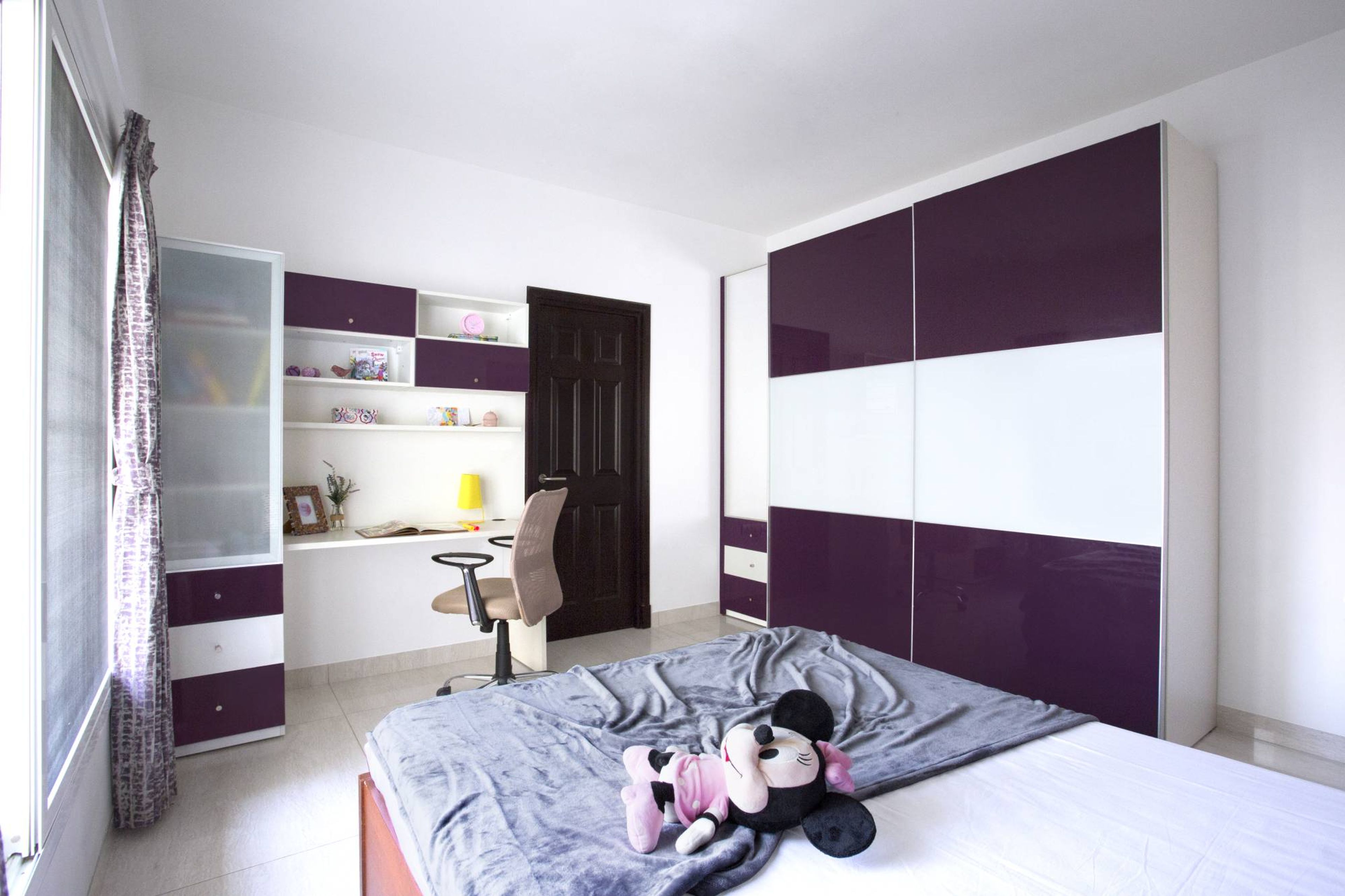 • Furniture Highlights: Wooden bed, Study unit and wardrobe with white and purple combination