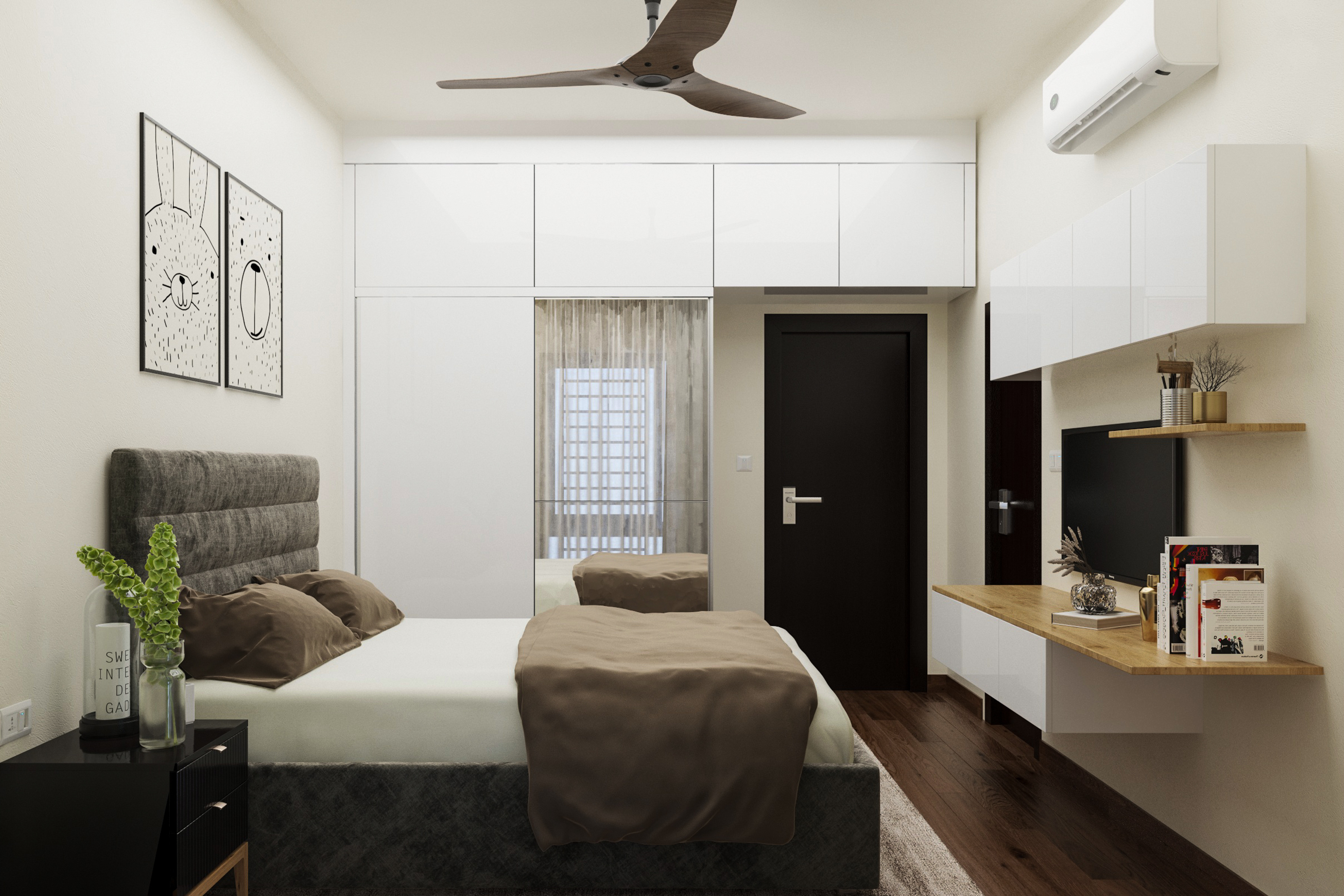 This black and white kid's bedroom design provides maximum utility and convenience. An upholstered grey bed with a headboard is warm and cosy for the kid to sleep in. The white sliding shutter wardrobe with mirror saves space and has sufficient storage with loft units. The TV unit with wall-mounted storage also blends well with the theme of the room.