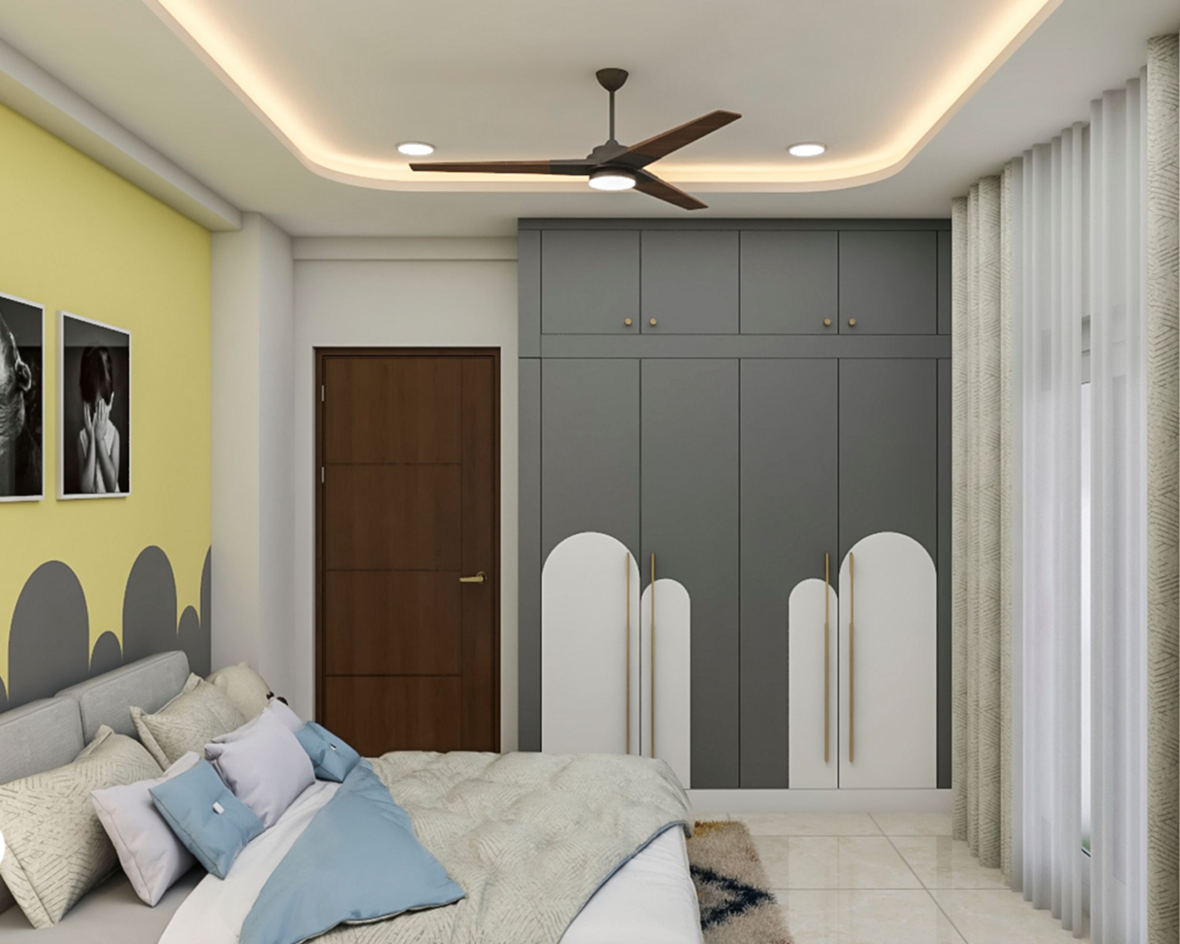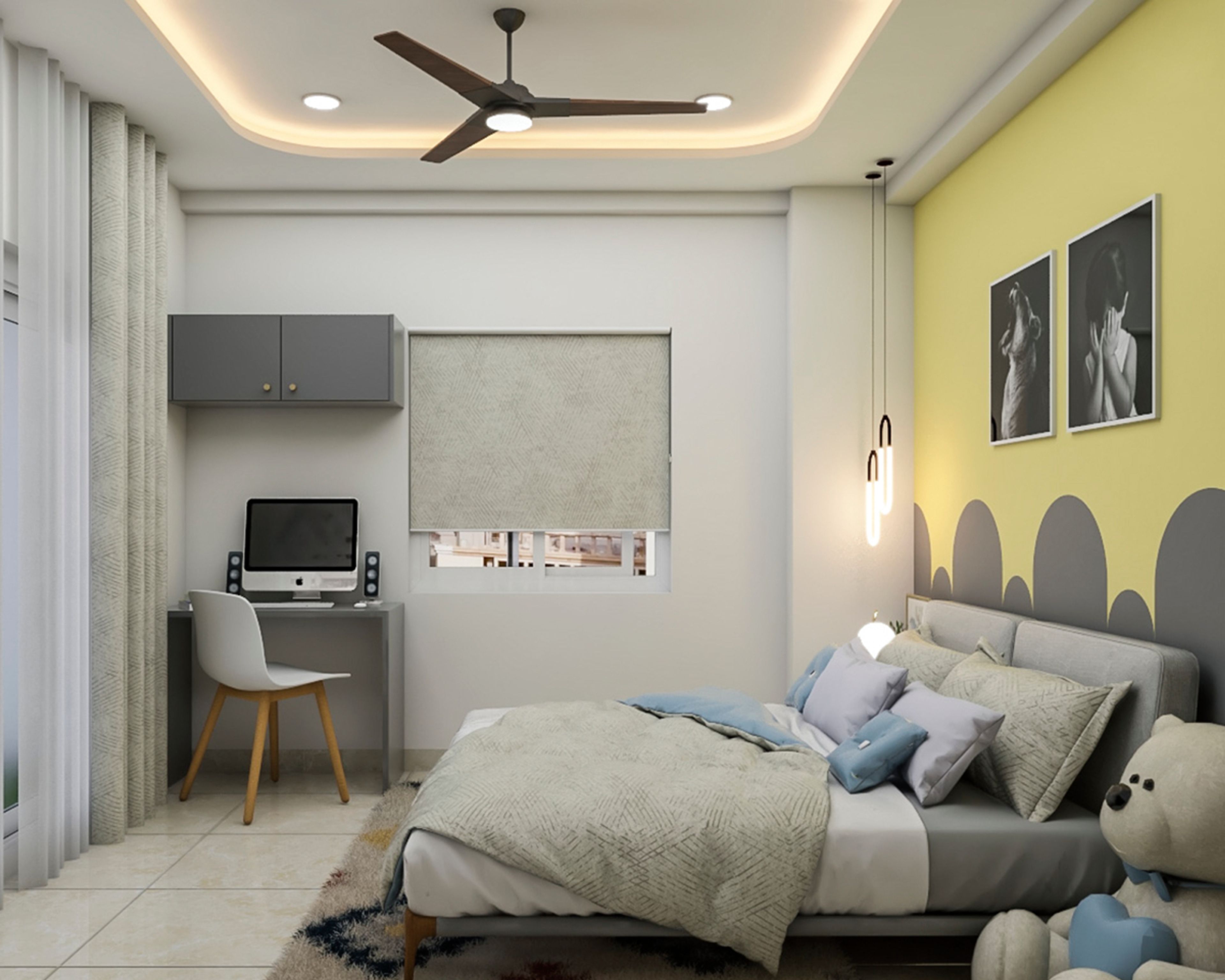The compact kid's room design with yellow and grey painted accent wall looks appealing. The wardrobe with a dual tone of grey and white shutters and gold handles looks dapper. The study unit with a grey table and overhead storage look functional and beautiful.