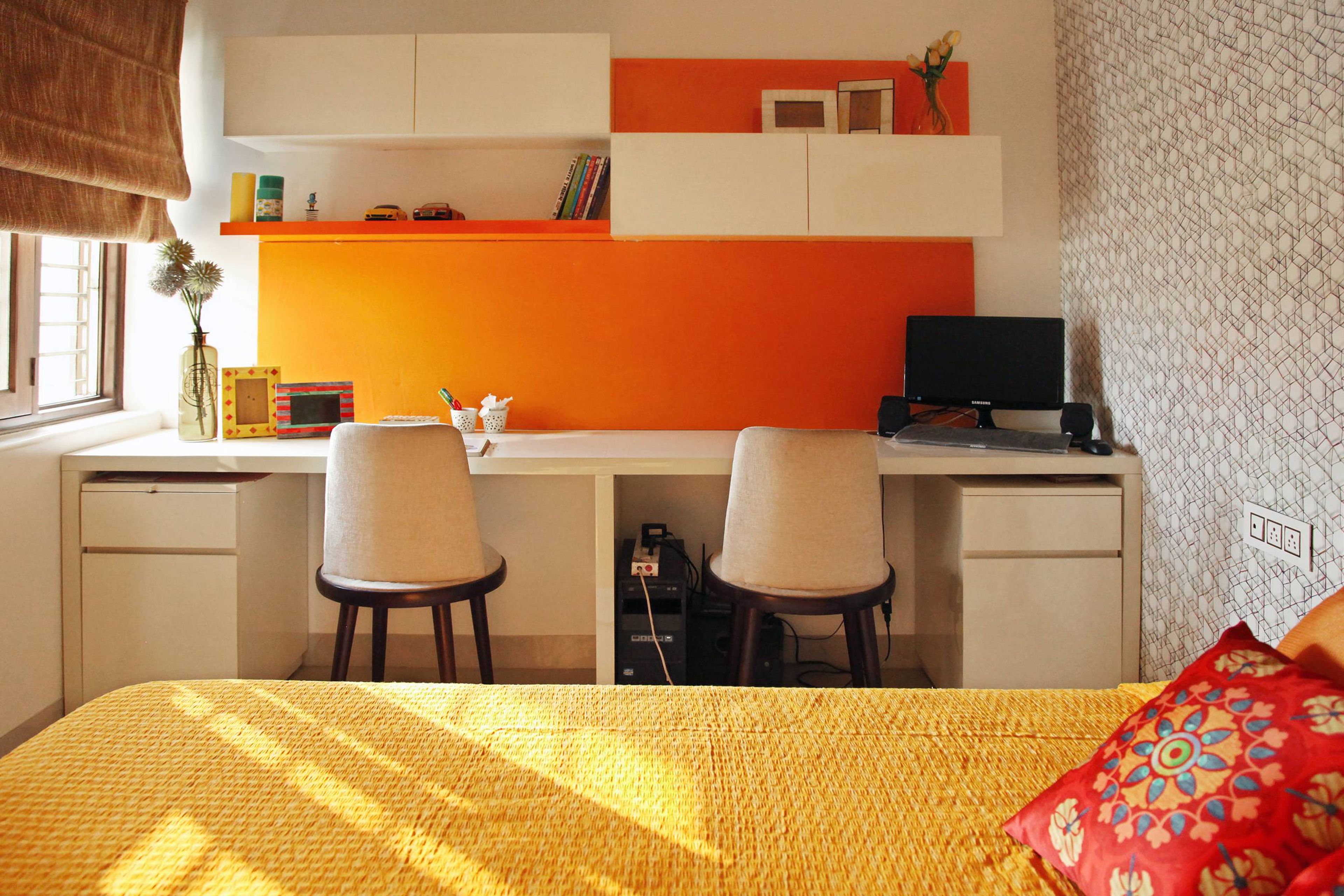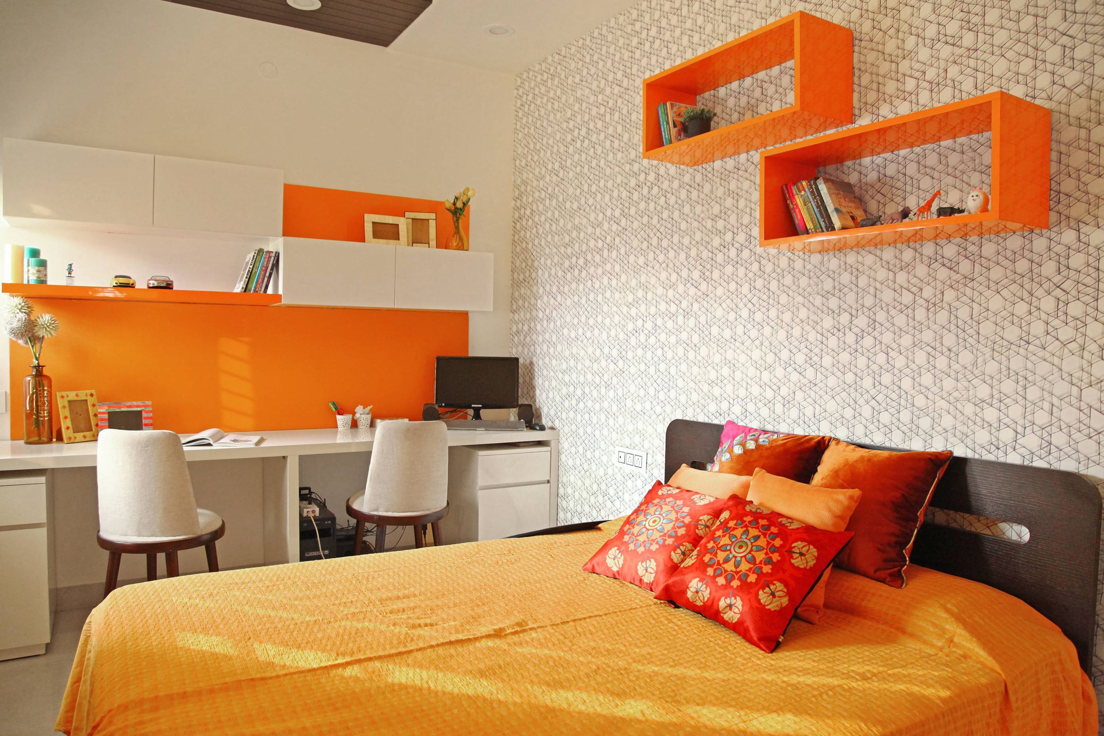 • Room Highlights: Orange shade and the white linen adds an elegant touch to the kid's room