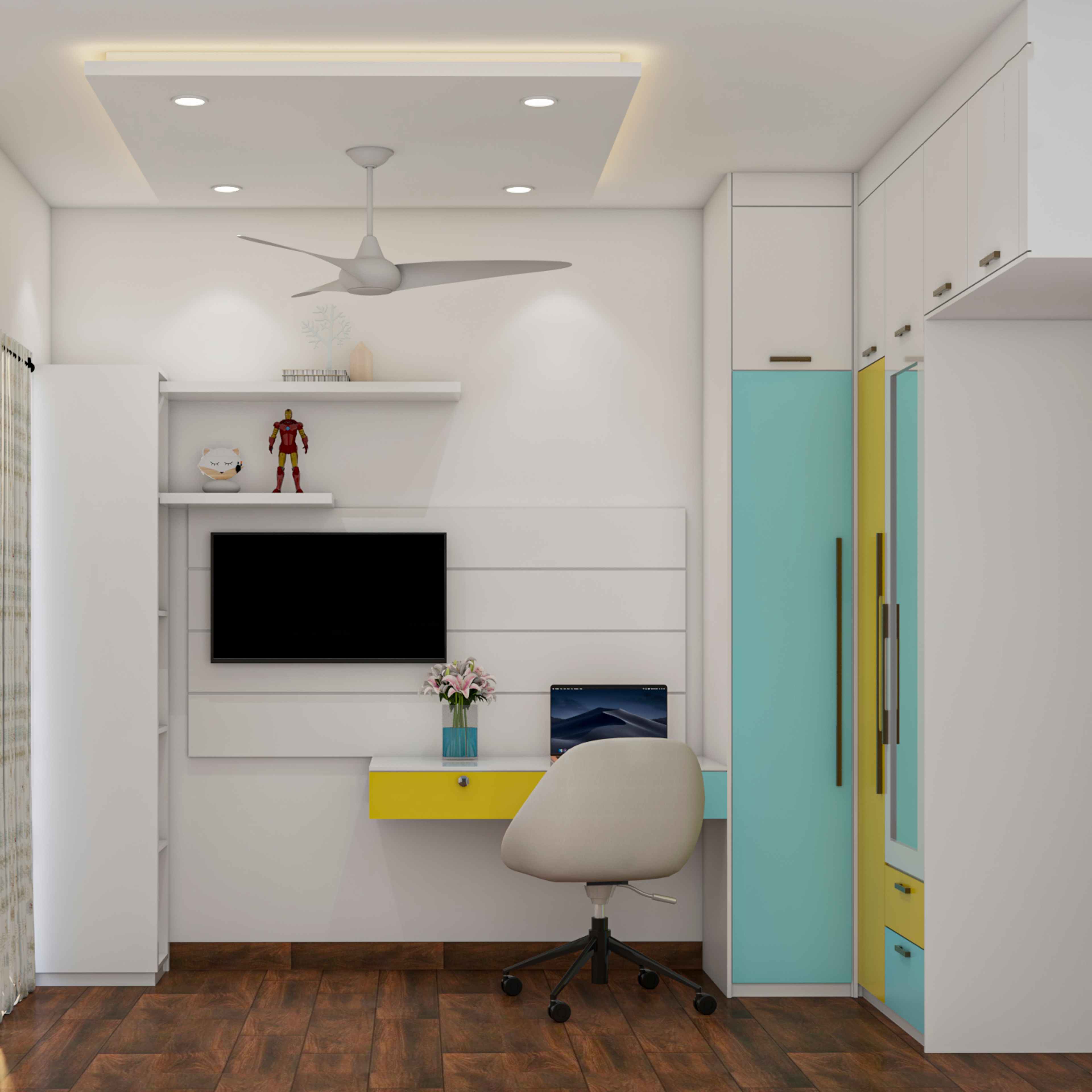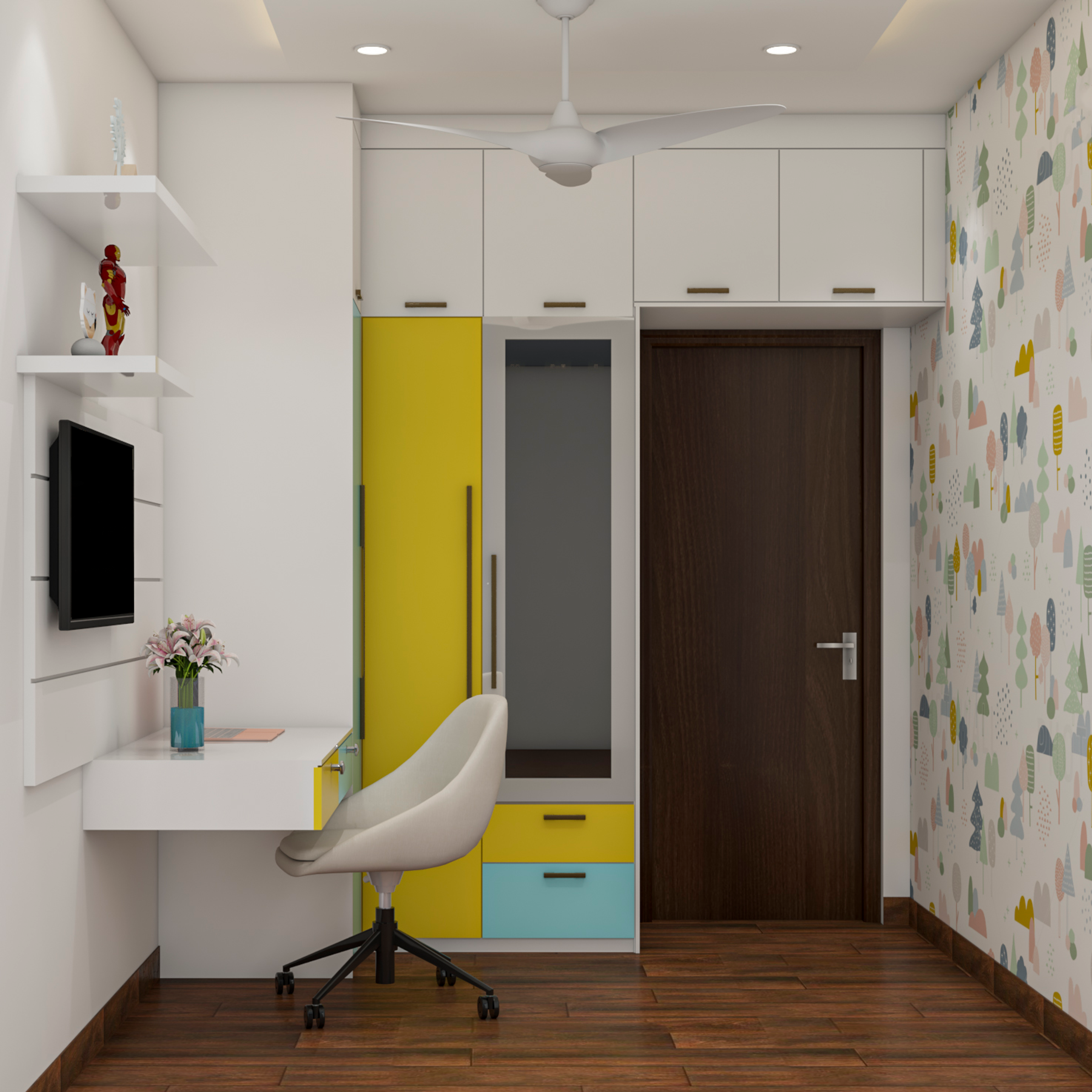 This colourful kid's bedroom with a combination of blue and yellow looks cheerful and attractive. The patterned wallpaper with a winter theme creates the right ambiance. The single white bed with storage below saves space and adds interest to the kid with multiple-shaped cushions. The study unit and the wardrobe along with the TV wall panel are also colourful and attractive with maximised storage.
