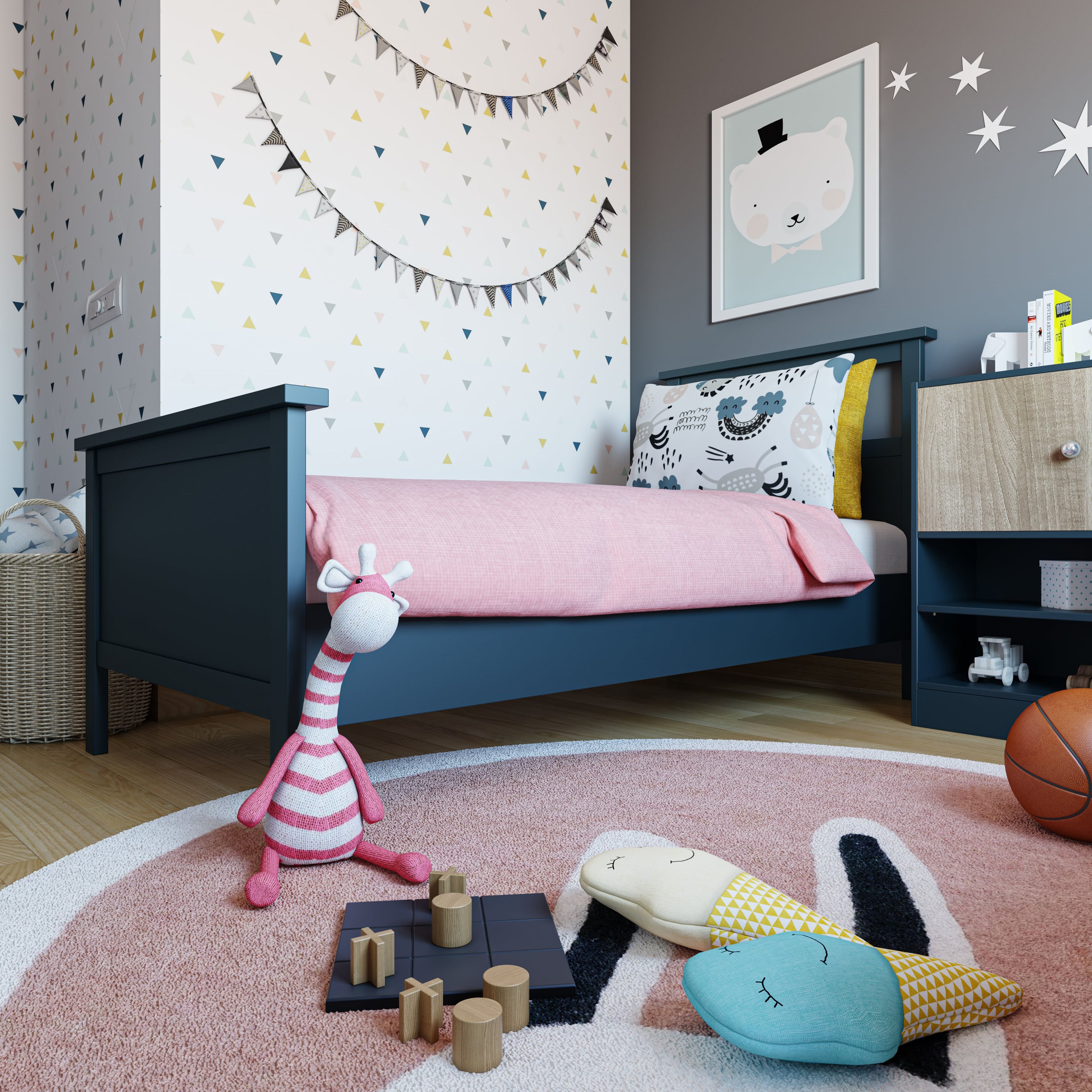 A modern kids' bedroom with spacious interiors. The twin bed has matching duvets. Various colours brighten up the space and a large window ensures ventilation. The wallpaper complements the painted accent wall. The small console table has open and closed space for storage.
