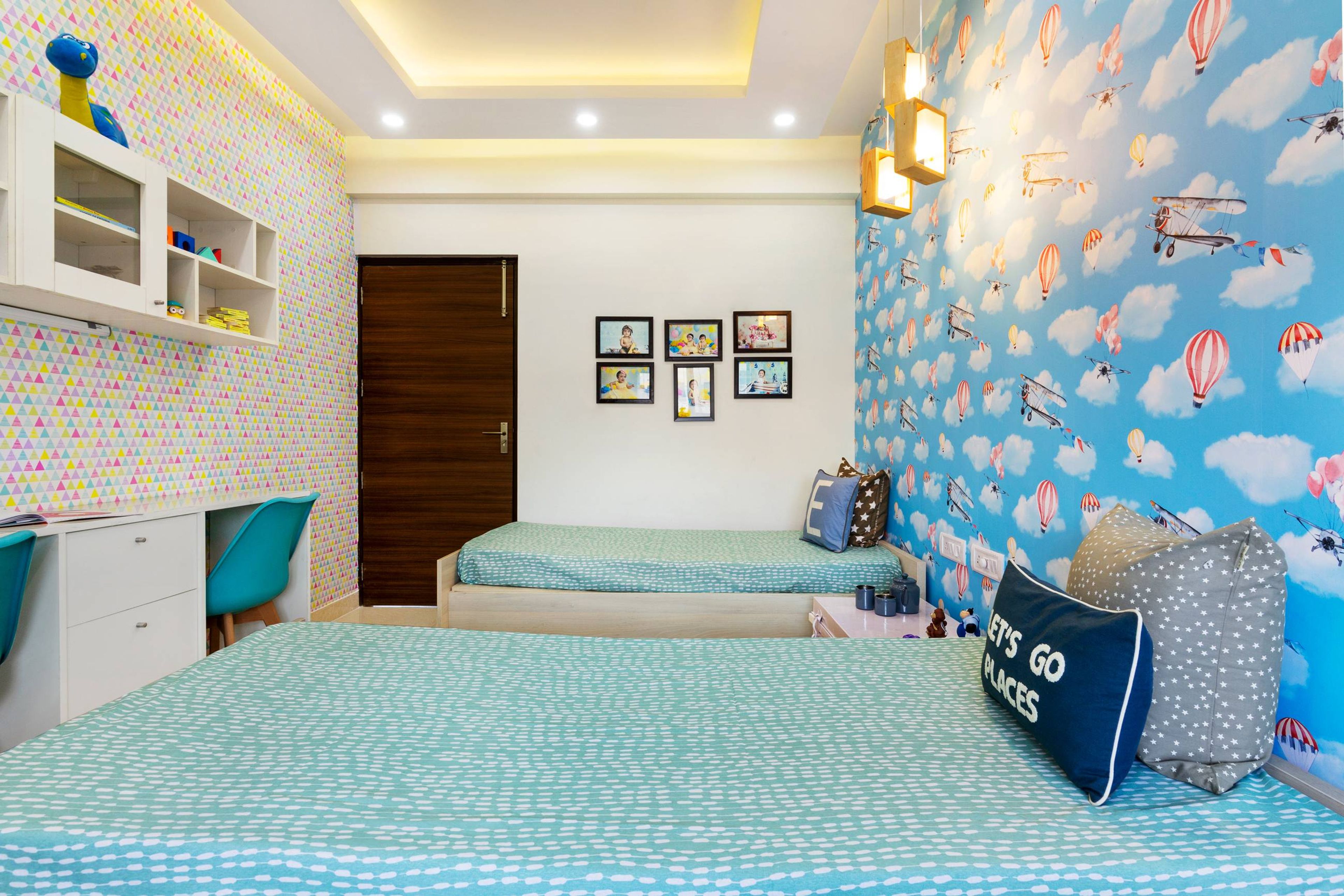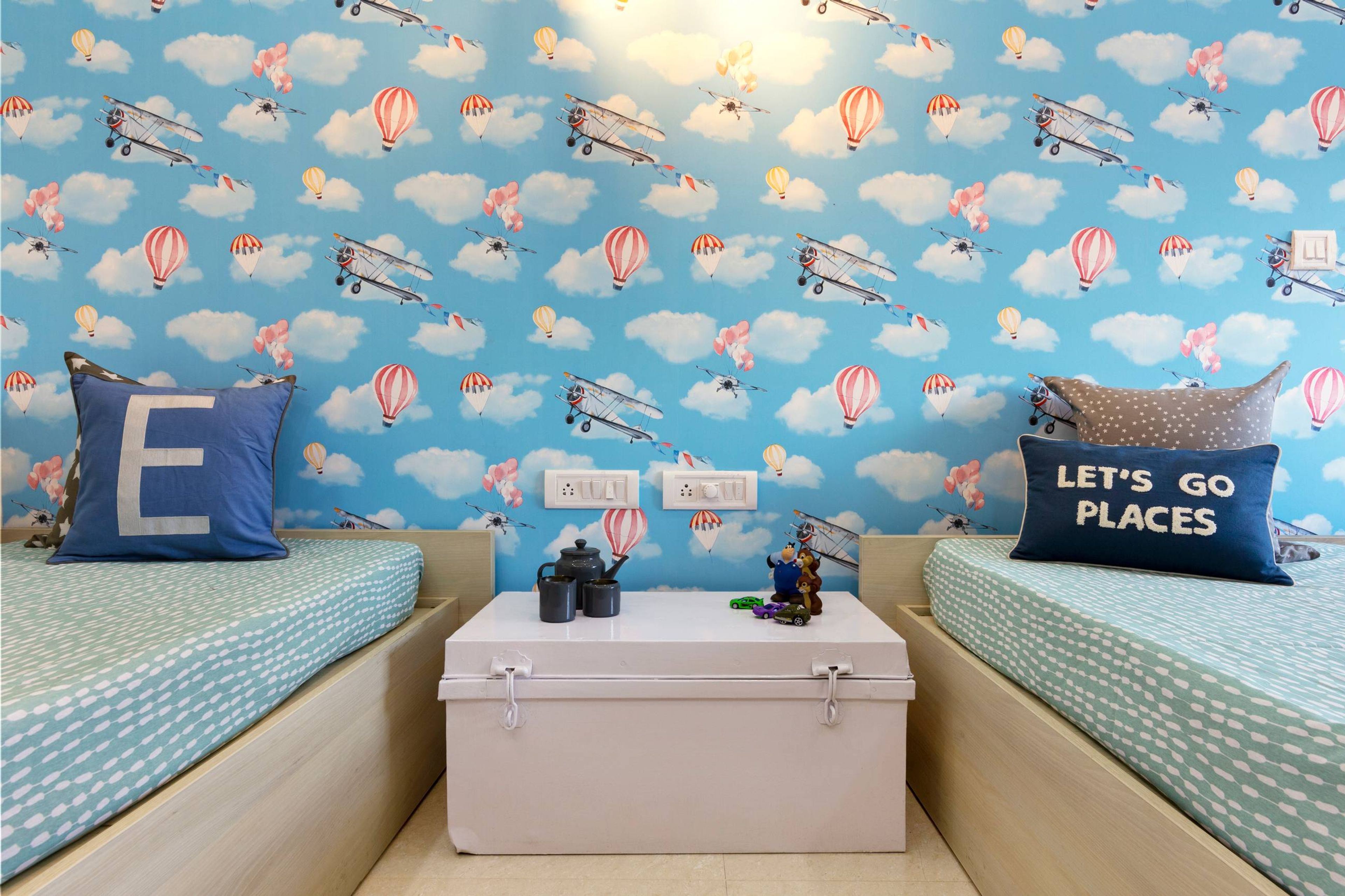 • Wall Features: Sky blue aircraft-themed wallpaper