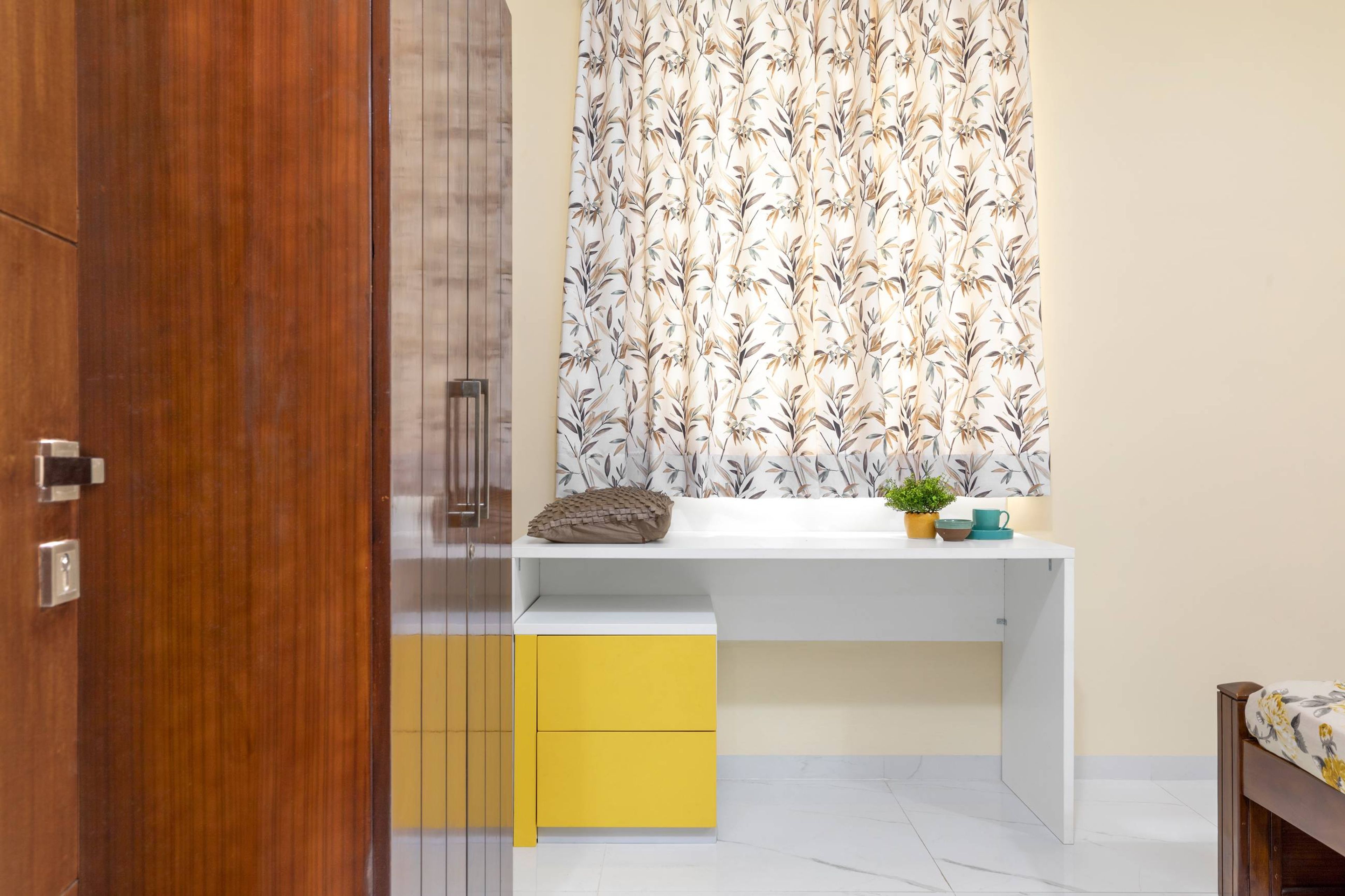 • Storage Features: White and yellow wardrobe with a tall unit on the side for open storage