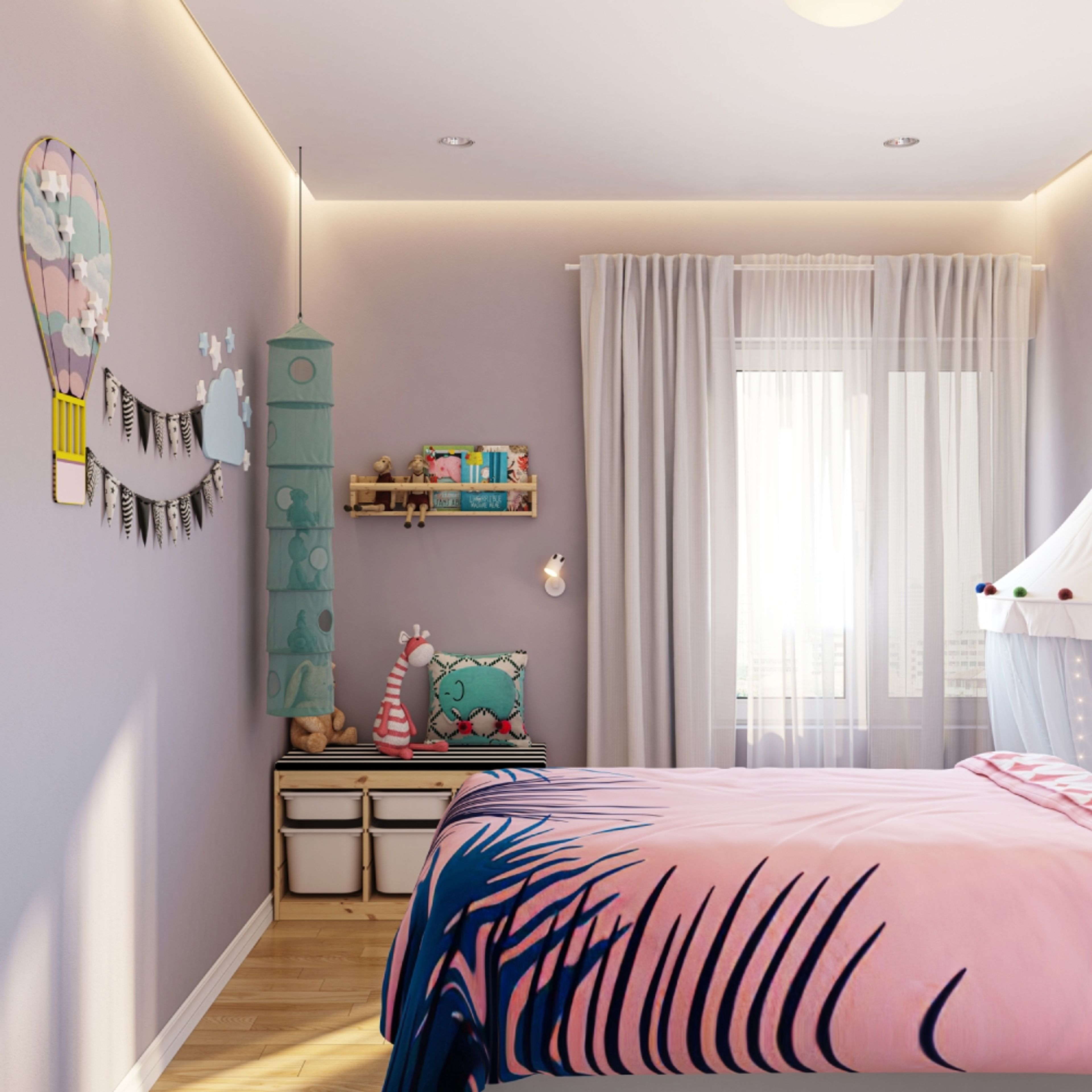 - Light grey wall paint with white open shelves and hot air balloon wall decor.