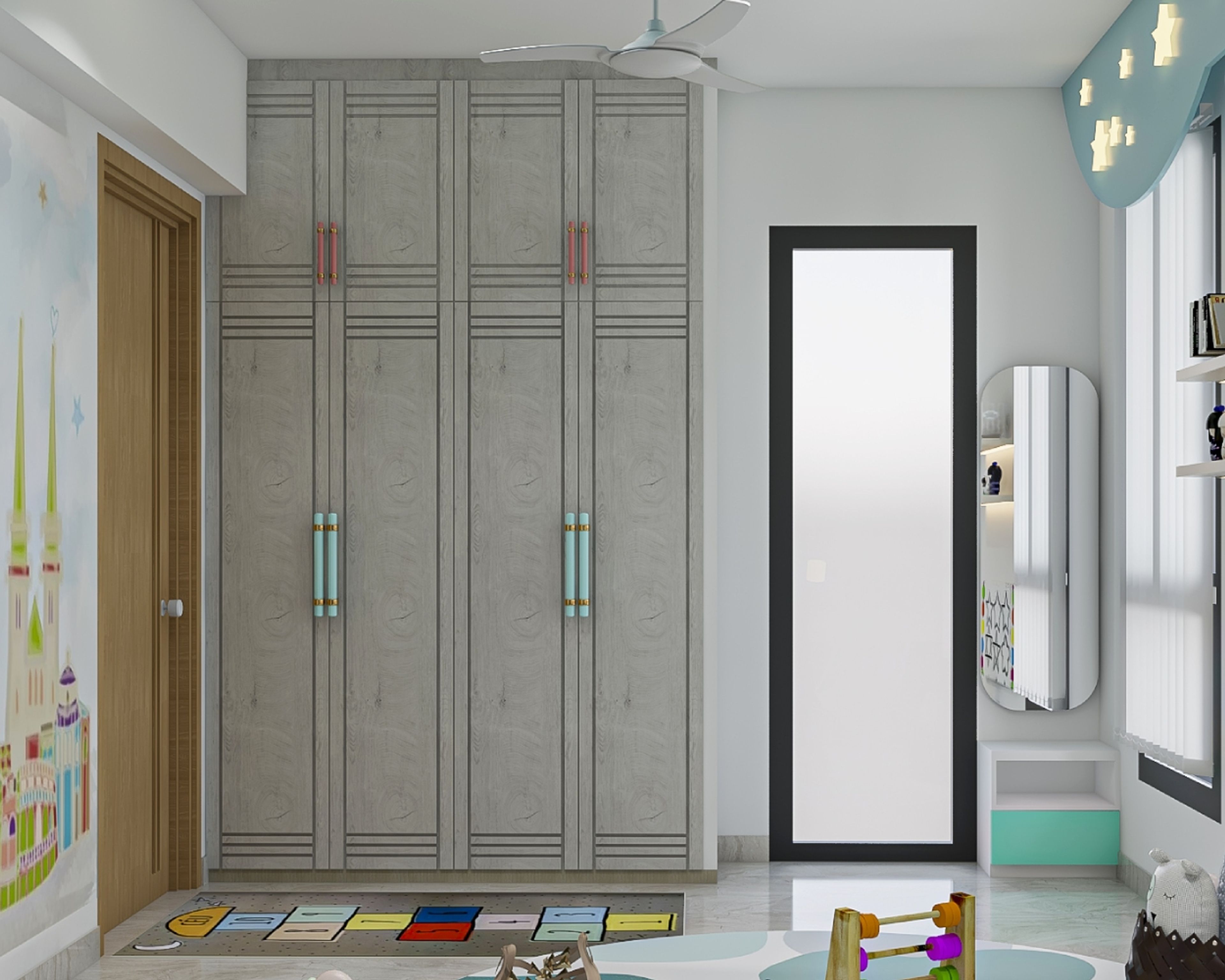 - Wardrobe with swinging shutters and loft units for extra storage.