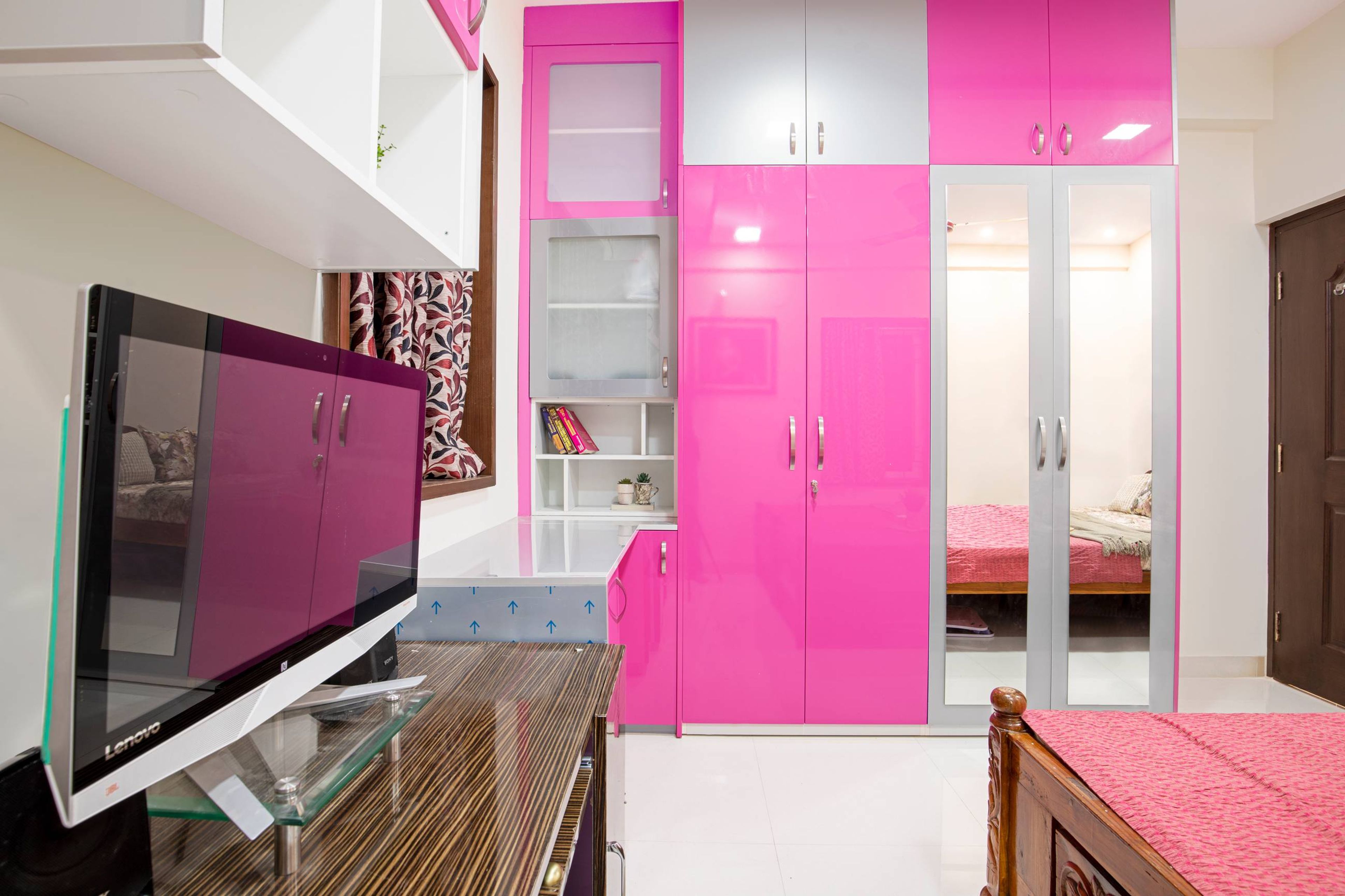 • Storage Features: Pink and white wardrobe along with a study finish of similar finish