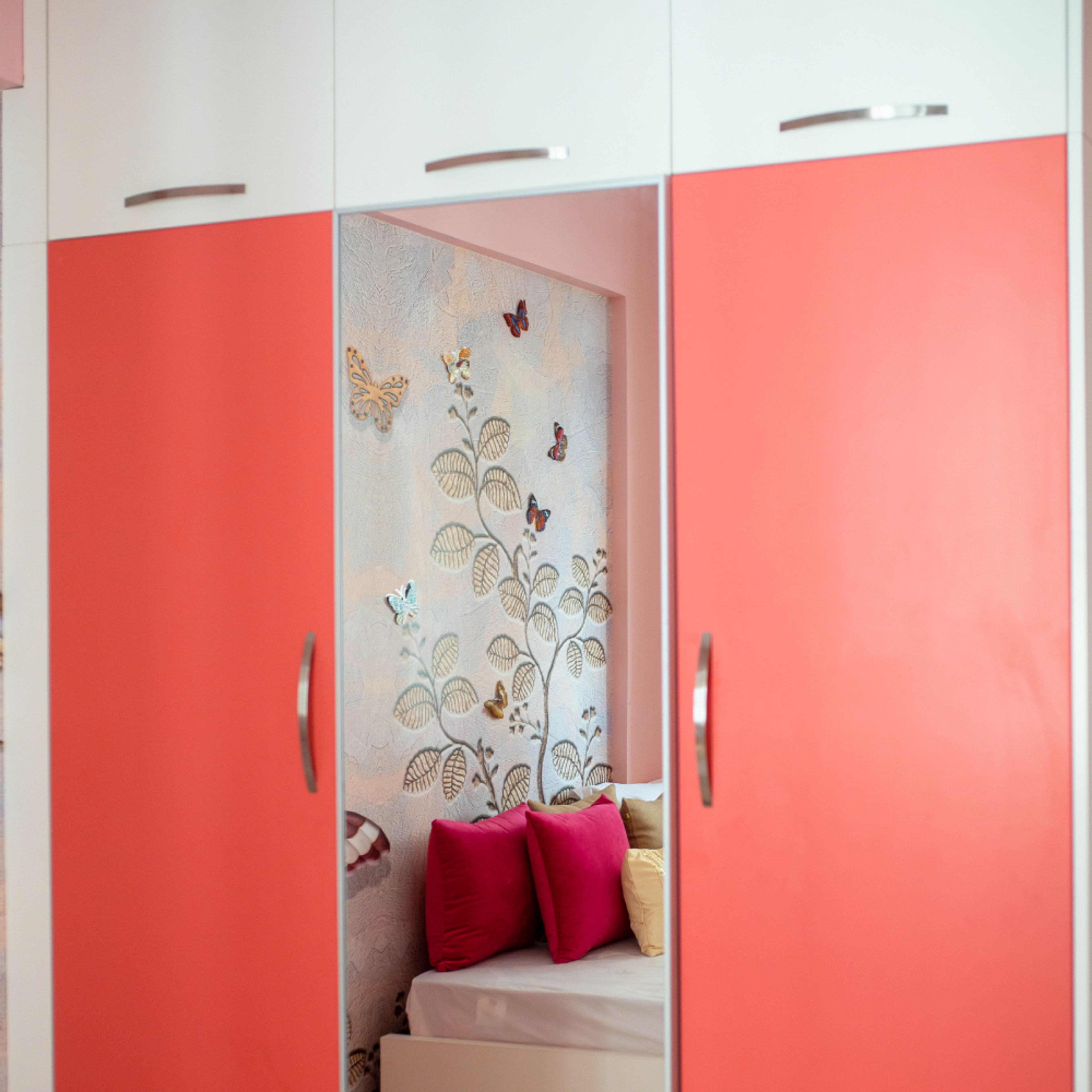 Clean Modern Kids Room Design For Girls With Pink Interiors using a soft, dry cloth or mild soap solution for laminate surfaces. Avoid harsh chemicals or abrasives. Livspace uses stain-resistant and scratch-proof finishes, ensuring easy upkeep even in high-activity kids’ spaces.
