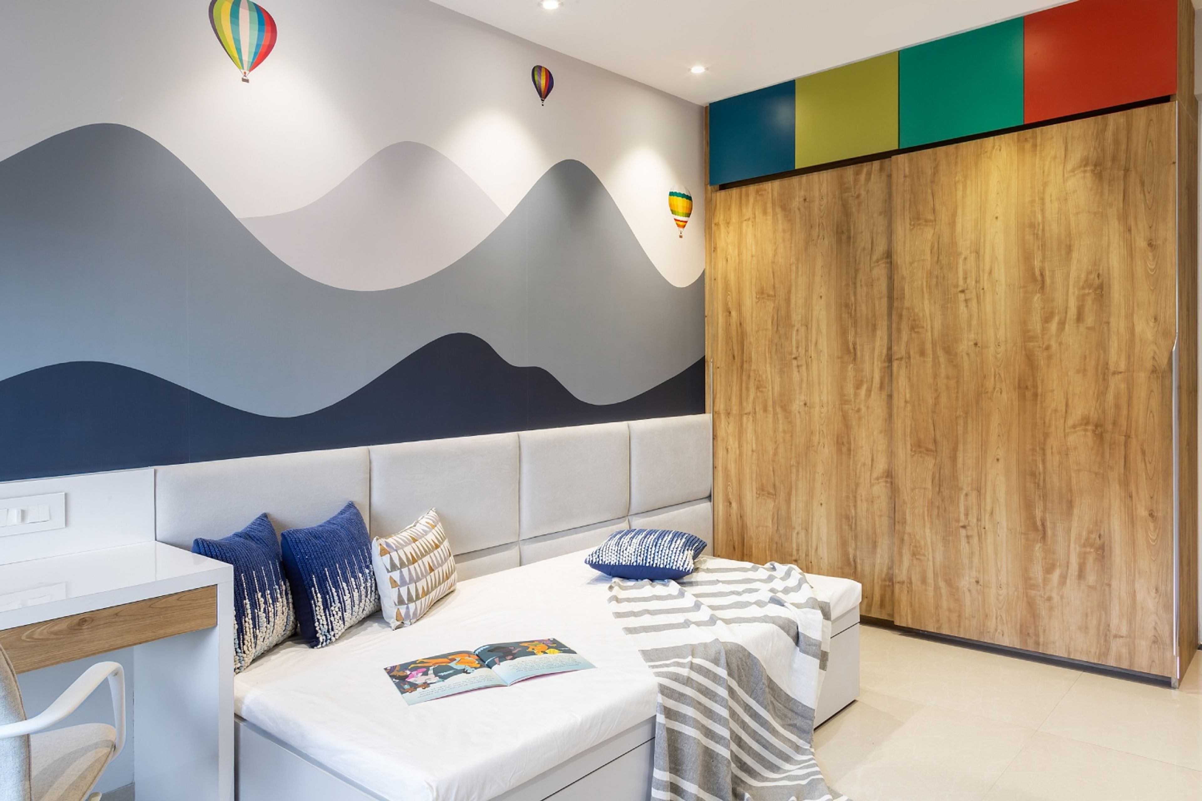 • Wall Features: Mountain and parachute-themed wall design
