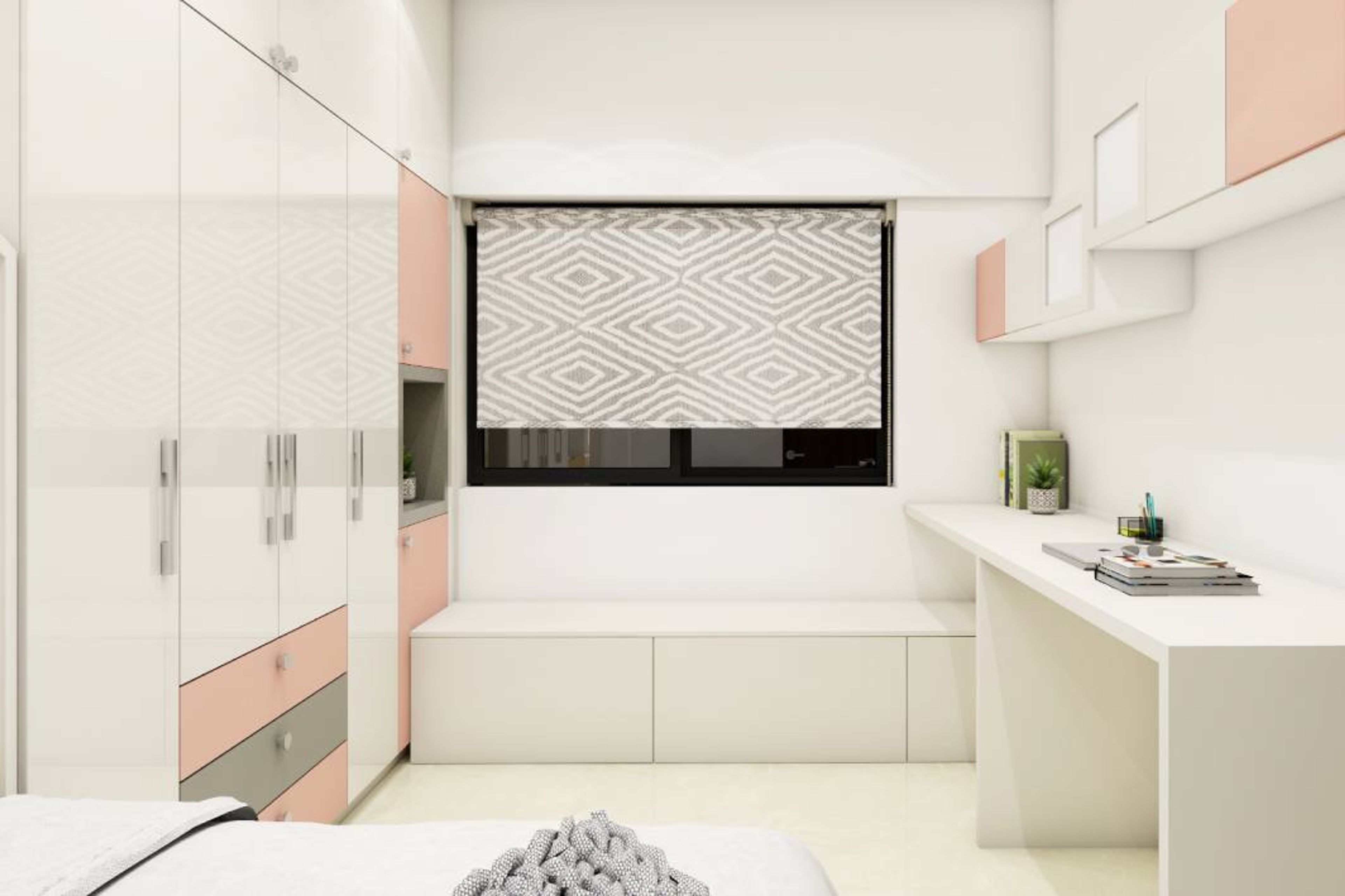 A modern compact kids' bedroom with a compact layout. The pink and white combination looks lovely. There is ample space for storage in the full-height wardrobe. This design is also easy to maintain.