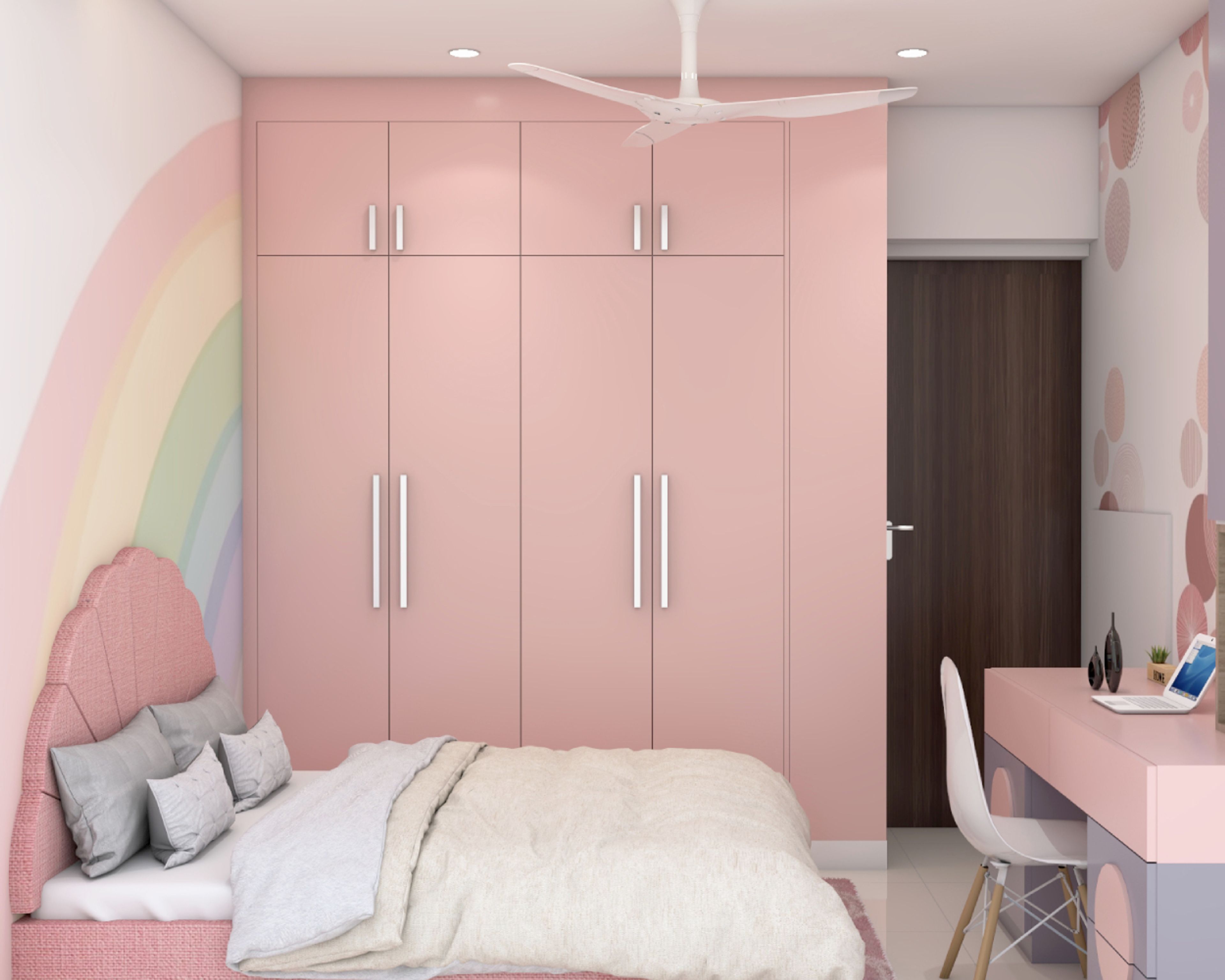 Clean Modern Pink Kids Room Design For Girls With Shell-Shaped Headboard using a soft, dry cloth or mild soap solution for laminate surfaces. Avoid harsh chemicals or abrasives. Livspace uses stain-resistant and scratch-proof finishes, ensuring easy upkeep even in high-activity kids’ spaces.