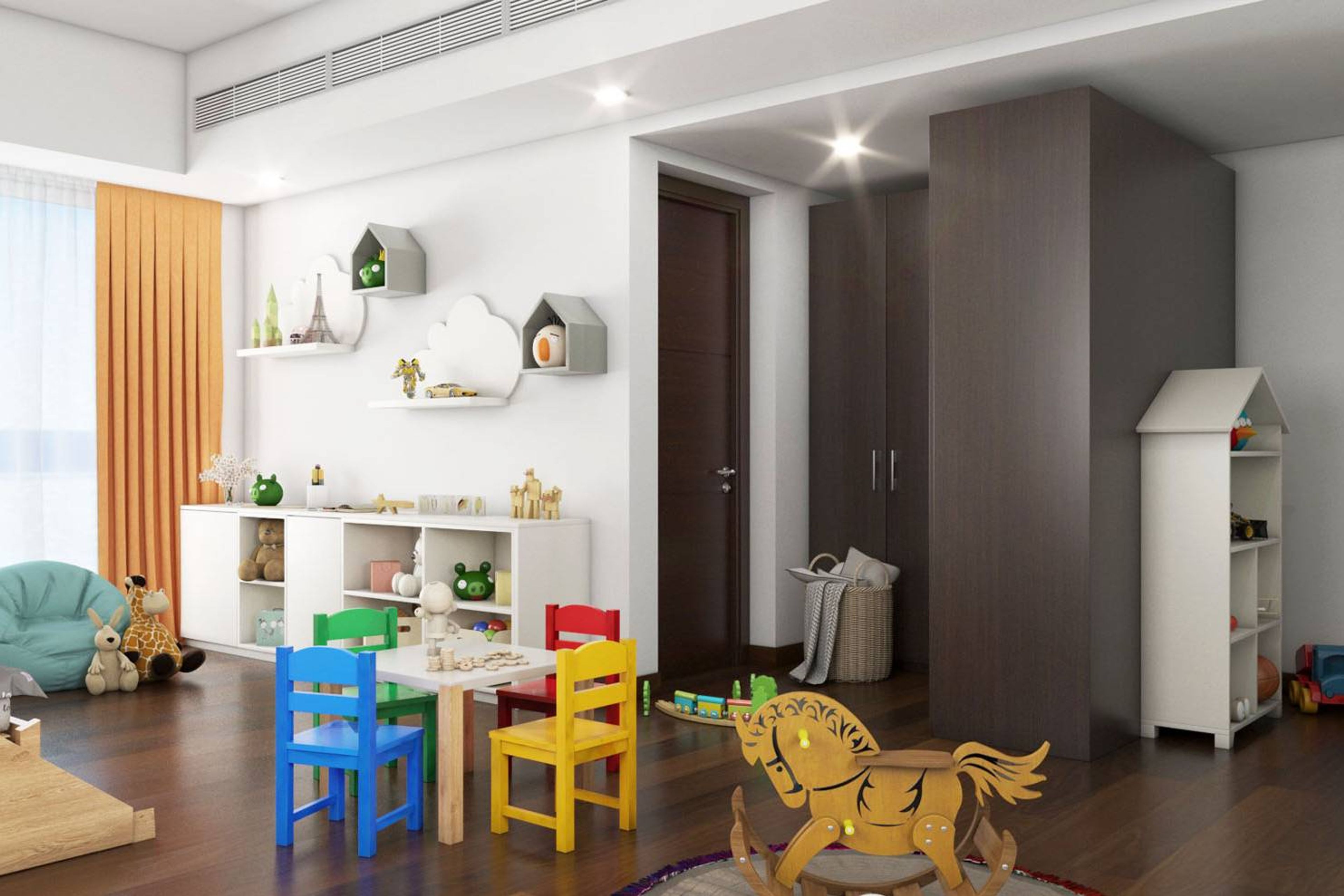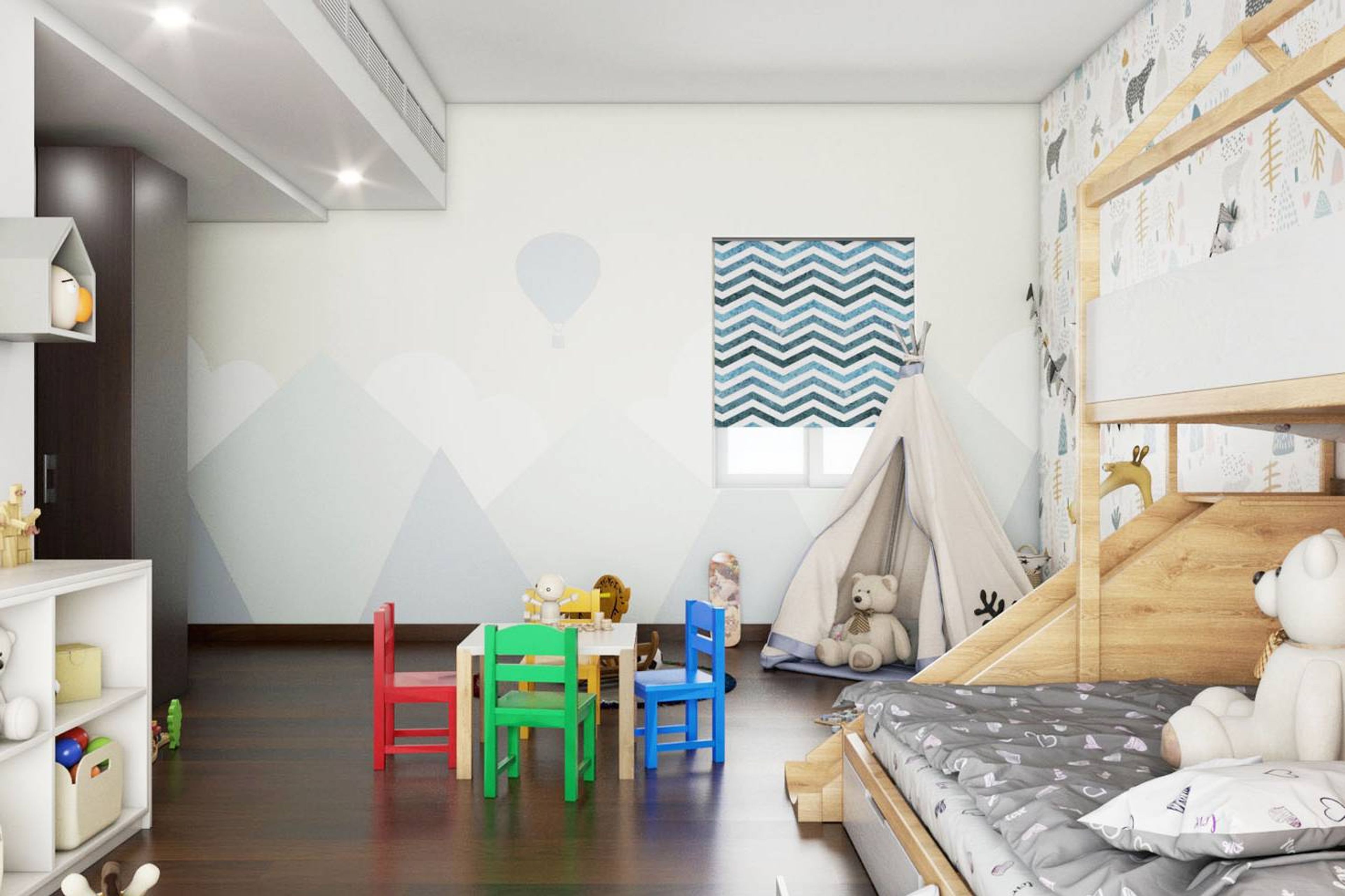 This kid's bedroom design is perfect for young boys with its contemporary wooden bunk bed. A forest-themed wallpaper graces the walls, making it visually appealing against the wooden bed. This kid's bedroom design idea also features an L-shaped wardrobe along with other storage units, making the space functional.