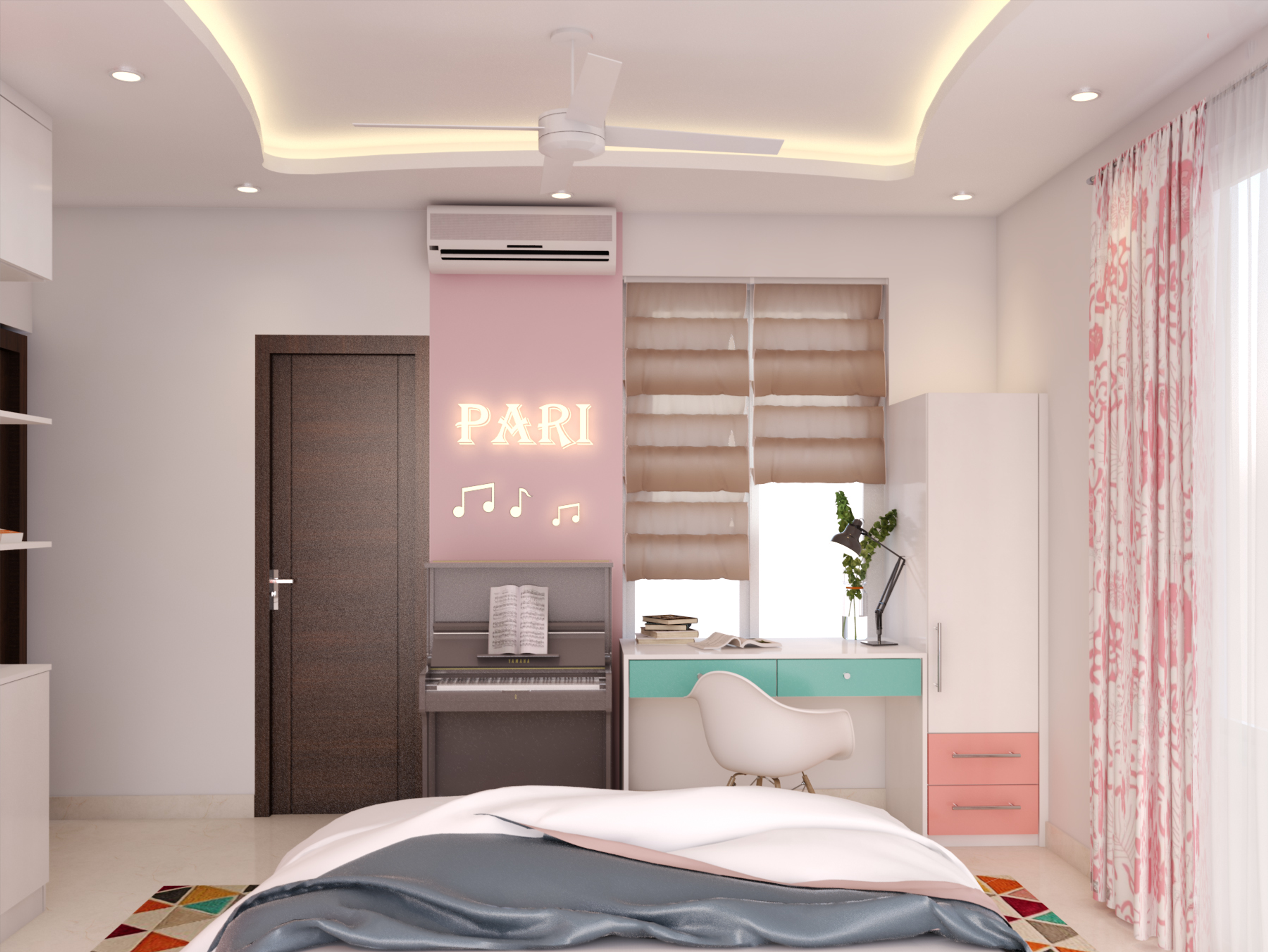 A pink-themed kids' bedroom with modern interiors. The study area and the wardrobe fit well within the given space and the circulation space for the user makes it easy to do things. The pink and grey shades bring life to this space. The shelves provide a good amount of space for storage.