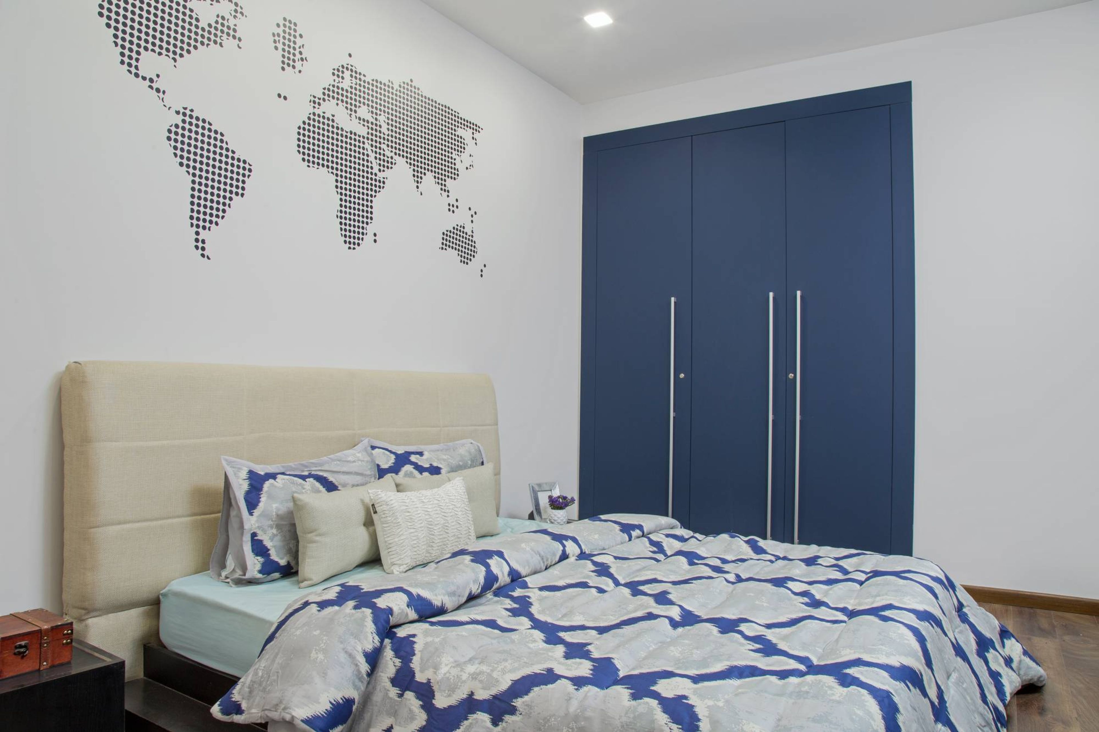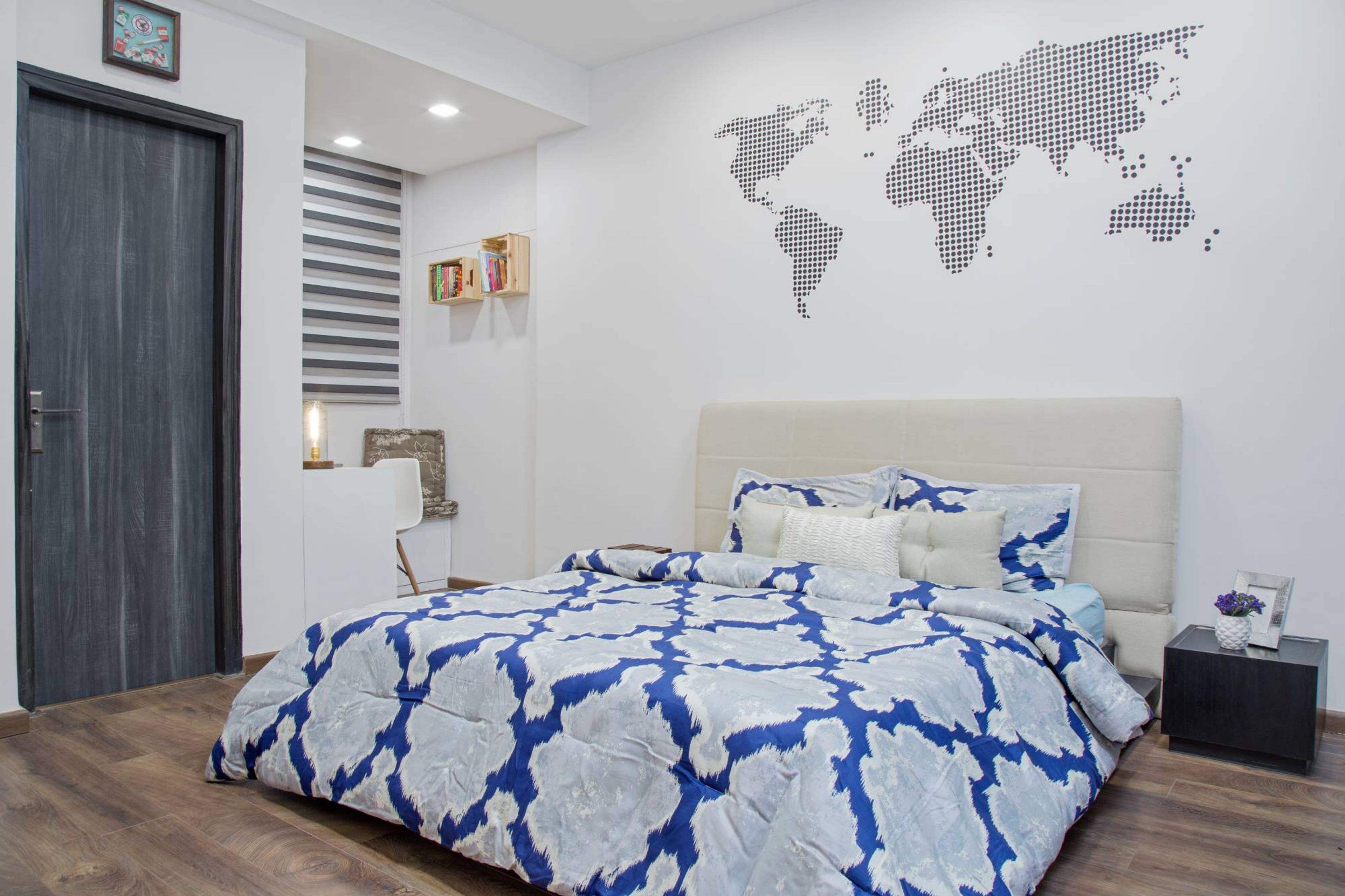 • Wall Features: world map art on the wall