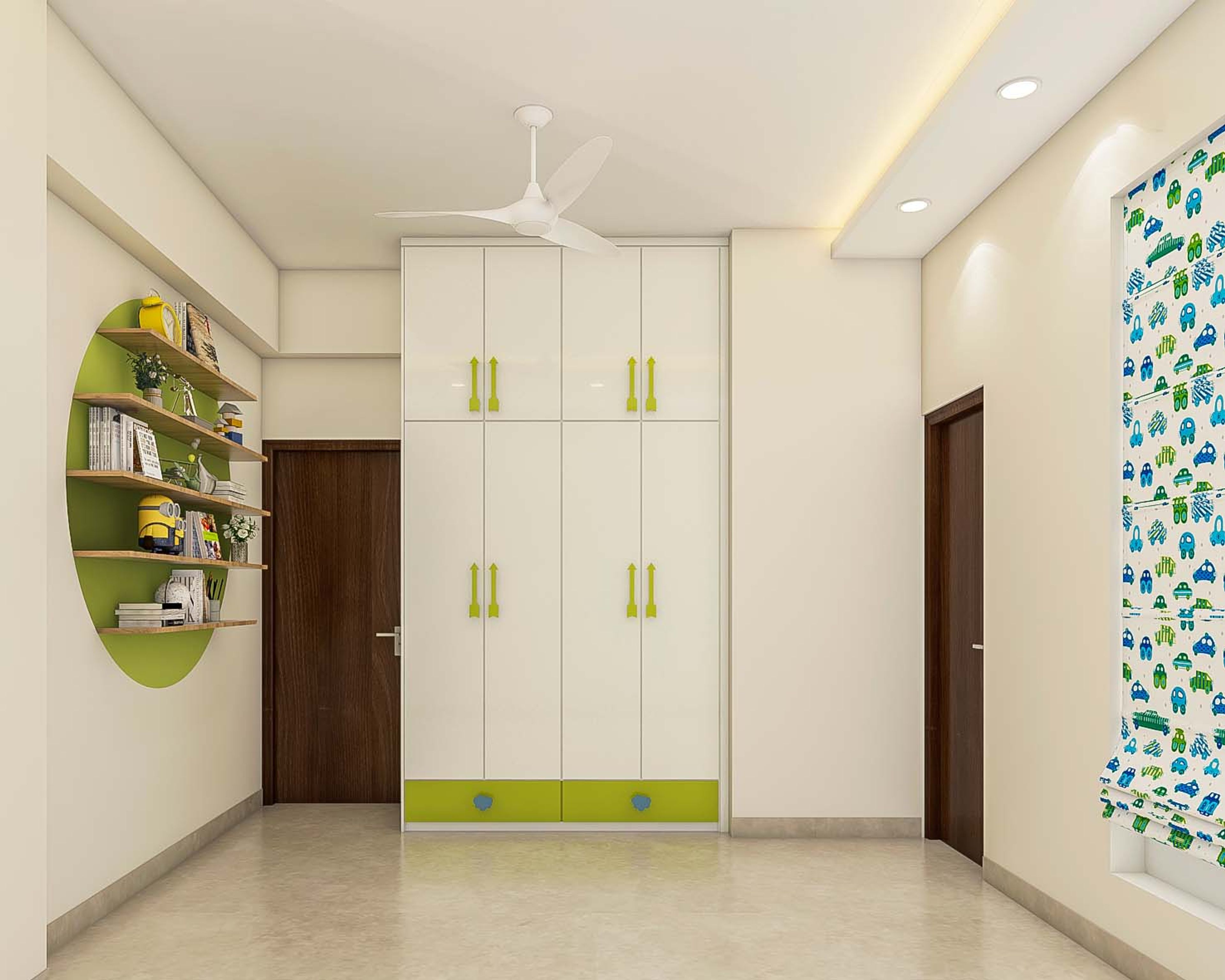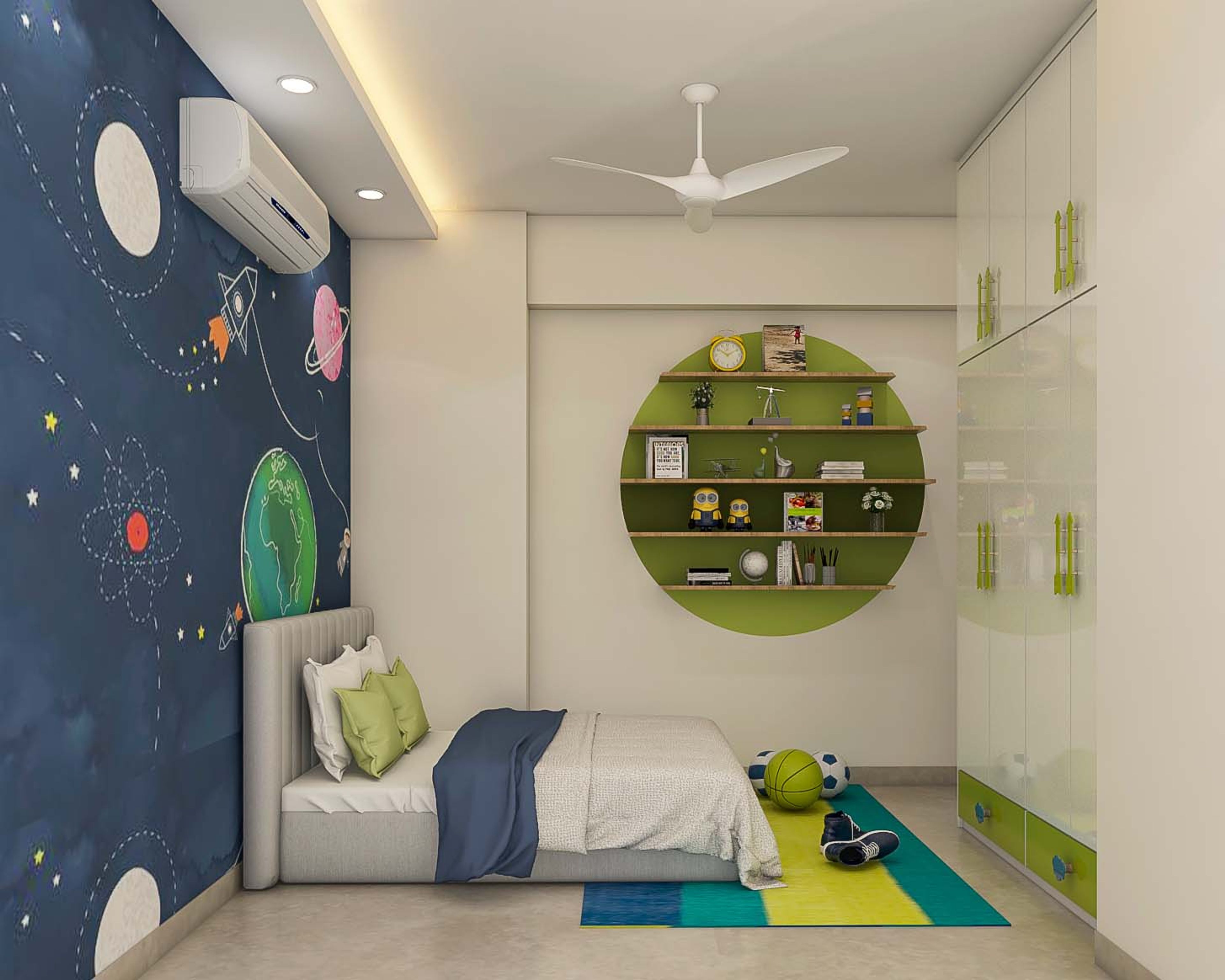Perfect for little kids interested in outer space, this bedroom design has an accent wall styled with a space theme. The design plays with green in the form of the background for the shelves and on the cabinet shutters. The multifunctional space comes with a study unit. This room is spacious with a play area that is defined by the addition of a colourful rug.