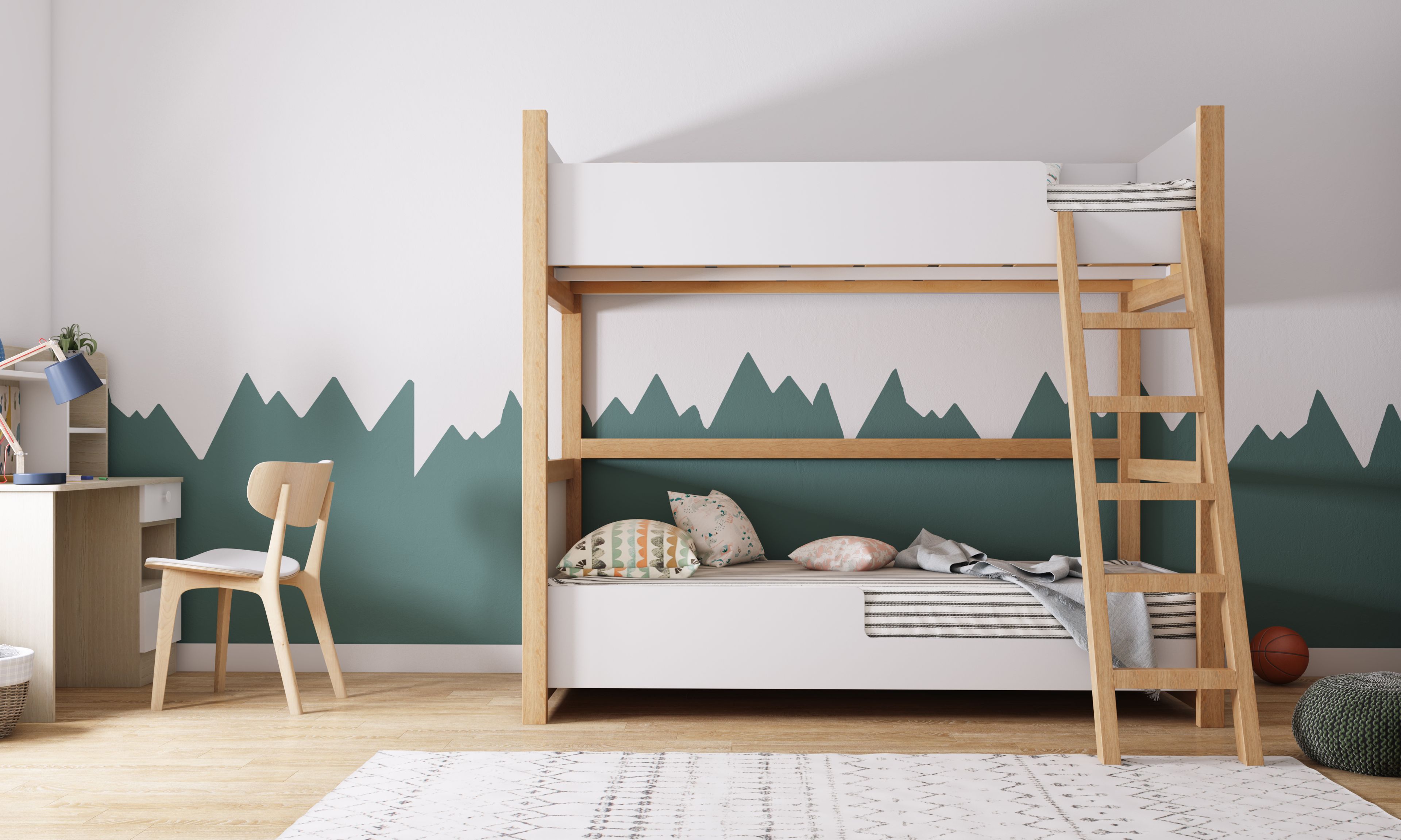 Featuring a grassy green accent wall and furniture with Scandinavian lines, this kids bedroom is minimal yet cheery. The bunk bed is discreet but designed keeping safety and space constraints in mind. The adjacent study table features pops of white and is flanked by a modern chair that complements the flooring.