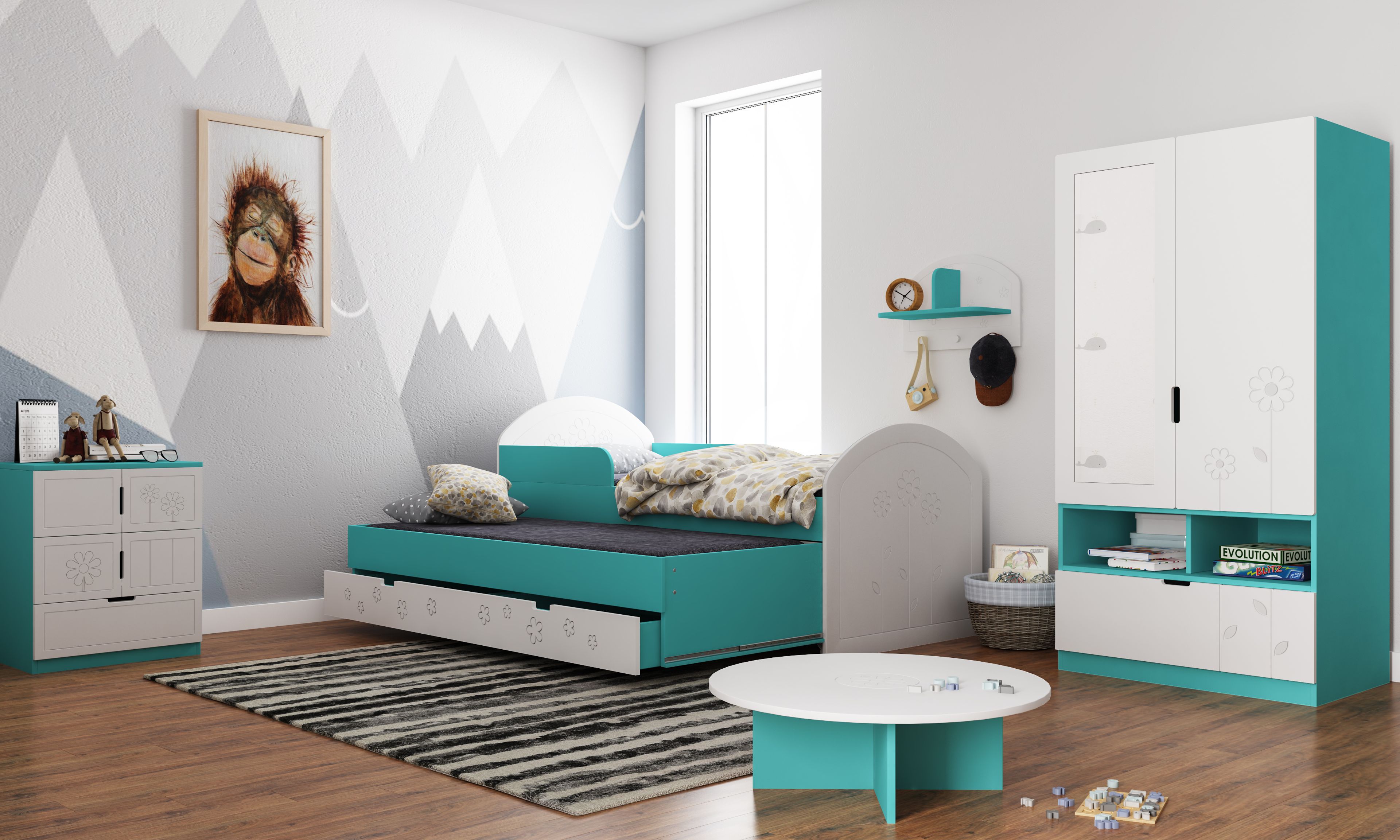 This kids bedroom is pleasant in a white-and-teal colour palette. The trundle bed, with delicate flower etching and safety panels, is the focal point of the space. It's complemented by a two-door wardrobe, matching sideboard and play table.