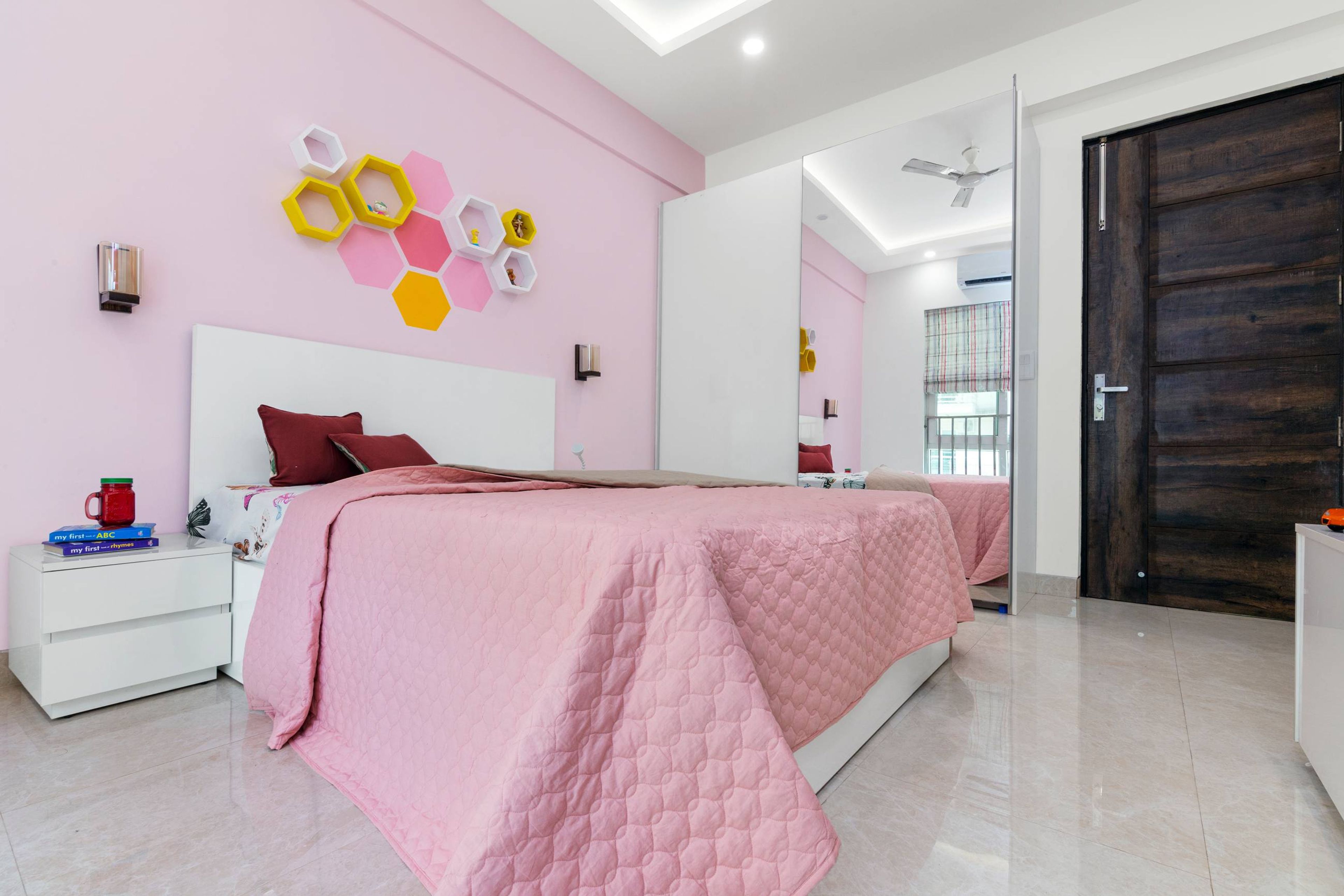 • Room Highlights: Accent wall treated with the pink wall paint which goes well with the bedding fabric