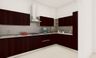 This stylish L shaped kitchen makes optimal use of corner space with smart design. A state of the art chimney and elegant storage solutions make for a fully functional, efficient kitchen.A glossy aluminium backsplash and mahogany laminates on all the cabinets lend a chic touch.