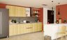 Set in a compact L shaped layout, open shelves, overhead cabinets and pull outs provide effective storage for all essentials.